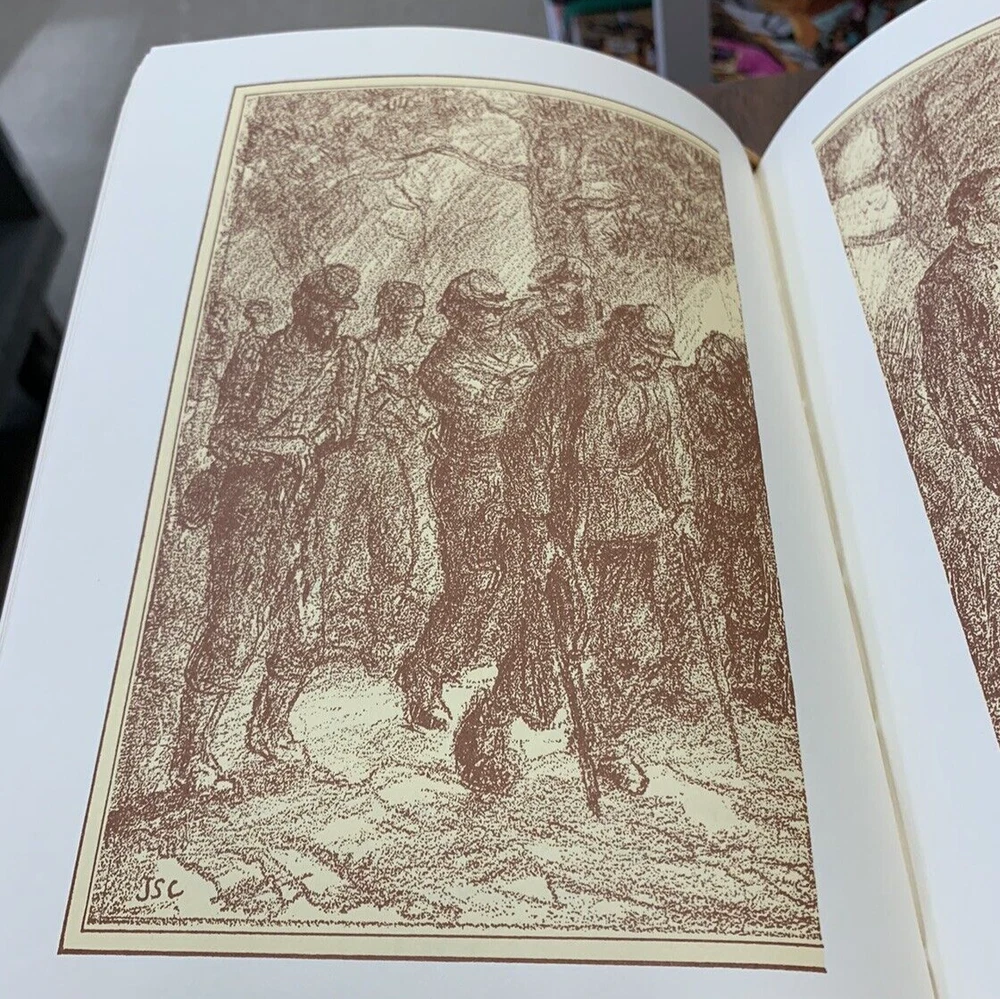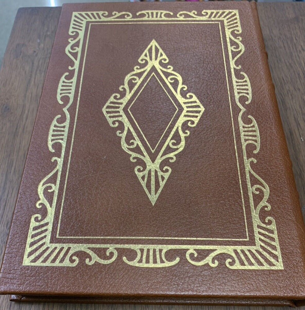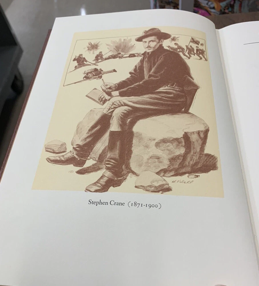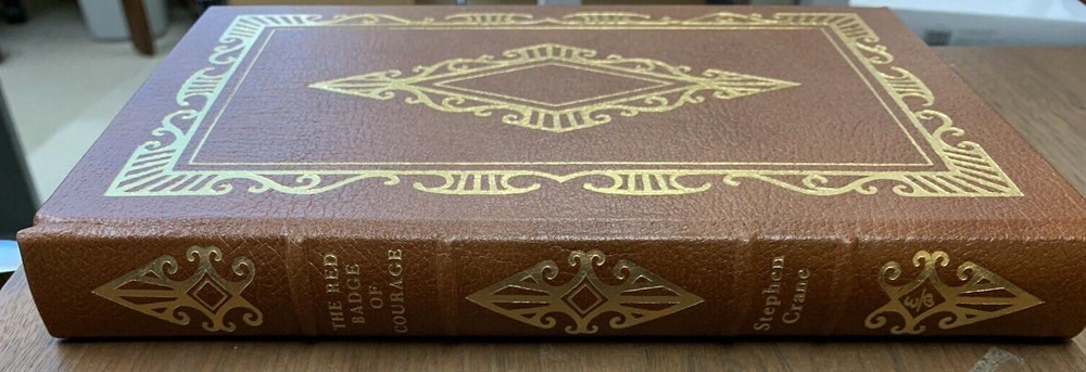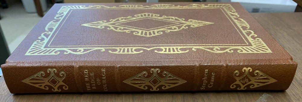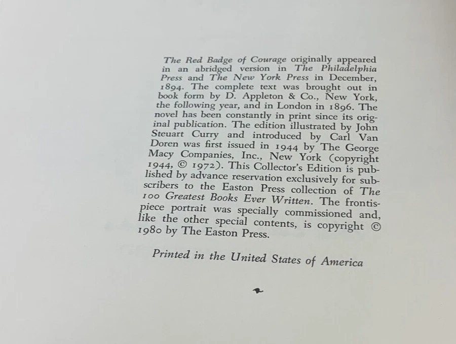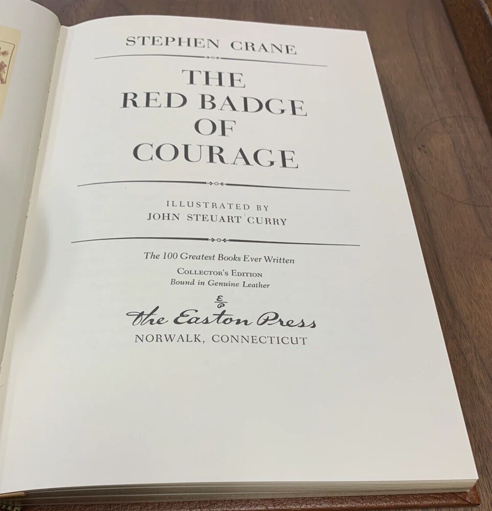 The Red Badge of Courage by Stephen Crane Illustrated by John Steuart Curry Published in 1980 by Easton Press Collector's Edition. 100 Greatest Books Ever Written. Near fine condition with minimal wear. Tight, square and unmarked. See photos. Bound in genuine leather. Moire endpapers, satin ribbon bookmark, gilded lettering on spine and embossing on front and back covers. Gilded side of pages. br