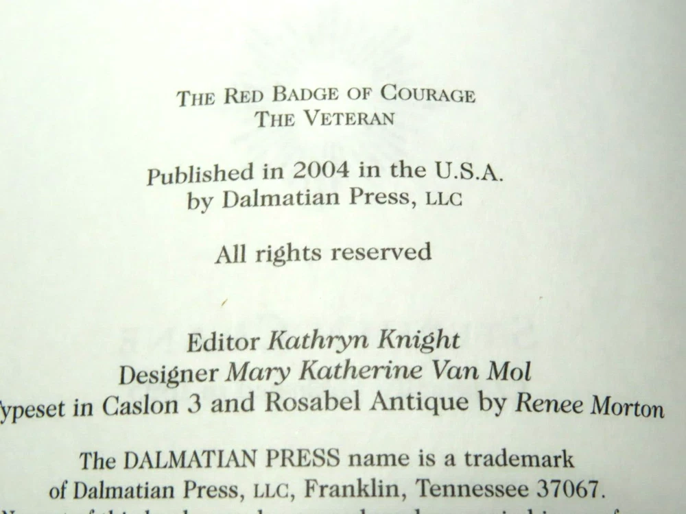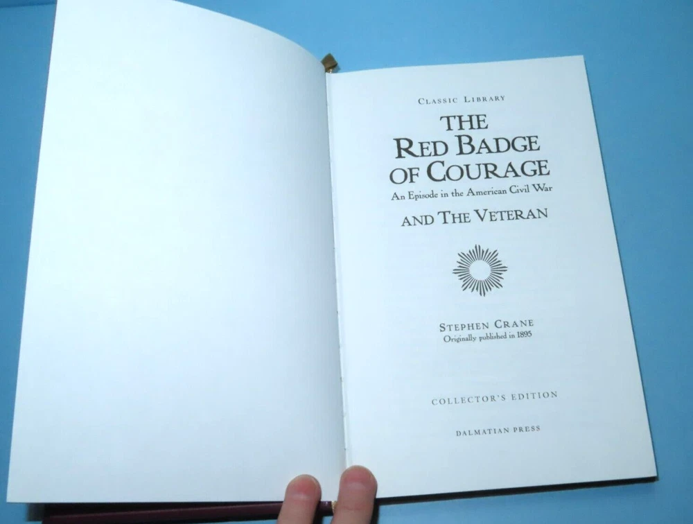 The Red Badge of Courage An Episode in the American Civil War by Stephen Crane Dalmatian Press Leather Bound Classics Condition: The book is in very good condition. There is a slight ding on the right edge of the front cover (see pics). Otherwise, the cover shows minimal wear. The binding is loose at the very beginning of the book and there are no loose/separated pages. See pictures for more details. 8.5x5.5x1 inches approx. 248 pages 1.3 lbs "At times he regarded the wounded soldiers in an envious way. He conceived persons with torn bodies to be peculiarly happy. He wished that he, too, had a wound, a red badge of courage." -- The Red Badge of Courage We are always happy to combine shipping for multiple items whenever possible. (Some large and/or fragile items require separate packaging.