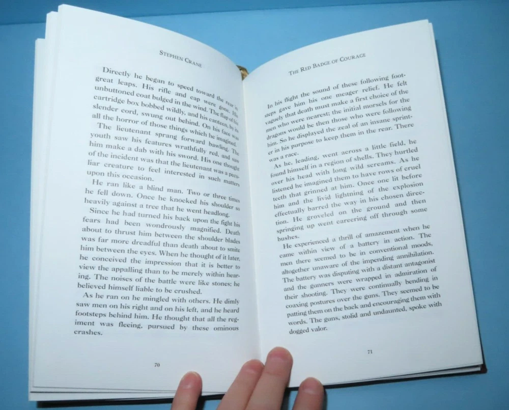 This classic edition of *The Red Badge of Courage* is a beautiful addition to any bookshelf. The leather-bound cover has a timeless feel, with only minor wear and a tiny ding—nothing distracting. The binding is a bit loose at the start, but all pages are intact, and the text is crisp and clear. The size is perfect for holding, and the weight gives it a sturdy, premium feel. A must-have for fans of Civil War literature or collectors of classic novels!