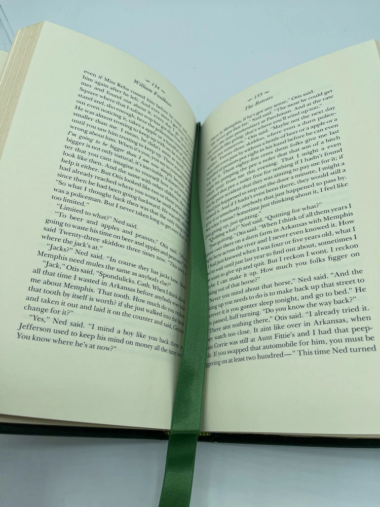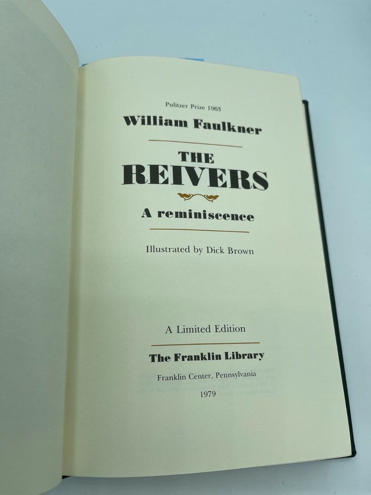 The Reivers by William Faulkner published by Franklin Library (1979) is a leather bound book with gold-lined pages. This book has a fabric lined inside cover with a satin ribbon bookmark. The book is illustrated by Dick Brown.