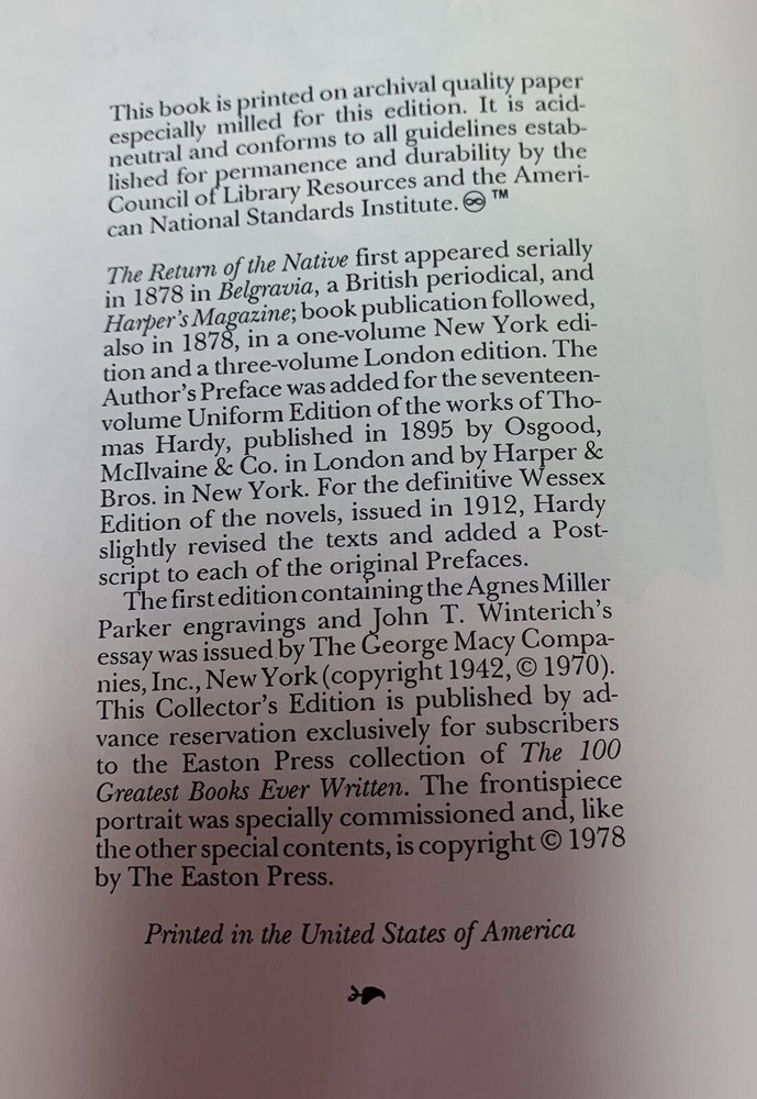 Excellent condition. All Easton Press editions are bound in full leather, with 22 kt. gold accents and lettering, printed with acid neutral pages that are thread sewn, not glued together. Most have gold gilded edges to further protect the pages. A silk marker is sewn into the binding. Beautiful editions for a family library.