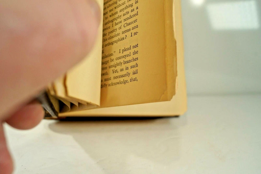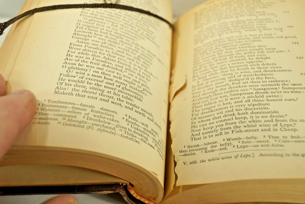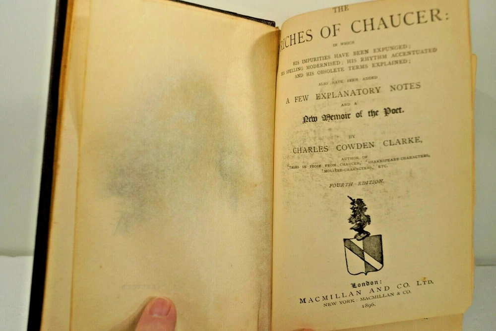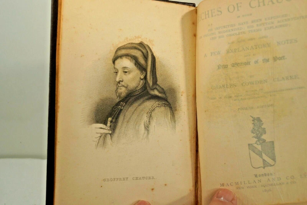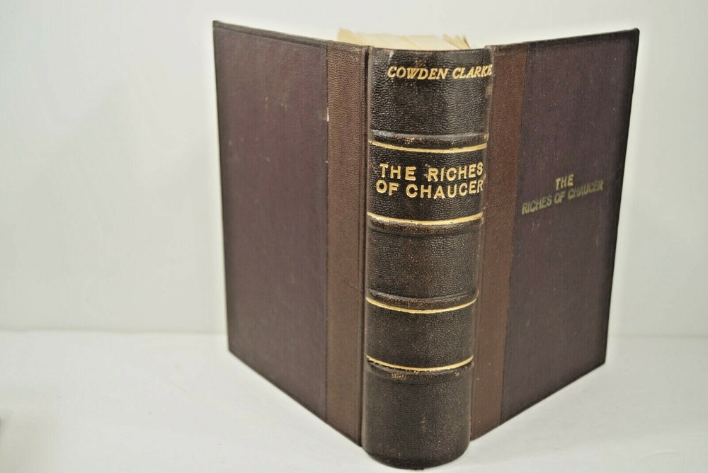 Riches of Chaucer: In Which His Impurities Have Been Expunged; His Spelling Modernised; His Rhythm Accentuated and His Obsolete Term Explained, by C.C. Clarke, Original Publication by MacMillan & Company,1896 London. Leather bound with silk page marker, some illustrations, 4th Edition. THIS IS AN ORIGINAL PRINTING, NOT A REPRINT. PHOTOS ARE OF THE COPY THAT IS LISTED FOR SALE. case