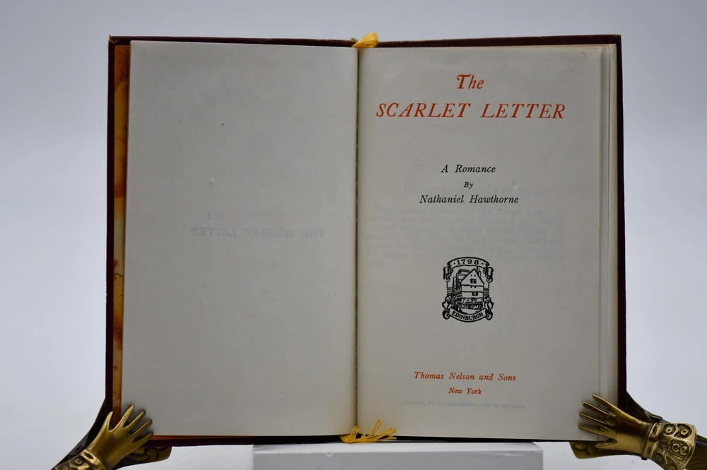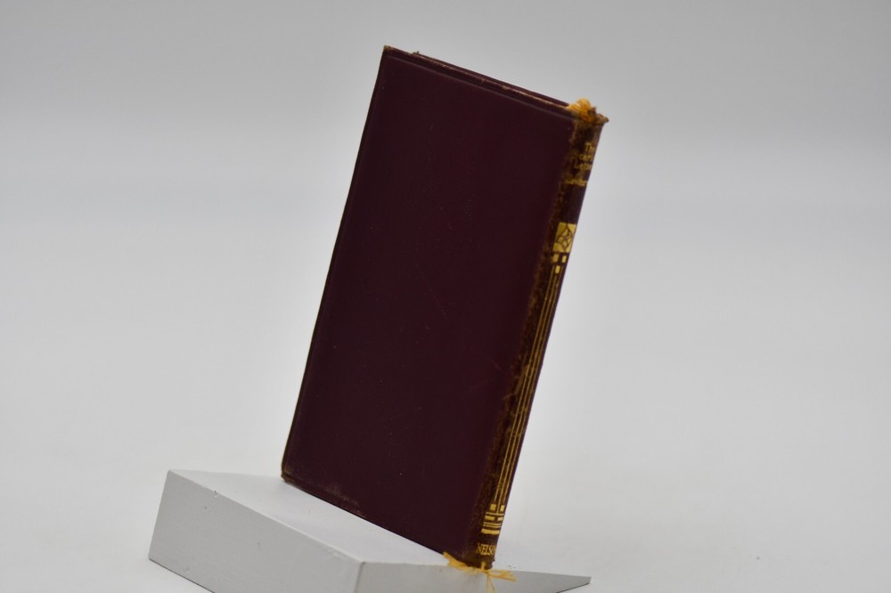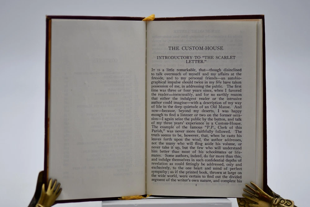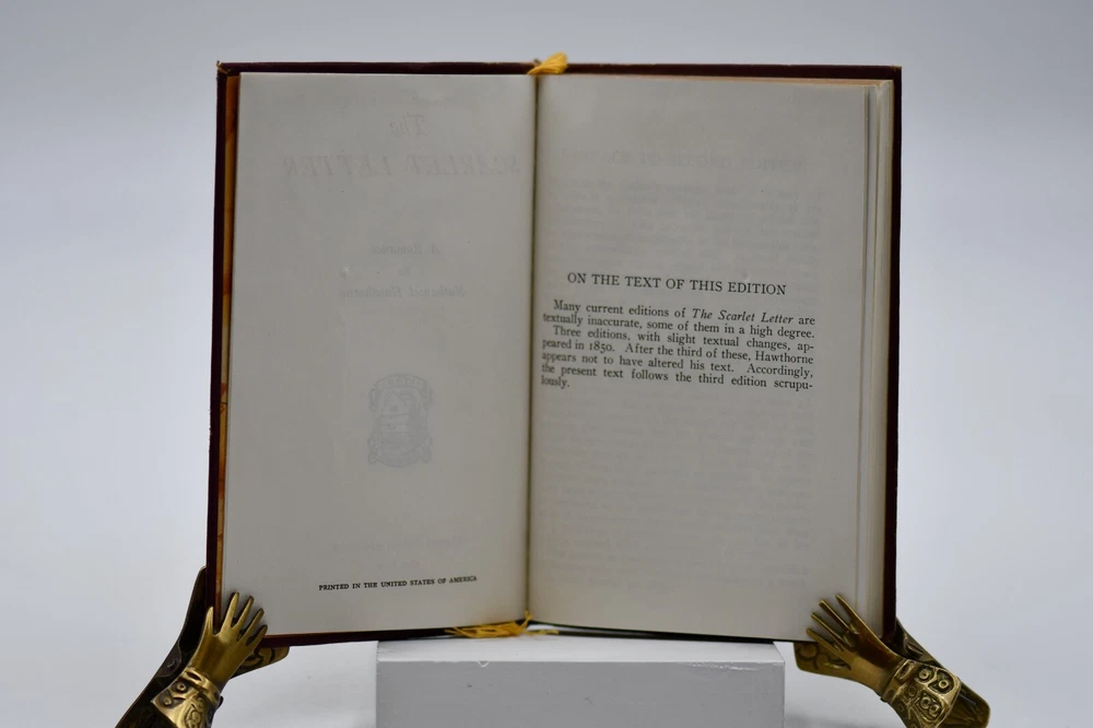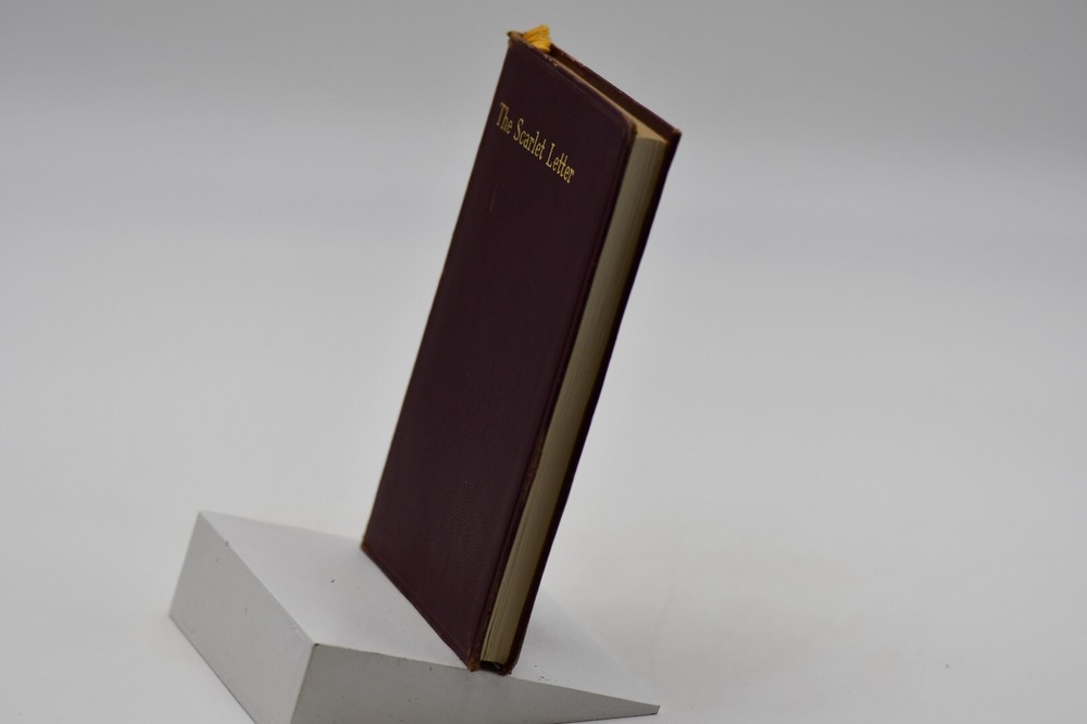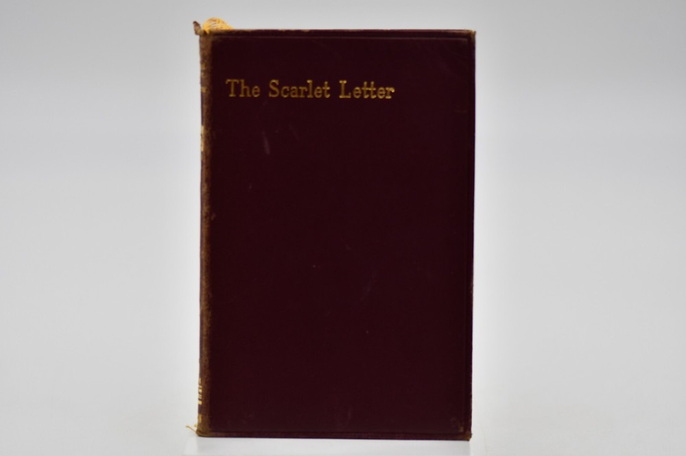 “The Scarlet Letter: A Romance” is considered a classic work of American literature on the reading list of many high school and college literature classes and commonly on the list of Great American Novels. Written by Nathaniel Hawthorne and published in 1850, it was one of the first mass-produced books in America, with the first mechanized printing of 2,500 volumes selling within ten days. The story of Hester Prynne and the Puritan Massachusetts Bay Colony contains several religious and historic allusions, that are still pertinent for readers today. This edition follows the text of the third 1850 edition that appears to be the last of the text altered by Hawthorne and is precious tiny book perfect for any lover of the classics. Condition: Flexible hard bound leather boards are made from soft supple maroon leather with gold gilt blind stamping to the spine and front cover. The spine has the title, author, and publisher as well as a decorative pattern. There is edge wear to the top and bottom of the back strip as well as the to the front and rear gutters. Front and rear boards are otherwise in beautiful condition with only the slightest of cosmetic blemishes. The corners are all slightly bumped with wear at the tips. The spine is straight, firmly attached to the decorative marble endpapers. Binding and text block are solid with gold gilt along the top page edge. Bookmark ribbon is intact but with fraying at the bottom. Interior pages are clean with no chips, tears, or previous owner marks. 285 pages. Dimensions: H – 6-1/4” W – 4”