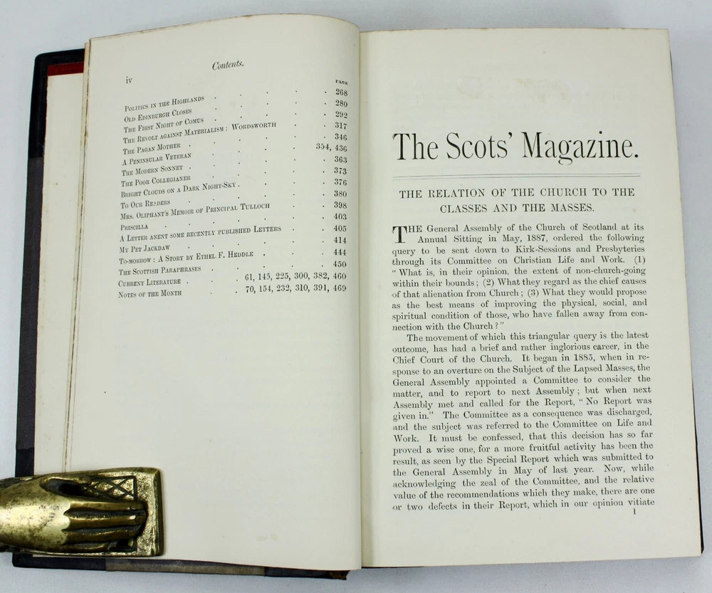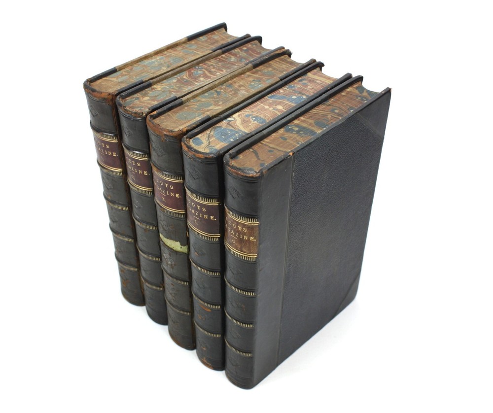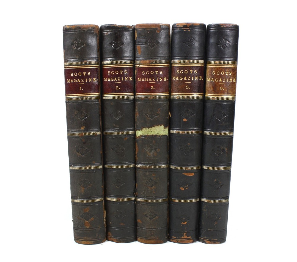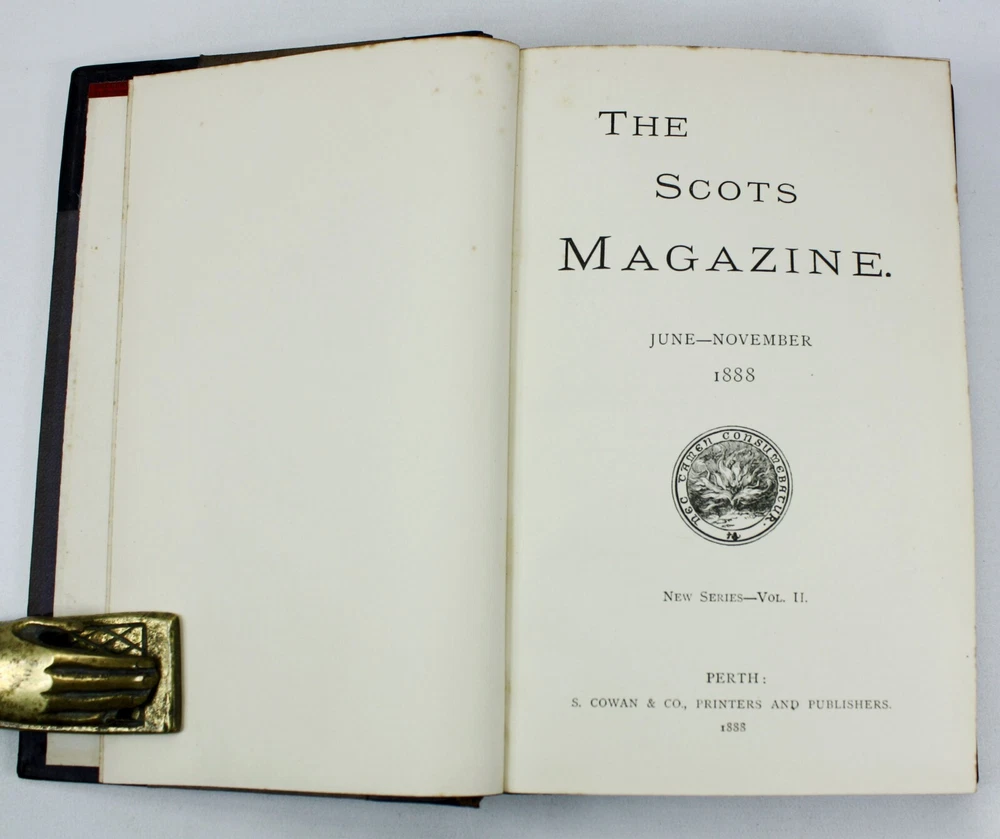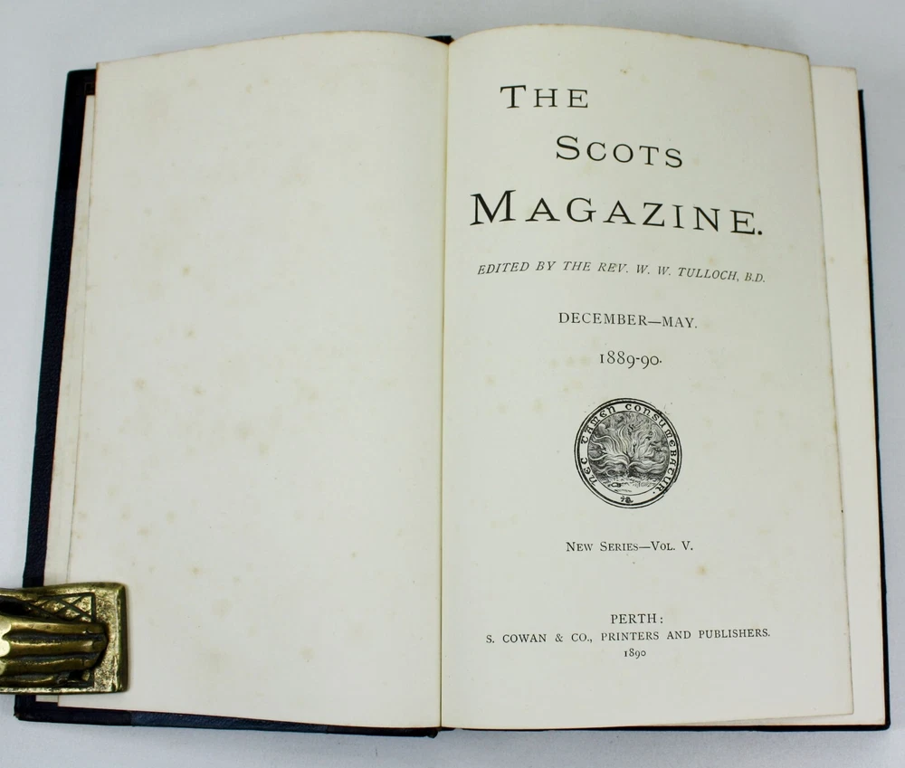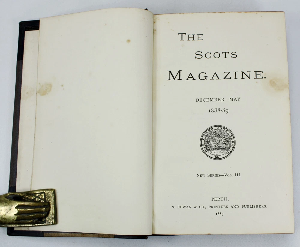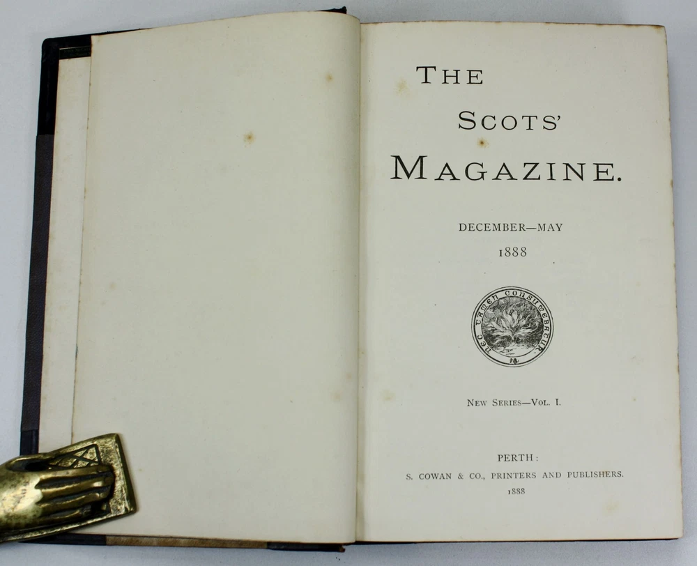 The Scots Magazine was found in 1739, and claims to be the world's oldest magazine still in publication today (although with gaps in its publication history). It merged with Edinburgh Magazine and Literary Miscellany in 1804. It was intended as a Scottish rival to the London-based Gentleman's Magazine, covering a diverse range of Scottish interest issues, amongst wider global subjects of interest. Following a large gap in publication from the 1930s, when it had been withdrawn, The Scots Magazine was again published From December 1887 until 1893, under the new ownership of S. Cowan of Perth. There is a strong Christian focus during this period. Issues from this period are particularly scarce, and are presented here... 5 matching volumes comprising: Vol. 1: New Series - Vol I; December 1887 - May, 1888, 480pp; Vol. 2: New Series - Vol II; June - November, 1888, 472pp; Vol. 3: New Series - Vol III; December 1988- May, 1889, 476pp; Vol. 5: New Series - Vol V; December 1989- May, 1890, 476pp; and; Vol. 6: New Series - Vol VI; June - November, 1890, 476pp. (Missing Vol. 4 in the run). The Editor for Vols. 5 & 6 is credited on the title page as the Rev. W.W. Tulloch, B.D. Published by S. Cowan & Co., Printers and publishers, Perth. 1888-1890 First editions. Also additional publishers are credited for different cities: Houlston & Son, London; J. Menzies & Co., Edinburgh; J.Menzies & Co., Wm. Love, W. & R. Holmes and C.L. Wright, Glasgow. A good set of 5 black hardback volumes with leather spines and corners, with raised bands, gilt decoration and morocco title labels. The cloth covering is a black chagrin style material. Covers are scuffed and bumped with some discoloration. Volumes 1 and 3 with cracked and weak front joints, but all still bound. Vol 3 with loss to leather on spine. With age spotting to endpapers. The text itself is very good - generally bright and clean throughout. With a few pencil annotations to rear endpapers. Nicely marbled edges to text block. Text in English. Dimensions: Each volume approximately 217mm x 145mm x 30mm. Weight: Approximately 3.88kg (the set - unpacked). The Scots Magazine was found in 1739, and claims to be the world's oldest magazine still in publication today (although with gaps in its publication history). It merged with Edinburgh Magazine and Literary Miscellany in 1804. It was intended as a Scottish rival to the London-based Gentleman's Magazine, covering a diverse range of Scottish interest issues, amongst wider global subjects of interest. Following a large gap in publication from the 1930s, when it had been withdrawn, The Scots Magazine was again published From December 1887 until 1893, under the new ownership of S. Cowan of Perth. There is a strong Christian focus during this period. Issues from this period are particularly scarce, and are presented here... A good set of 5 black hardback volumes with leather spines and corners, w
