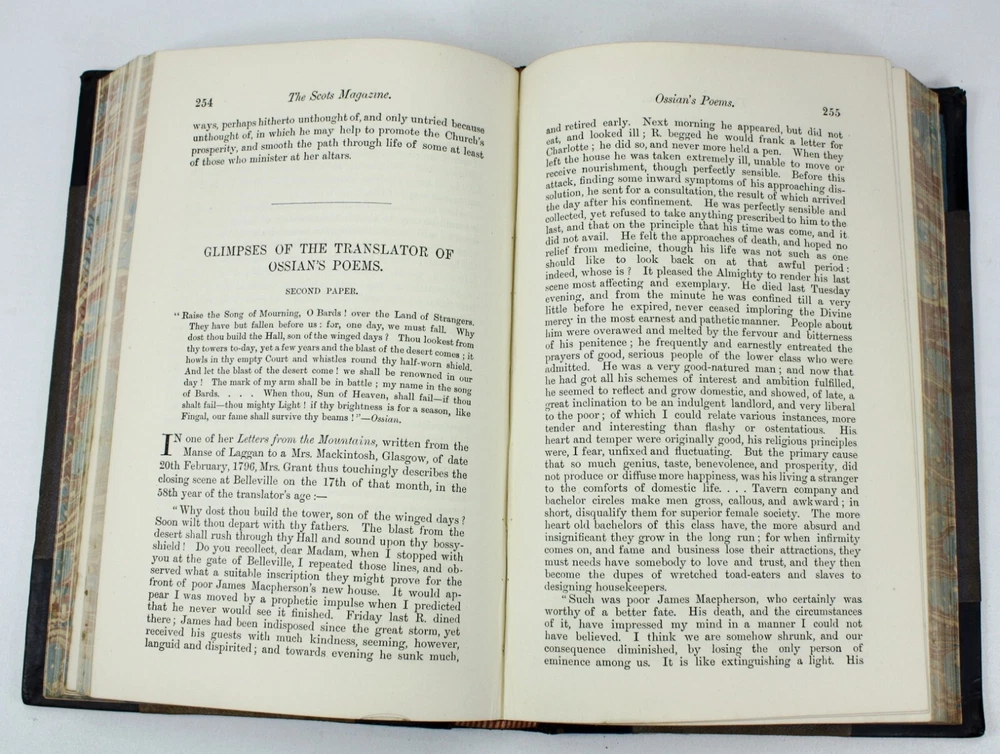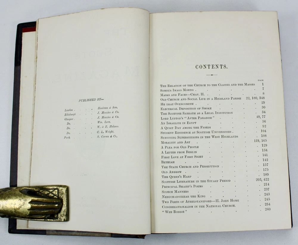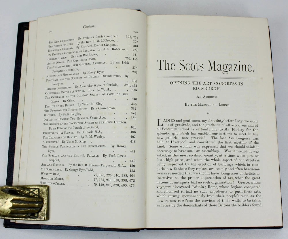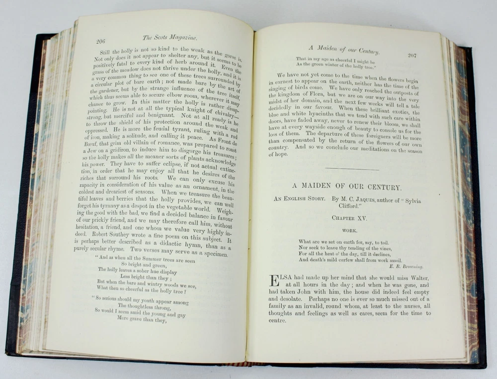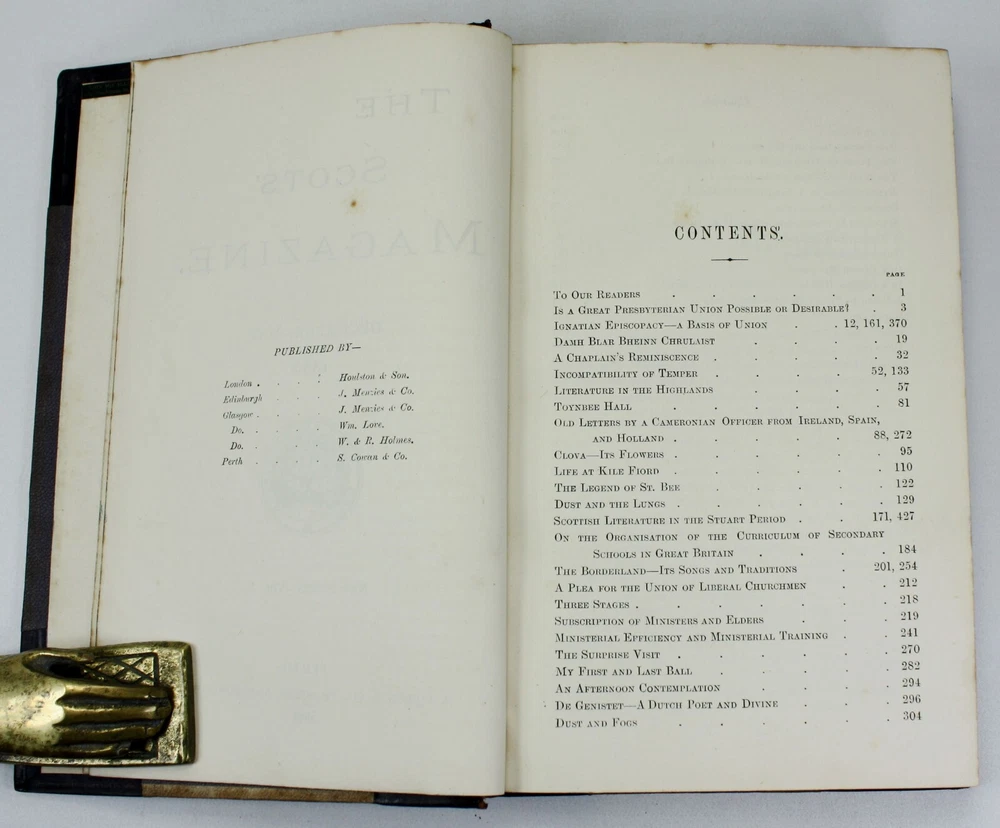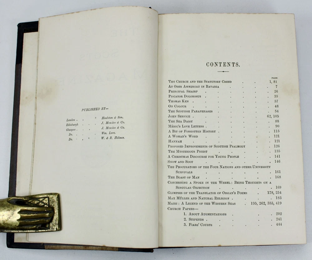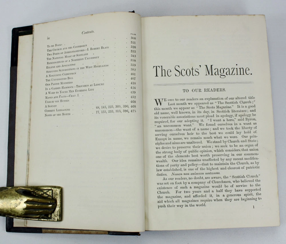The Scots Magazine was found in 1739, and claims to be the world's oldest magazine still in publication today (although with gaps in its publication history). It merged with Edinburgh Magazine and Literary Miscellany in 1804. It was intended as a Scottish rival to the London-based Gentleman's Magazine, covering a diverse range of Scottish interest issues, amongst wider global subjects of interest. Following a large gap in publication from the 1930s, when it had been withdrawn, The Scots Magazine was again published From December 1887 until 1893, under the new ownership of S. Cowan of Perth. There is a strong Christian focus during this period. Issues from this period are particularly scarce, and are presented here... 5 matching volumes comprising: Vol. 1: New Series - Vol I; December 1887 - May, 1888, 480pp; Vol. 2: New Series - Vol II; June - November, 1888, 472pp; Vol. 3: New Series - Vol III; December 1988- May, 1889, 476pp; Vol. 5: New Series - Vol V; December 1989- May, 1890, 476pp; and; Vol. 6: New Series - Vol VI; June - November, 1890, 476pp. (Missing Vol. 4 in the run). The Editor for Vols. 5 & 6 is credited on the title page as the Rev. W.W. Tulloch, B.D. Published by S. Cowan & Co., Printers and publishers, Perth. 1888-1890 First editions. Also additional publishers are credited for different cities: Houlston & Son, London; J. Menzies & Co., Edinburgh; J.Menzies & Co., Wm. Love, W. & R. Holmes and C.L. Wright, Glasgow. A good set of 5 black hardback volumes with leather spines and corners, with raised bands, gilt decoration and morocco title labels. The cloth covering is a black chagrin style material. Covers are scuffed and bumped with some discoloration. Volumes 1 and 3 with cracked and weak front joints, but all still bound. Vol 3 with loss to leather on spine. With age spotting to endpapers. The text itself is very good - generally bright and clean throughout. With a few pencil annotations to rear endpapers. Nicely marbled edges to text block. Text in English. Dimensions: Each volume approximately 217mm x 145mm x 30mm. Weight: Approximately 3.88kg (the set - unpacked). The Scots Magazine was found in 1739, and claims to be the world's oldest magazine still in publication today (although with gaps in its publication history). It merged with Edinburgh Magazine and Literary Miscellany in 1804. It was intended as a Scottish rival to the London-based Gentleman's Magazine, covering a diverse range of Scottish interest issues, amongst wider global subjects of interest. Following a large gap in publication from the 1930s, when it had been withdrawn, The Scots Magazine was again published From December 1887 until 1893, under the new ownership of S. Cowan of Perth. There is a strong Christian focus during this period. Issues from this period are particularly scarce, and are presented here... A good set of 5 black hardback volumes with leather spines and corners, w