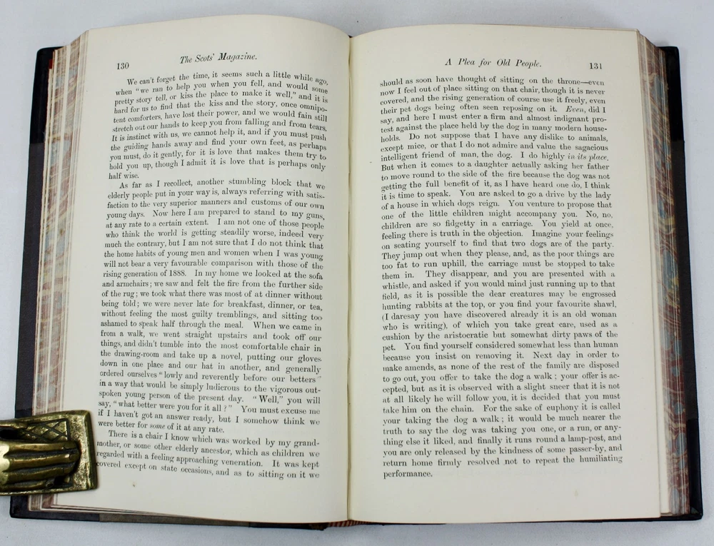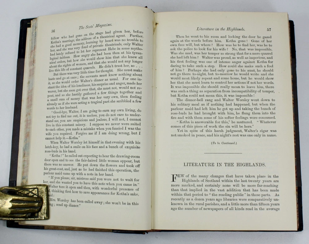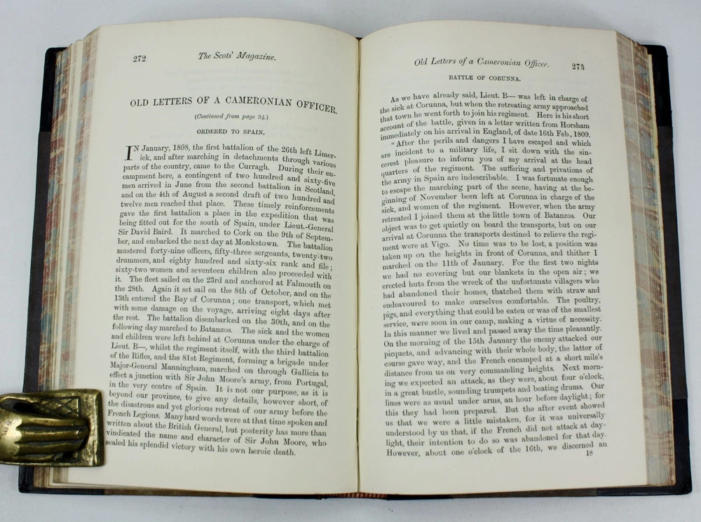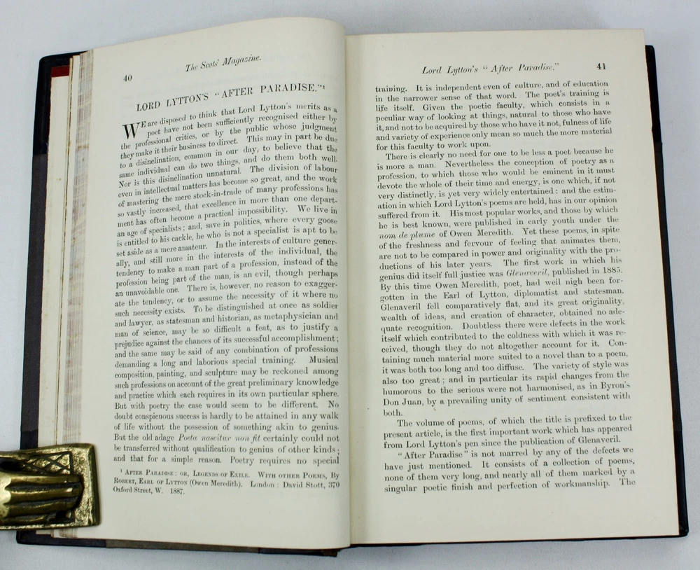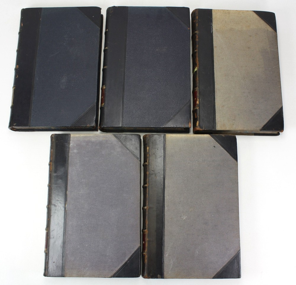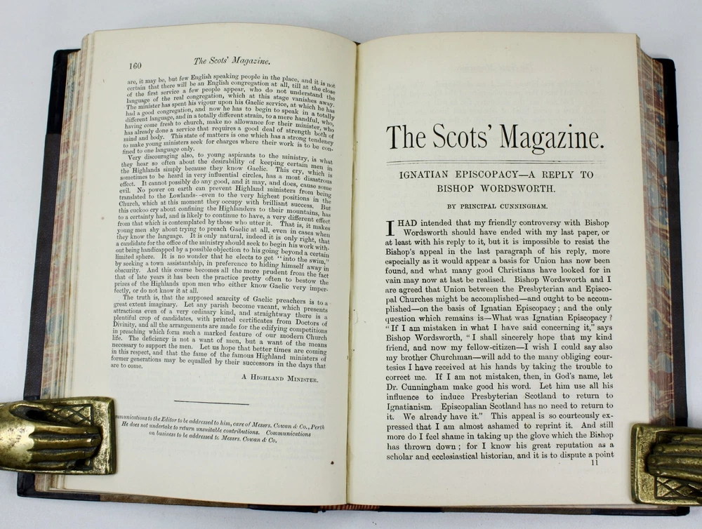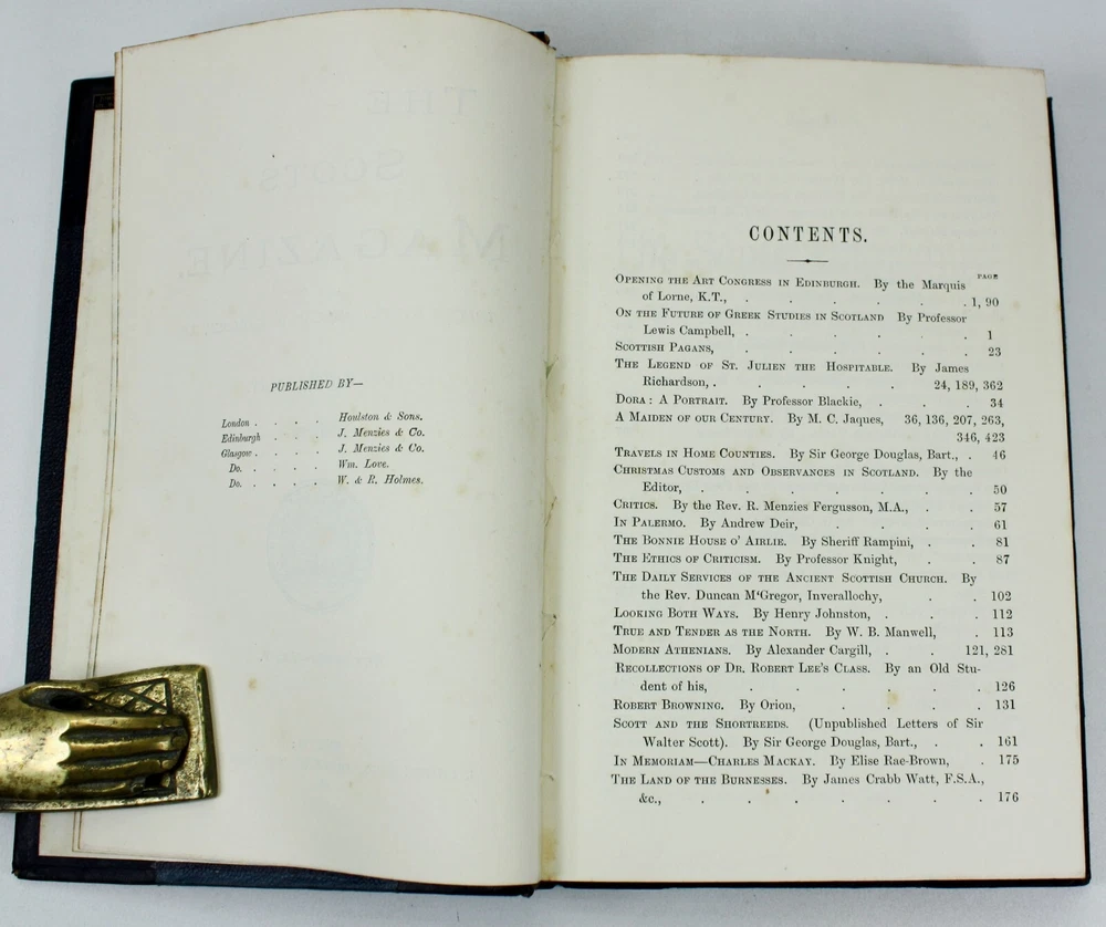 The Scots Magazine was found in 1739, and claims to be the world's oldest magazine still in publication today (although with gaps in its publication history). It merged with Edinburgh Magazine and Literary Miscellany in 1804. It was intended as a Scottish rival to the London-based Gentleman's Magazine, covering a diverse range of Scottish interest issues, amongst wider global subjects of interest. Following a large gap in publication from the 1930s, when it had been withdrawn, The Scots Magazine was again published From December 1887 until 1893, under the new ownership of S. Cowan of Perth. There is a strong Christian focus during this period. Issues from this period are particularly scarce, and are presented here... 5 matching volumes comprising: Vol. 1: New Series - Vol I; December 1887 - May, 1888, 480pp; Vol. 2: New Series - Vol II; June - November, 1888, 472pp; Vol. 3: New Series - Vol III; December 1988- May, 1889, 476pp; Vol. 5: New Series - Vol V; December 1989- May, 1890, 476pp; and; Vol. 6: New Series - Vol VI; June - November, 1890, 476pp. (Missing Vol. 4 in the run). The Editor for Vols. 5 & 6 is credited on the title page as the Rev. W.W. Tulloch, B.D. Published by S. Cowan & Co., Printers and publishers, Perth. 1888-1890 First editions. Also additional publishers are credited for different cities: Houlston & Son, London; J. Menzies & Co., Edinburgh; J.Menzies & Co., Wm. Love, W. & R. Holmes and C.L. Wright, Glasgow. A good set of 5 black hardback volumes with leather spines and corners, with raised bands, gilt decoration and morocco title labels. The cloth covering is a black chagrin style material. Covers are scuffed and bumped with some discoloration. Volumes 1 and 3 with cracked and weak front joints, but all still bound. Vol 3 with loss to leather on spine. With age spotting to endpapers. The text itself is very good - generally bright and clean throughout. With a few pencil annotations to rear endpapers. Nicely marbled edges to text block. Text in English. Dimensions: Each volume approximately 217mm x 145mm x 30mm. Weight: Approximately 3.88kg (the set - unpacked). The Scots Magazine was found in 1739, and claims to be the world's oldest magazine still in publication today (although with gaps in its publication history). It merged with Edinburgh Magazine and Literary Miscellany in 1804. It was intended as a Scottish rival to the London-based Gentleman's Magazine, covering a diverse range of Scottish interest issues, amongst wider global subjects of interest. Following a large gap in publication from the 1930s, when it had been withdrawn, The Scots Magazine was again published From December 1887 until 1893, under the new ownership of S. Cowan of Perth. There is a strong Christian focus during this period. Issues from this period are particularly scarce, and are presented here... A good set of 5 black hardback volumes with leather spines and corners, w