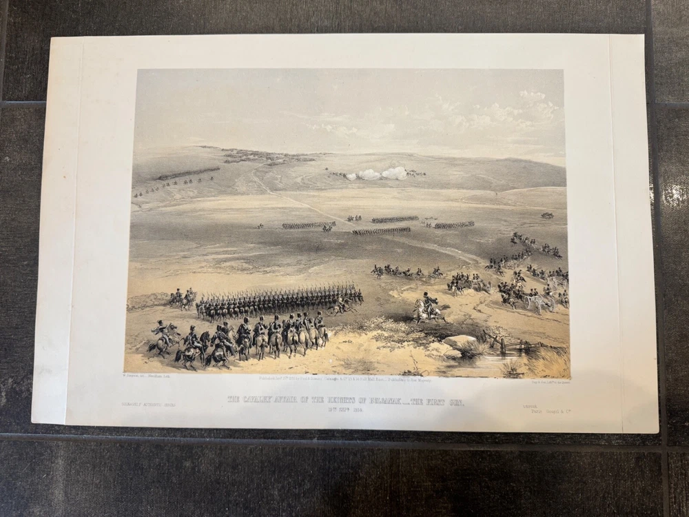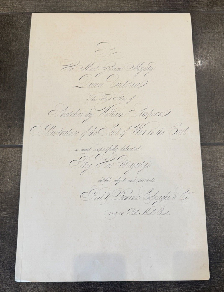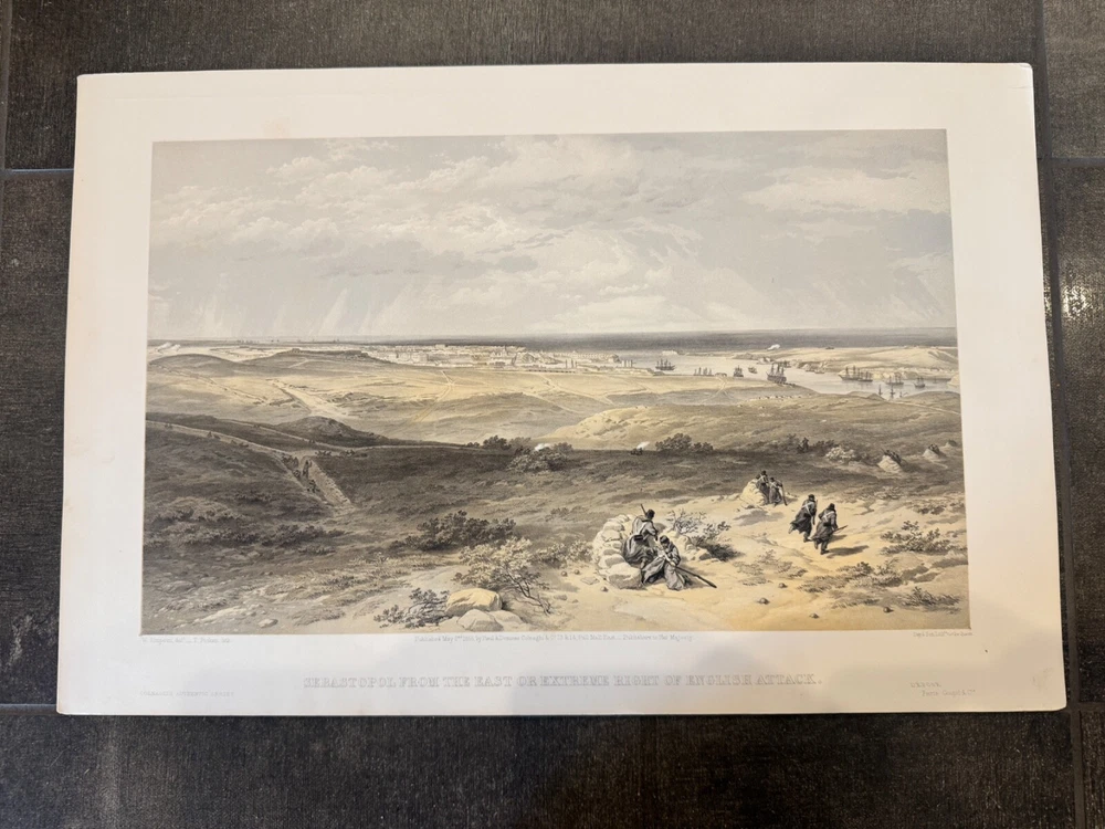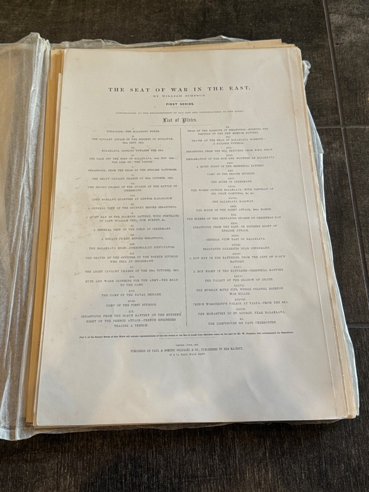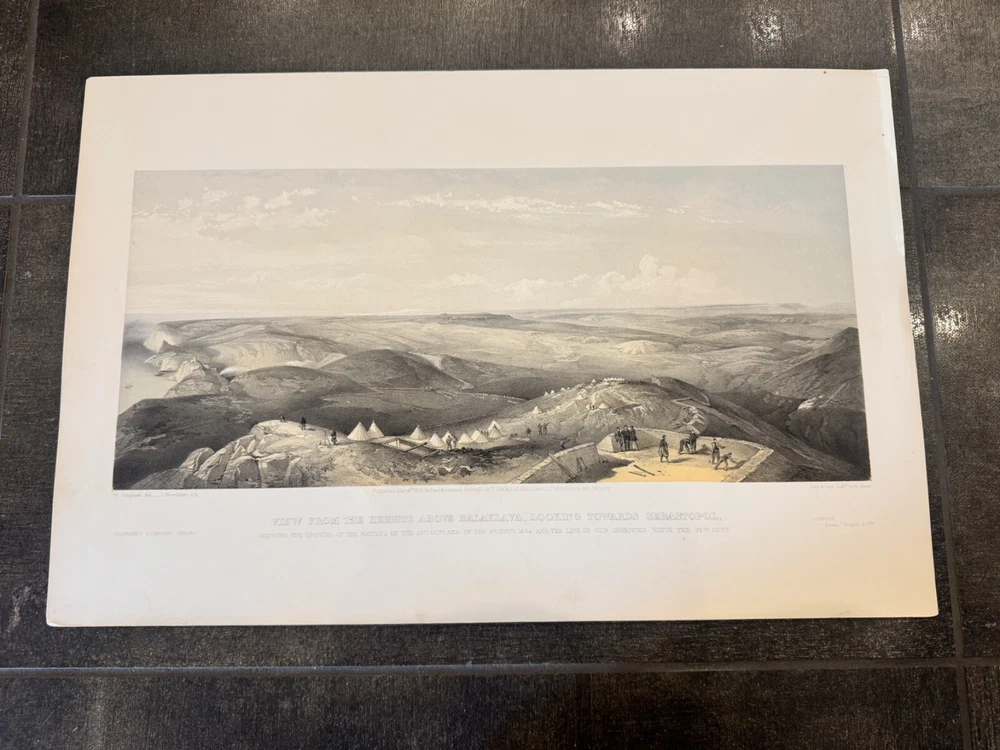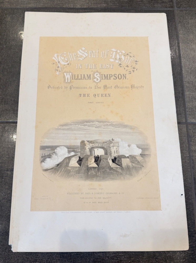 The book titled "The Seat Of War In The East" by William Simpson is a rare first edition published in 1855 by Paul & Dominic Colnaghi. It is a leather-bound book with 21 pages, written in English, and intended for an adult audience. The book provides a historical account of the war in the East during the 1800s, making it a valuable piece for history enthusiasts and collectors. Size is 22x15" This is a significant historical publishing. Its not complete by any means, but it has some beautiful aspects including the original intact spine and Queen Victoria dedication page Some pages have small tears, have folded and unfolded after, still are folded etc. Includes The Following Large Full Size Plates - list of plates - malakoff tower - Highland brigade camp - charge of the heavy calvary brigade 25th October 1854 - the calvary affair of the heights of bulganak _ the firs gun - second charge of the guards - Sebastopol from the east or extreme right of the English attack - view from the heights above balaklava looking towards Sebastopol - a Christmas dinner on the heights before Sebastopol - the camp of the second division looking east - prince woronzoffs palace near Yalta on the south coast of Crimea Small Descriptive Outline Etched Plates as Keys to the Larger Lithographs. - key to the Sebastopol from the rear of the English batteries - key to a Christmas dinner on the heights before Sebastopol - key to the view from heights above balaclava looking towards Sebastopol - key to the camp fo the naval bridge before Sebastopol - key to the calvary affair of the heights of bulganak - the first gun - key to the charge of the heavy calvary brigade - key to the second charge of the guards when they retook the two gun battery at the battle of inkermann - key to Sebastopol from the east or extreme right of the English attack - key to the field of inkermann - key to the gale off the port of balaklava - key to the highland brigade camp looking south - key to the camp of the 1st devision