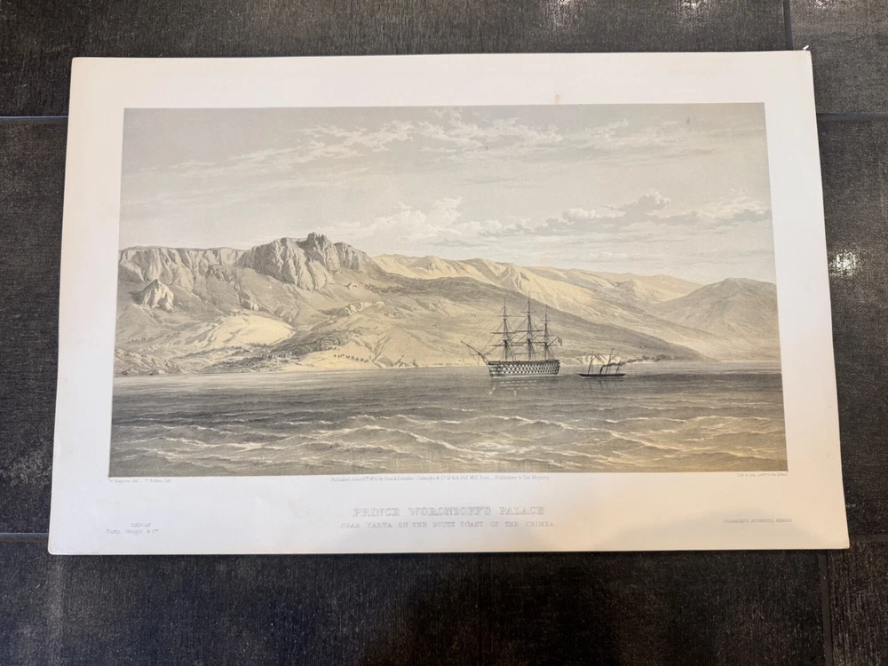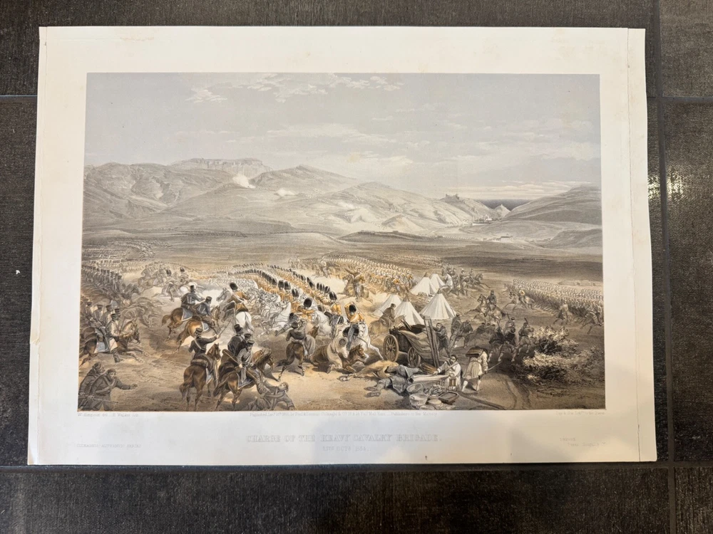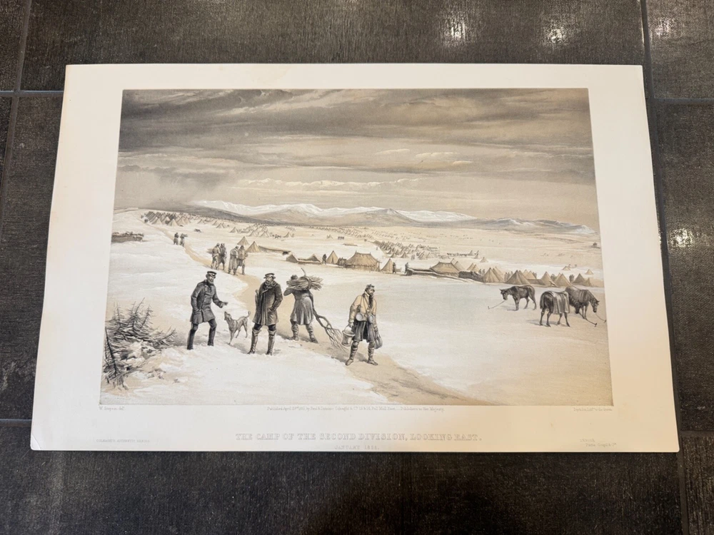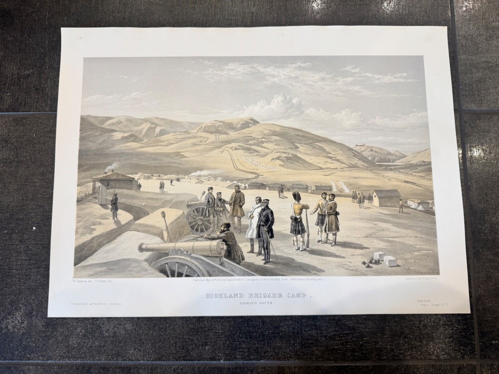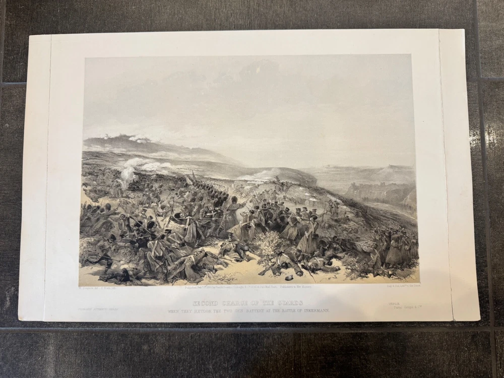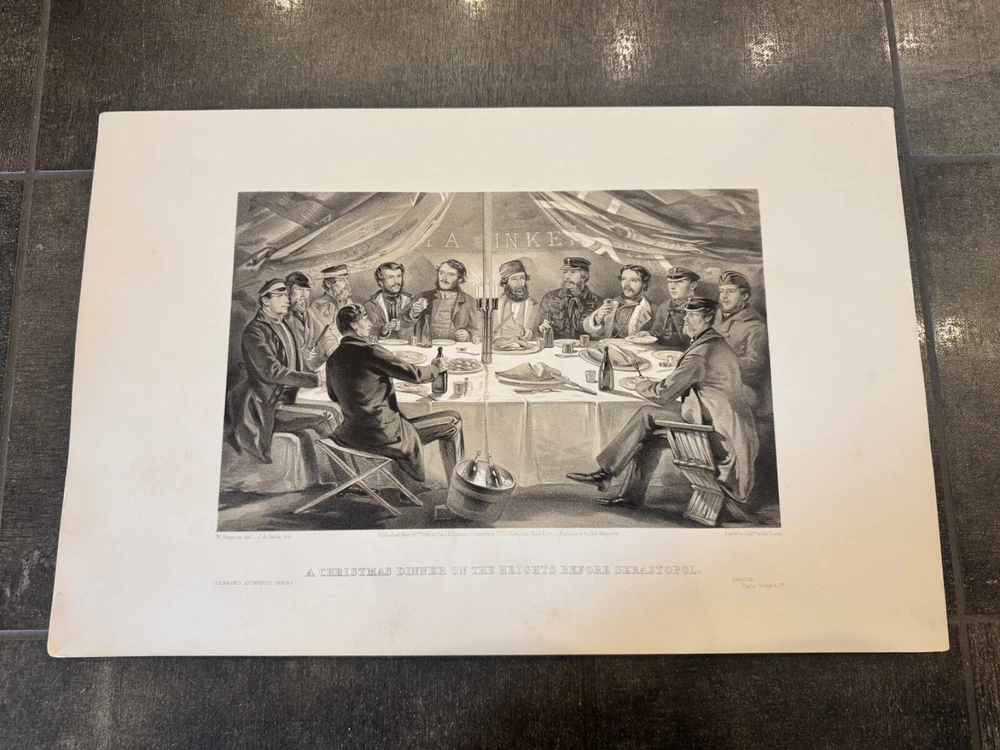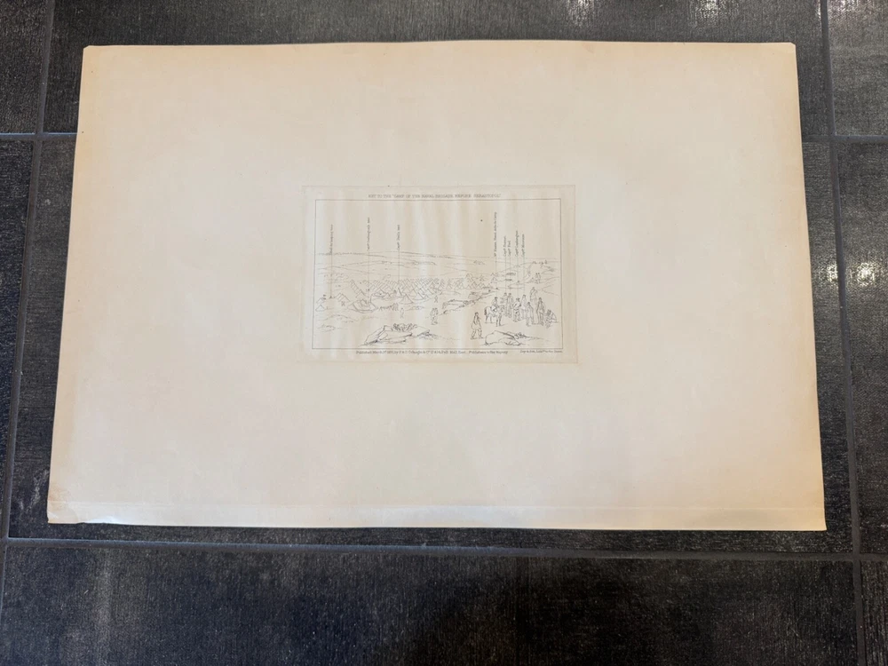 The book titled "The Seat Of War In The East" by William Simpson is a rare first edition published in 1855 by Paul & Dominic Colnaghi. It is a leather-bound book with 21 pages, written in English, and intended for an adult audience. The book provides a historical account of the war in the East during the 1800s, making it a valuable piece for history enthusiasts and collectors. Size is 22x15" This is a significant historical publishing. Its not complete by any means, but it has some beautiful aspects including the original intact spine and Queen Victoria dedication page Some pages have small tears, have folded and unfolded after, still are folded etc. Includes The Following Large Full Size Plates - list of plates - malakoff tower - Highland brigade camp - charge of the heavy calvary brigade 25th October 1854 - the calvary affair of the heights of bulganak _ the firs gun - second charge of the guards - Sebastopol from the east or extreme right of the English attack - view from the heights above balaklava looking towards Sebastopol - a Christmas dinner on the heights before Sebastopol - the camp of the second division looking east - prince woronzoffs palace near Yalta on the south coast of Crimea Small Descriptive Outline Etched Plates as Keys to the Larger Lithographs. - key to the Sebastopol from the rear of the English batteries - key to a Christmas dinner on the heights before Sebastopol - key to the view from heights above balaclava looking towards Sebastopol - key to the camp fo the naval bridge before Sebastopol - key to the calvary affair of the heights of bulganak - the first gun - key to the charge of the heavy calvary brigade - key to the second charge of the guards when they retook the two gun battery at the battle of inkermann - key to Sebastopol from the east or extreme right of the English attack - key to the field of inkermann - key to the gale off the port of balaklava - key to the highland brigade camp looking south - key to the camp of the 1st devision