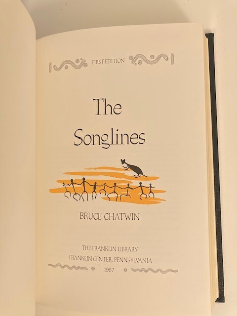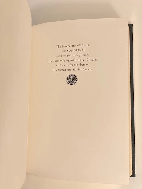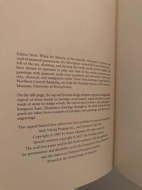This stunning limited edition of *The Songlines* is a true collector’s gem—pristine, sealed, and personally signed by Bruce Chatwin. The luxurious leather binding, gilt edges, and smyth-sewn pages showcase exceptional craftsmanship. A rare find, complete with a special essay, making it a must-have for any serious bibliophile. Absolutely flawless!