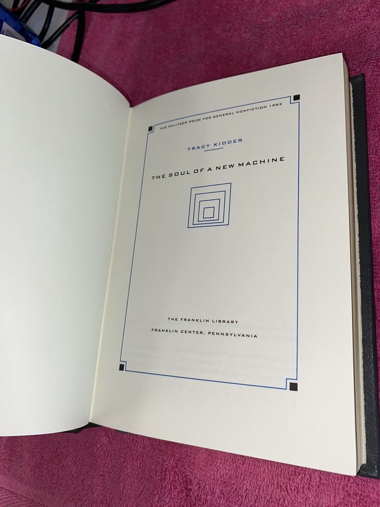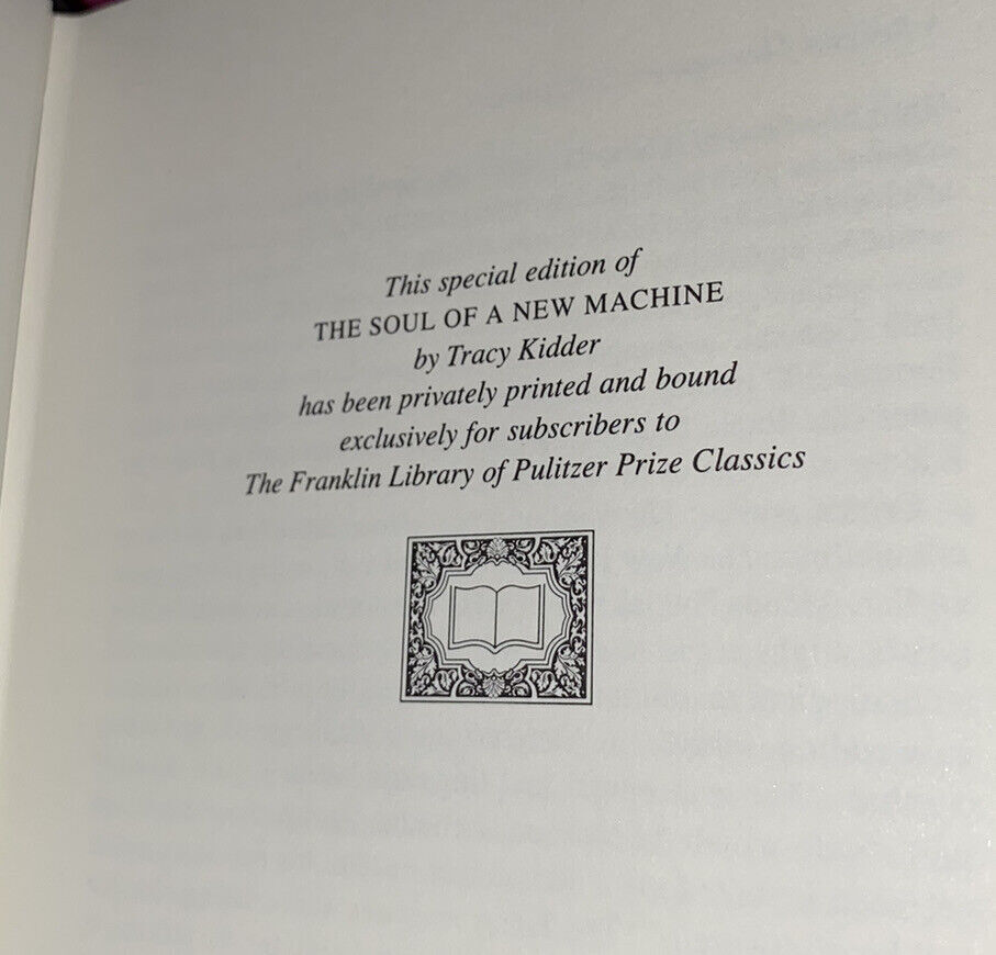 This is a beautifully crafted book, sure to be a treasure for any literature collector. The leather binding and special attributes make it a unique addition to any library. Written by Tracy Kidder, this original edition from 1986 is a Pulitzer Prize winner and a true masterpiece of literature. The place of publication is the USA, printed in English, and focuses on the topic of technology and its impact on society. The Franklin Library edition is a must-have for any serious collector, and this example is in mint condition, making it a rare find. Listing and template services provided by inkFrog
