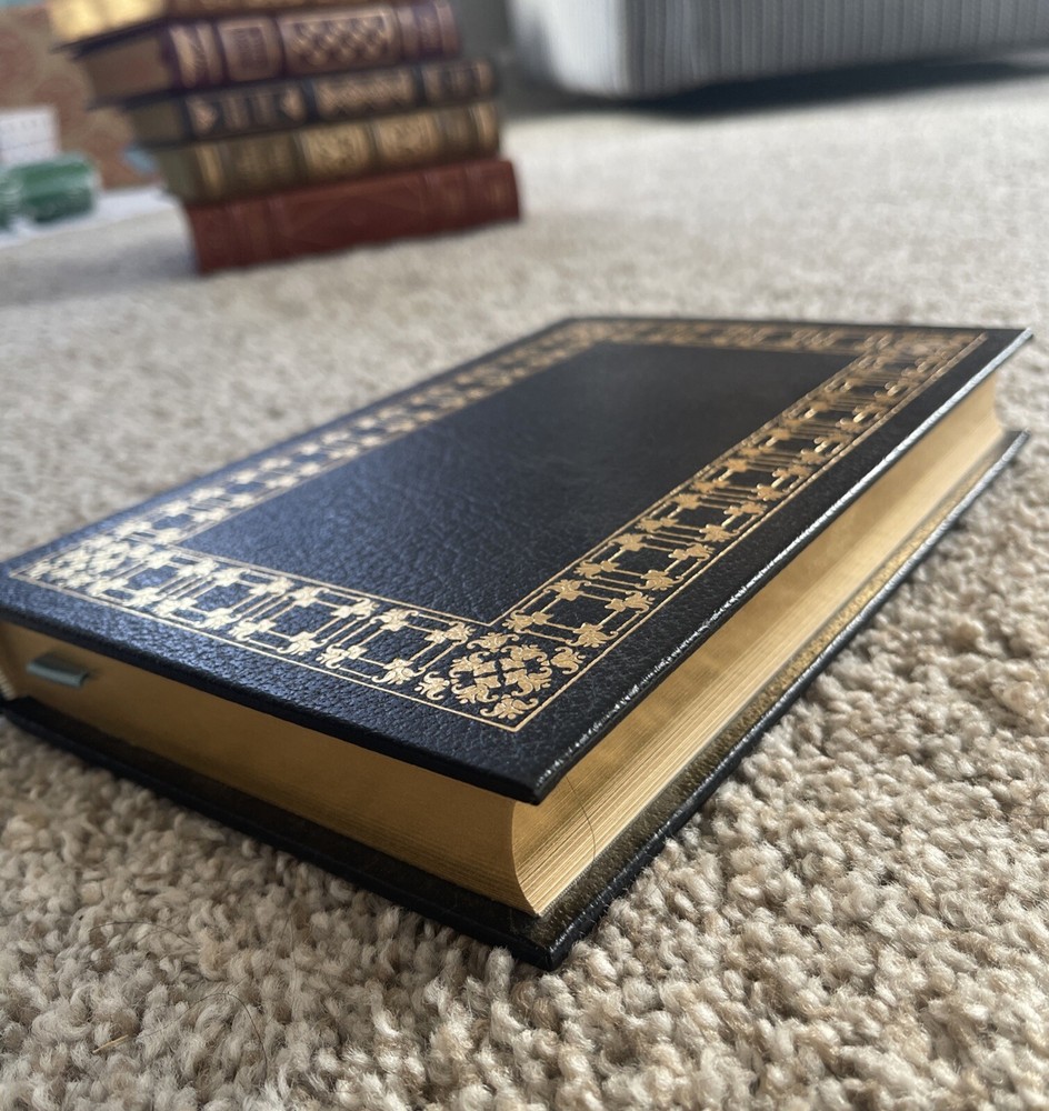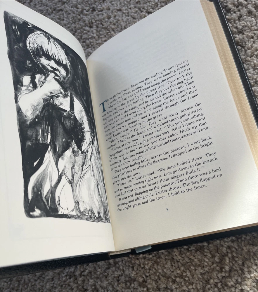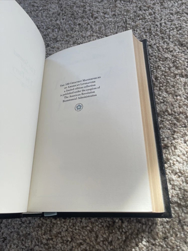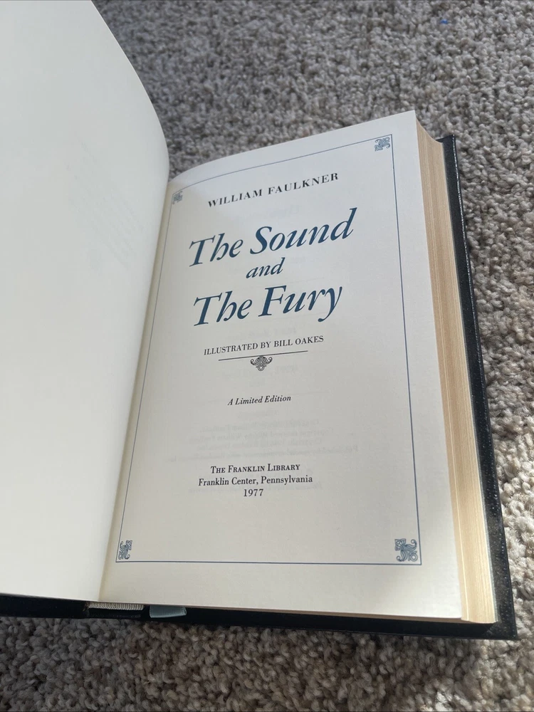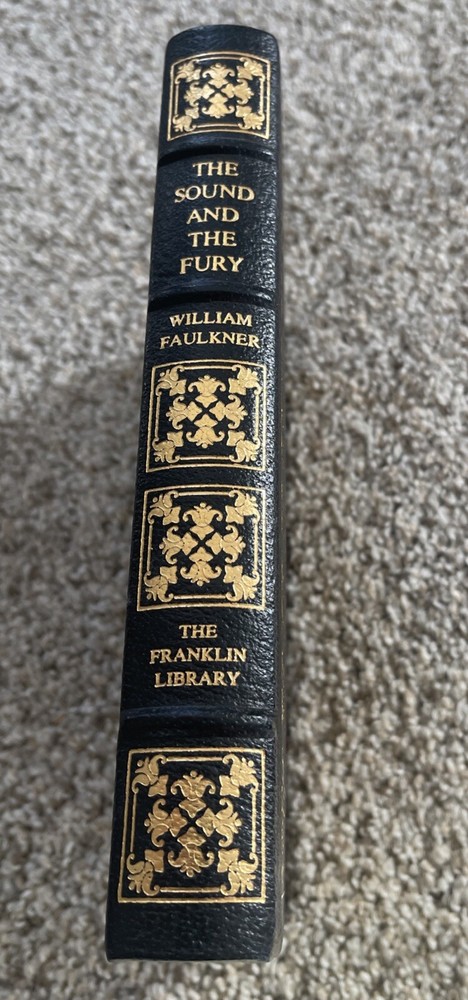 Add a nice leather bound book to your shelf. The product is a limited edition version of William Faulkner's novel "The Sound and The Fury," published by Franklin Library in Pennsylvania in 1977. This luxury edition is illustrated and personalized, making it a unique collector's item for fans of literature and fiction. The book features leather binding, is written in English, and is an original printing from the United States. It is a special piece for those interested in classics and American literature.