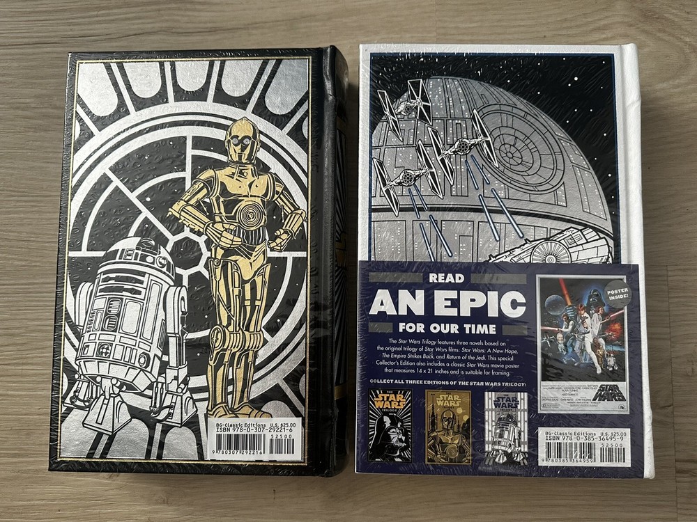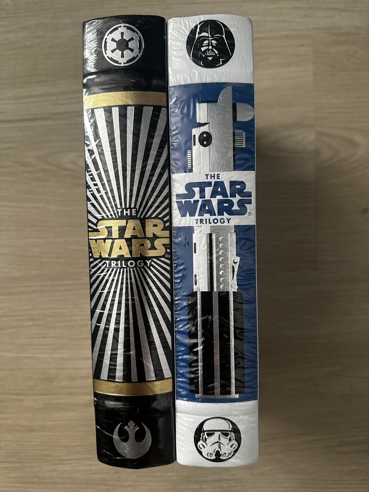 The Star Wars Trilogy – Darth Vader & R2D2 covers bound in leather, with silver edged pages and a ribbon marker contents Star Wars – A New Hope The Empire Strikes Back Return of the Jedi Item Condition: These are leatherbound hardcover, sealed. The seals are in perfect condition having never left a shelf after purchase. Poster still inside R2D2 version. Dimensions are approx: 9.25" x 6.25" x 1.55" This book will ship in a box, with bubble wrap.