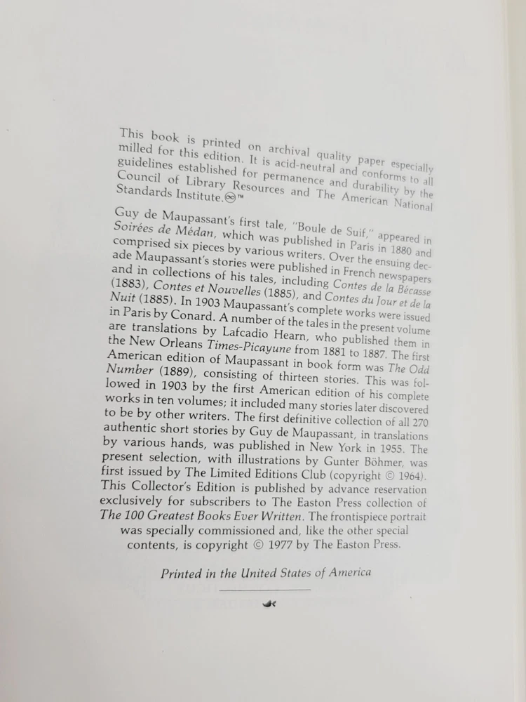 The Tales of GUY de Maupassant Easton Press Leather Bound Gilded Hardcover 1977. The book is in very good condition. Shows little to no wear. Please refer to all photos.