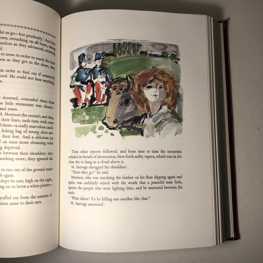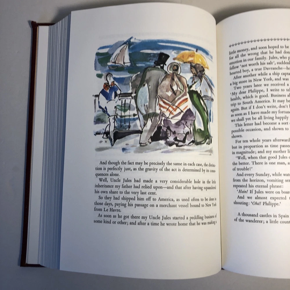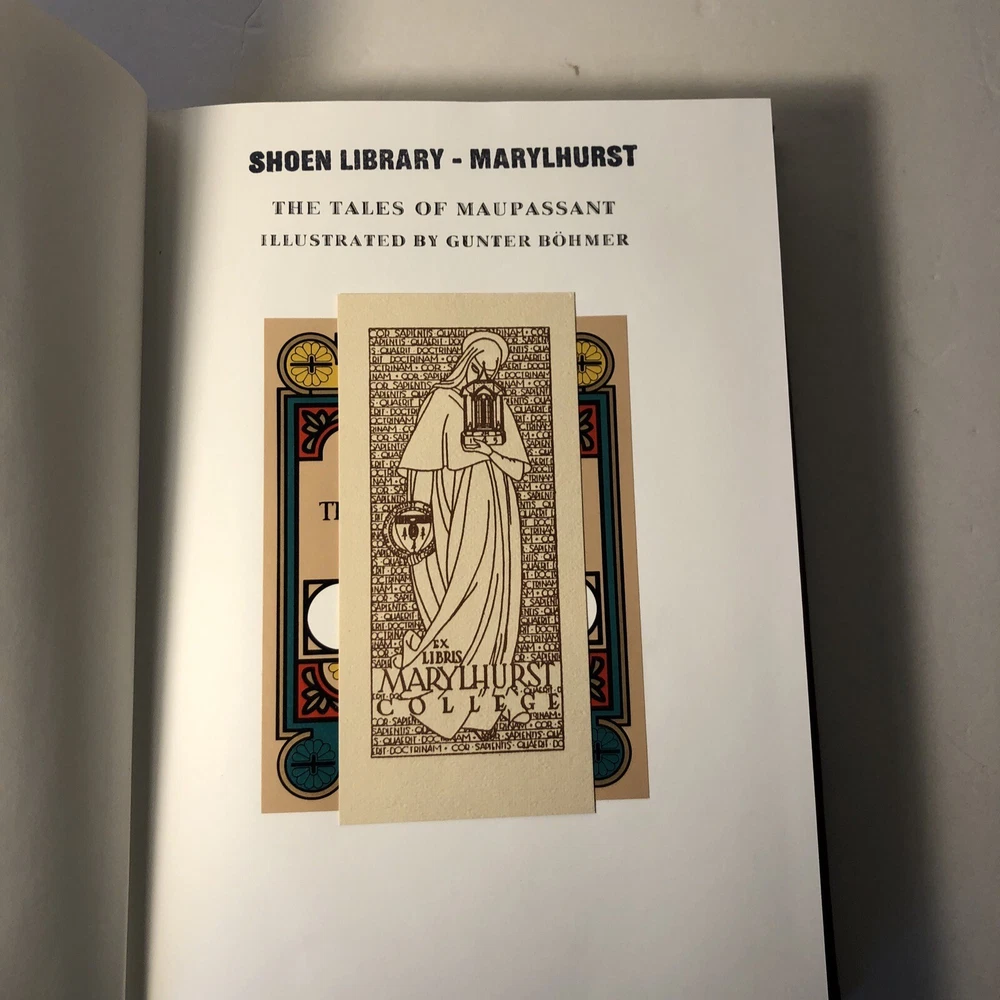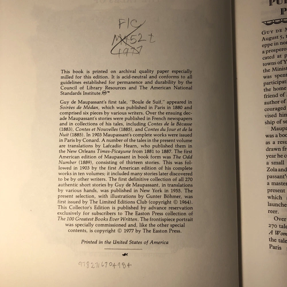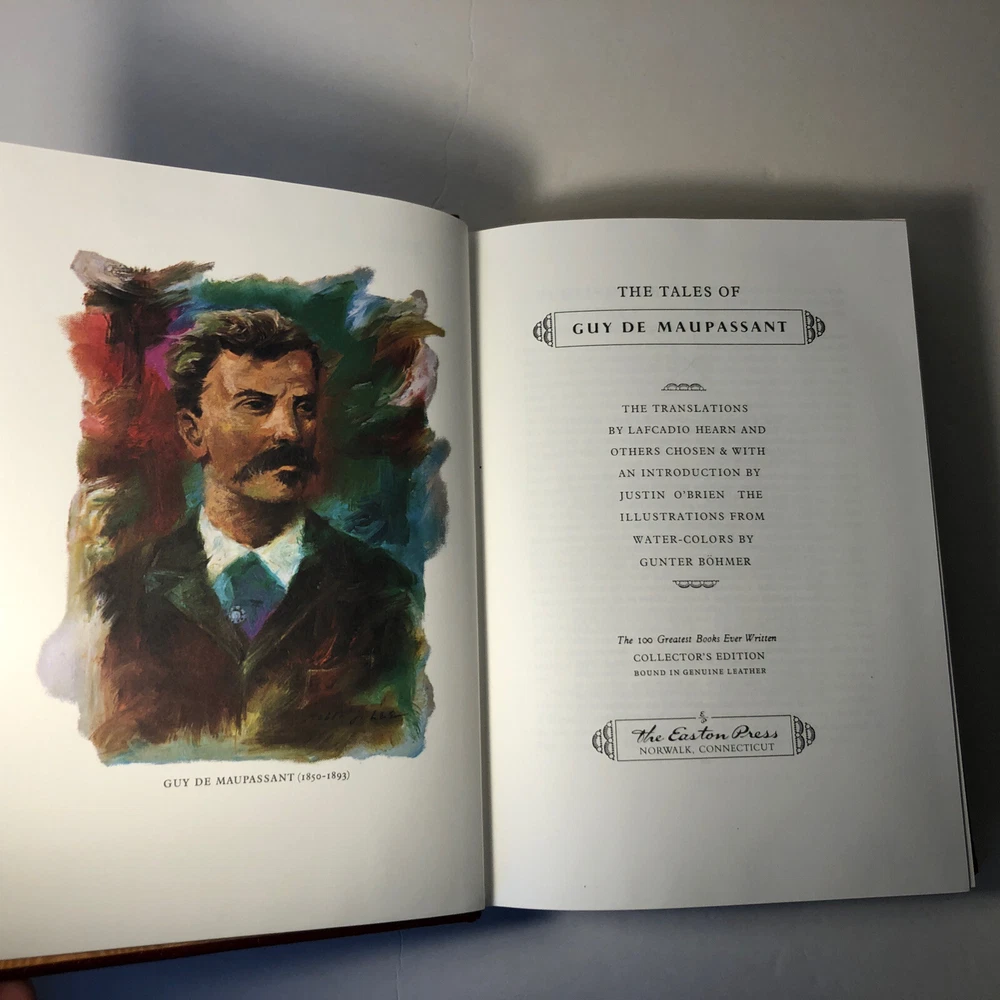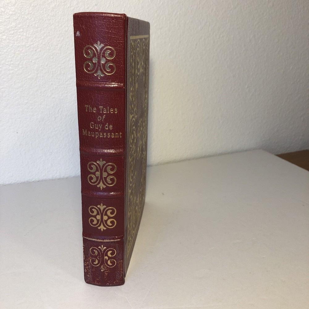 The Tales of Guy de Maupassant Easton Press 1977 Leatherbound Collectors Edition. X- library, there are library stamps and notations. One corner has a small tear. The spine has a little wear at the bottom. Interior looks new and unread. Wonderful French stories. Also great for shelf decor.