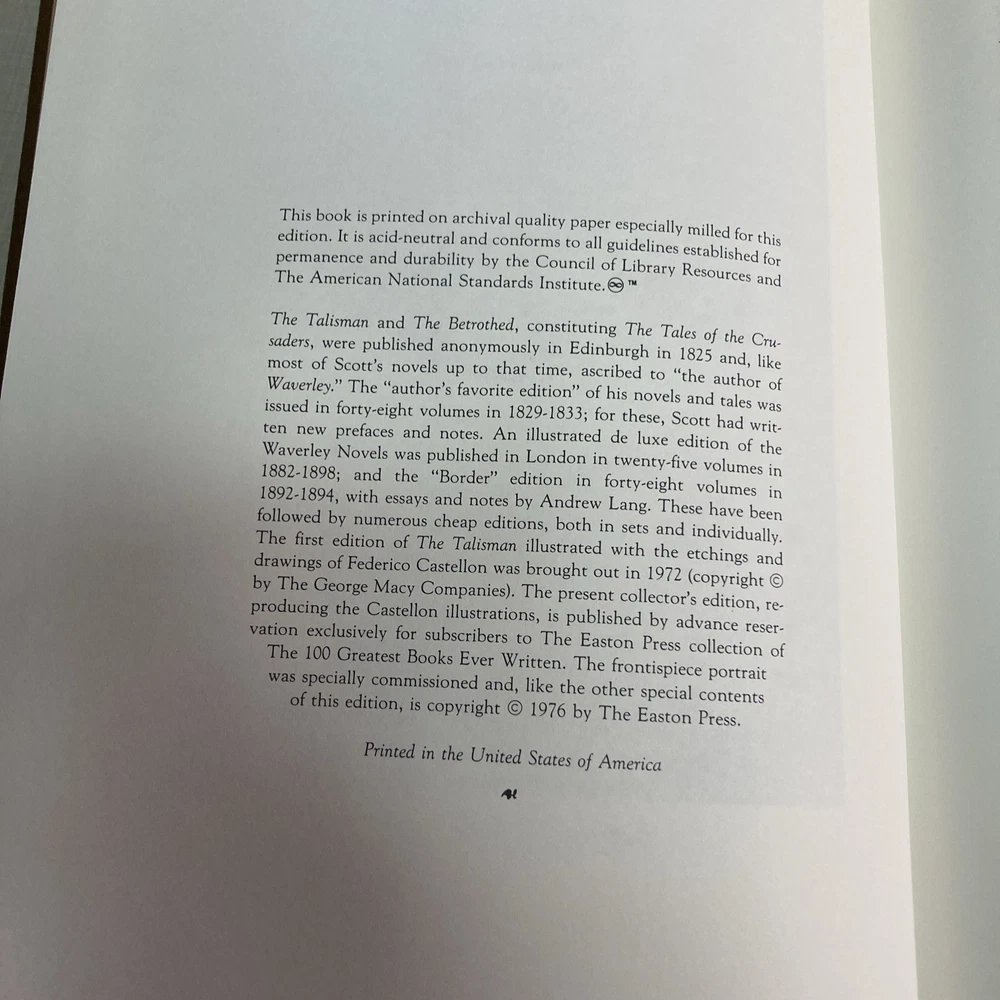 The product is a collector's edition of "The Talisman" by Sir Walter Scott, published by Easton Press in 1976. This leather-bound book features illustrations by Frederico Castellon and is part of the Classics genre. The book was published in Norwalk, Connecticut, making it a piece of North American literature and fiction. The edition is a special collector's item with high-quality binding and English language content, perfect for collectors or fans of classic literature.