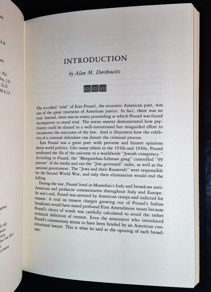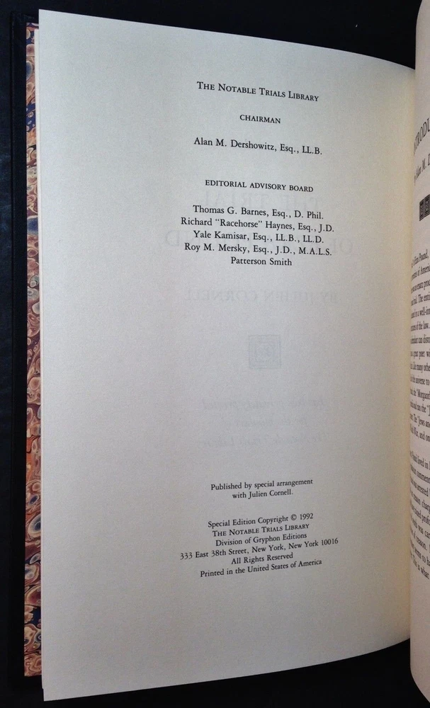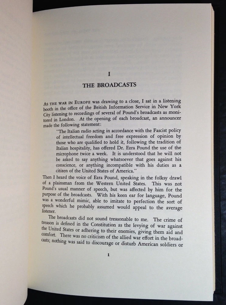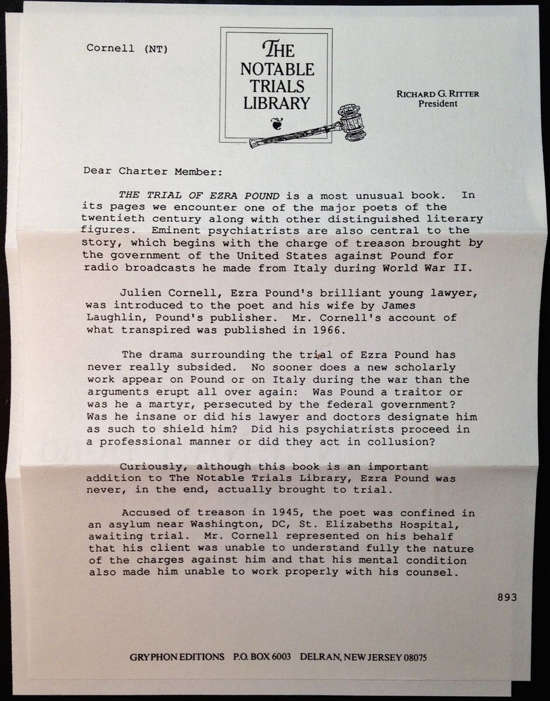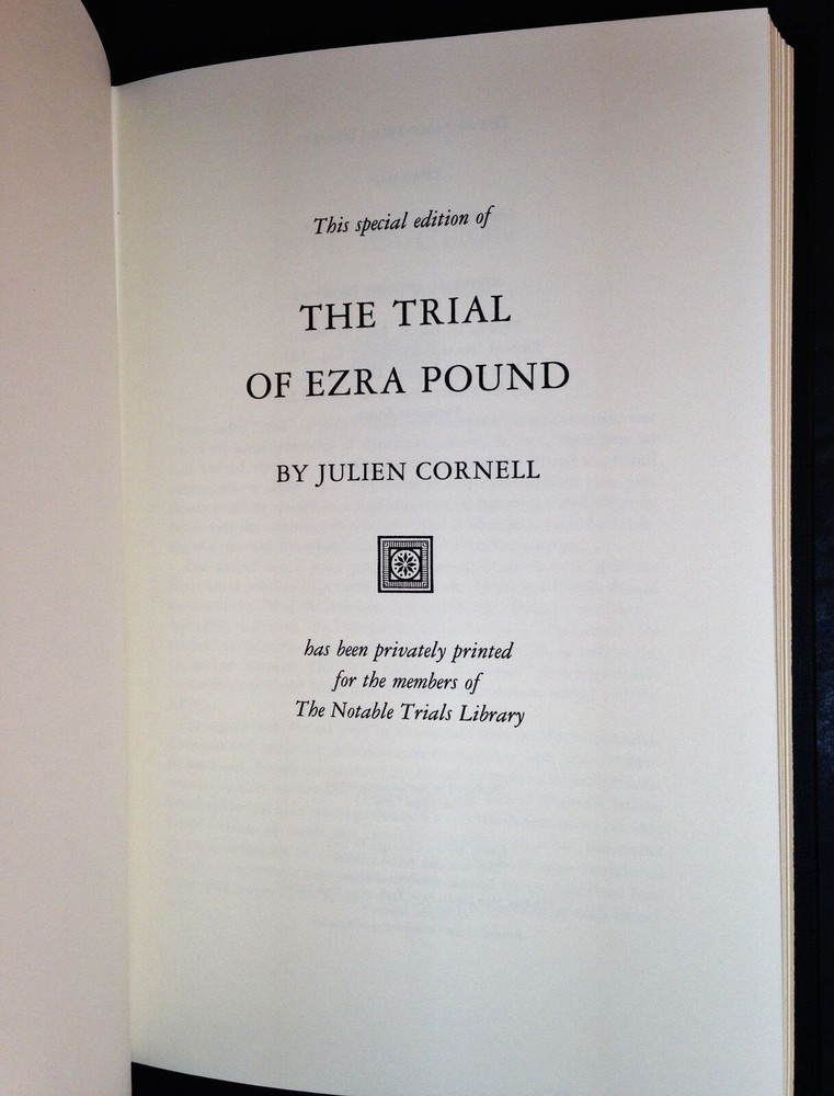 The Trial of Ezra Pound Julien Cornell Gryphon Editions Notable Trials Library The Trial of Ezra Pound Julien Cornell Gryphon Editions Notable Trials Library The Trial of Ezra Pound by Julien Cornell Published by Gryphon Editions, New York, N.Y. 1992. This book is in new, unread condition, with little to no signs of shelf wear. The Notable Trials Library Series includes books about famous and important legal trials throughout history. This handsome series contains quarter leather-bound volumes with beautifully marbled end papers, historical photographs and illustrations throughout. Included is a letter of introduction from President Richard G. Ritter to charter members of the library. We will be happy to combine shipping, wherever possible. Some items cannot be combined because of their size, weight or because they are fragile. Please ask if you have any questions. Your order will ship by the next business day after receiving payment. All items are from a smoke-free environment. Thank you, and Happy Reading!