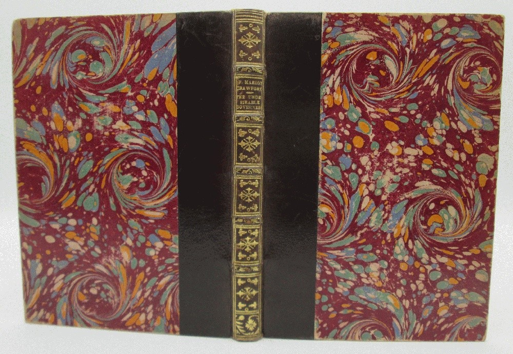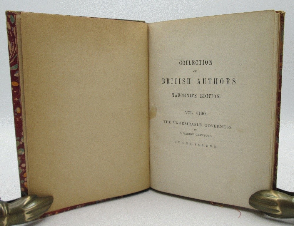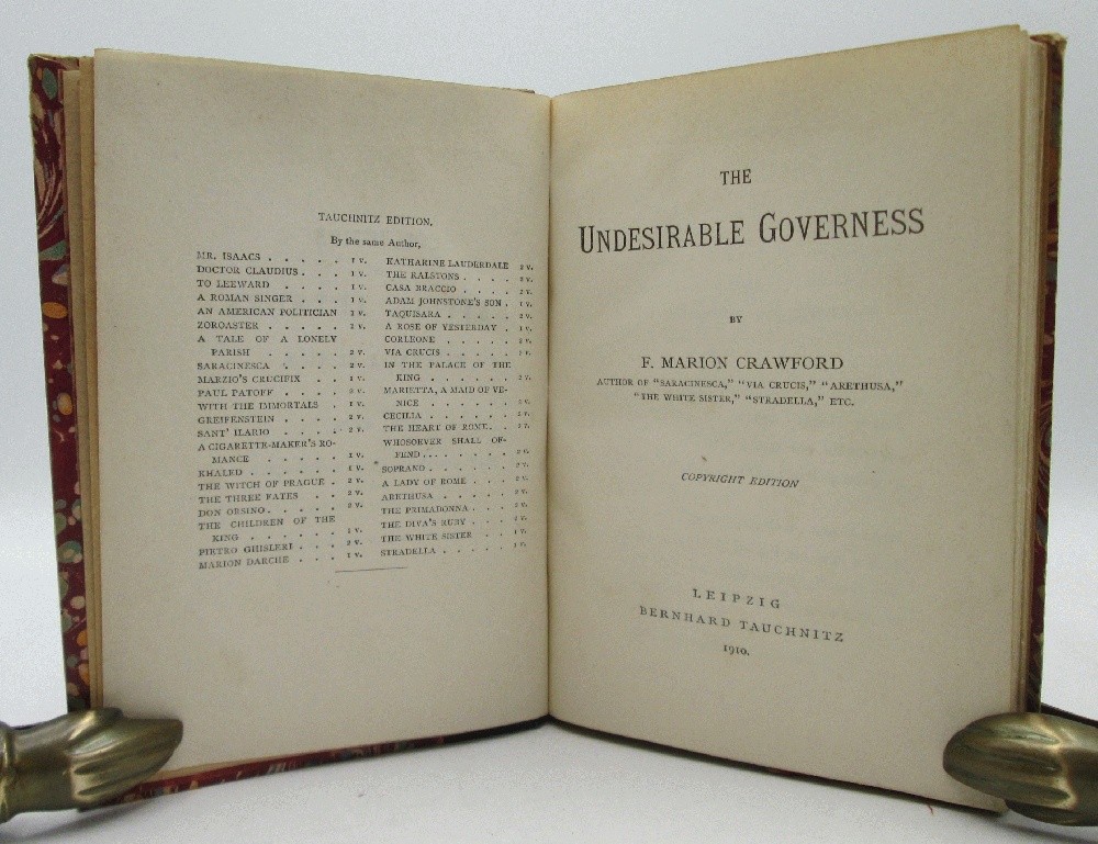 Ivy Ridge Books presents ... The Undesirable Governess by F. Marion Crawford (Fine Binding) Author: F. Marion Crawford Publisher: Bernhard Tauchnitz Release Date: 1910 Seller Category: fine bindings Qty Available: 1 Condition: Collectible: Very Good Sku: 10598 Notes: First European mainland edition (English Language) F. Marion Crawford novel is bound in brown leather and marbled paper. The edges are rubbed, paper scuffed, spine has light rubbing, corners a little bumped. Bookplate of Ogden Codman, Jr on the inside front cover. Codman was a successful architect and interior designed and he wrote a book with Edith Wharton. He decorated homes for two Vanderbilts, John D. Rockefeller Jr, Edith Wharton. He was a gay man who married a woman, as was the custom of the day. The binding is signed by a Paris bindery Bonneal. All orders packed with care, dust jackets protected by Brodart sleeve, independent bookseller since 2011 Don't forget to check out other great deals in our eBay Store!!