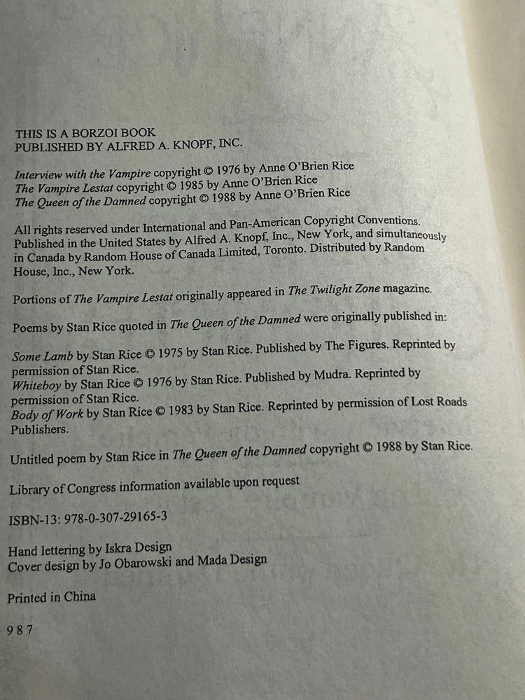 The Vampire Chronicles a Hard Cover Book Special Collectors Edition. The hypnotic, deeply seductive novels of Anne Rice have captivated millions of fans around the world. It all began a quarter of a century ago with Interview with the Vampire . Now, in one chilling volume, here are the first three classic novels of The Vampire Chronicles . ** In Interview with the Vampire , witness the confessions of a vampire. A novel of mesmerizing beauty and astonishing force, it is a story of danger and flight, love and loss, suspense and resolution, and the extraordinary power of the senses. ** The Vampire Lestat focuses on Lestat, who was once an aristocrat from pre-revolutionary France, but now a rock star in the decadent 1980s. Lestat rushes through the centuries seeking to fathom the mystery of his existence. His is a mesmerizing story–passionate and thrilling. ** In Queen of the Damned , Akasha, the Queen of the Damned, has risen from a 6000-year sleep to let loose the powers of the night. She has a marvelously devious plan to “save” mankind–in this vivid novel of the erotic, electrifying world of the undead. The Vampire Chronicles is part of Barnes & Noble’s series of quality leatherbound volumes. This book is now out of stock and out of print. Each title in the series presents a classic work in an attractively designed edition bound in genuine bonded leather. Book ISBN-13 number 9780307291653, p ublished in 8/30/2009 features approximately 1296 pages, has bonded leather binding, elaborate foil-stamped covers, a red silk ribbon marker, special vintage gold gilt pages edges. This book is pre-owned in overall good condition. All pages are crisp without folds, tears, notes, stains or other markings. The spine and binding is great and tight. This book isn't sold nor comes with a added dust jacket. The cover has some dents and discoloration in the black print on silver leather cover due to age and storage. The antique gold gilt on outer edges pages is a bit worn off again due to age, usage and storage. Please see all photos and the video for precise details.This books make elegant additions to any home library. * Make sure to carefully view photos for overall condition as part of factual description and reference. Please Note: I photograph in various light setting, also different monitors or devices may display colors slightly differently. * Feel free to message me with additional questions or if something isn’t described or shown clearly prior to your purchase. * Item is re-wiped clean prior to storing away for sale. * Choose from the available shipping options at checkout. (keep in mind this book is very heavy and large, evidenced by the price for shipping cost). Item will be securely packed in thick cardboard box with packing material with care to arrive safe and undamaged. * Free local pickup in N Las Vegas, NV after item is paid for on eBay. * No international shipping. No third party shipping. Final Sale. No returns. Thank you. * Upon satisfactory receipt of purchase, we ask that Buyer leave feedback. After that final completion of transaction, we will leave feedback for Buyer. #1476