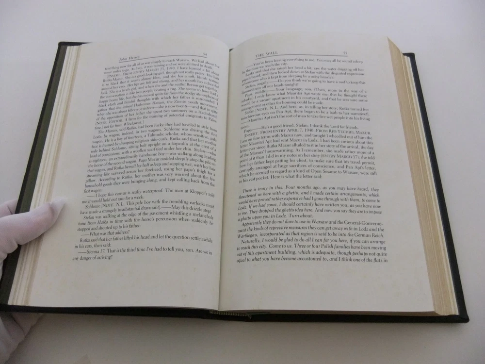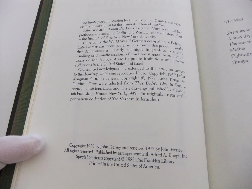 DESCRIPTION AND CONDITION Up for sale is a 1982 signed Limited Edition of the Franklin Library - The Wall by John Hersey. Illustrated by Luba Krugman Gurdus. It includes the “Notes From The Editors” booklet. Full decorative leather bound accented in 22kt gold, silk inside covers, printed on archival paper with gilded edges. Part of the Franklin Library Limited "Signed 60" Collection. There are some yellow mottling/smudges of pages especially the first few pages in from the hard cover up front but also scattered throughout the book. I have shown example pictures of what I consider the worst. There is also some dulling/wear to the gilt edges as well. The booklet has browned on the edges and spine. Please review the photographs and email me if you have any questions or want additional photographs. I mainly sell used older items including antiques, collectibles and oddities so please expect some signs of wear from use. I will identify or describe any unusual or notable wear and damage in the description of the item or in the photographs but please email me if you have specific concerns I have not addressed. Please contact me if you experience any issues viewing or trying to purchase this item. SHIPPING and RETURNS Domestic Sales: Please let me know if you’re unhappy with any item(s) for any reason and I will refund you your money less my shipping costs once I receive the item(s) back. If there is damage, or I have not described it accurately, or shown defects or the product well I will do a complete refund and pay for your return shipping. International Sales: I ship through the Ebay International Shipping Program. Please refer to their policies for specifics that apply to the buyer. Multiple purchases will be combined for shipping when possible. I might discount for multiple purchases. Please contact me first before buying so that we can adjust the prices. If you want to ship to a PO Box please check with me before combining purchases as some items can only be shipped by FedEx or UPS and they do not deliver to PO Boxes. With the ever changing costs and regional service adjustments by all shipping services I will choose the best value/service depending on your location. If you have concerns about this please contact me before bidding/buying.