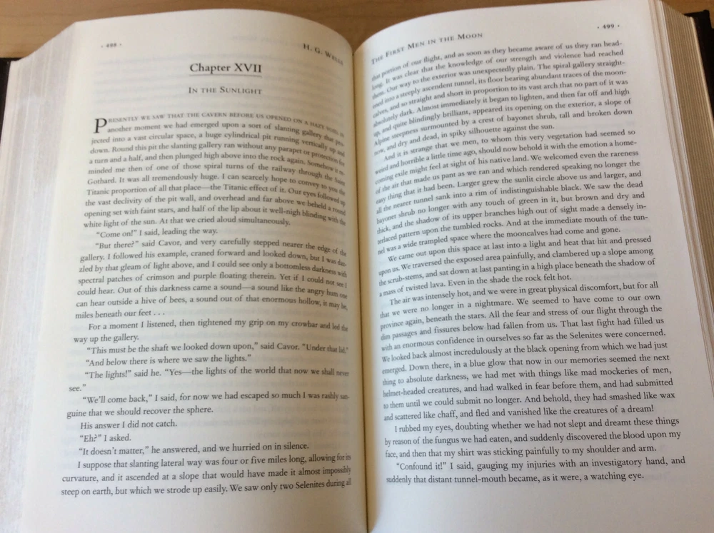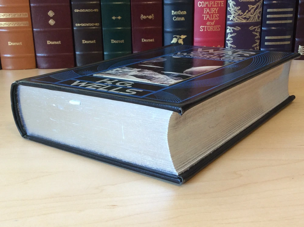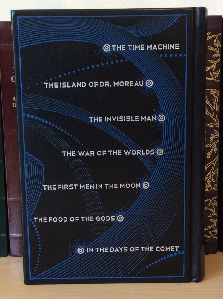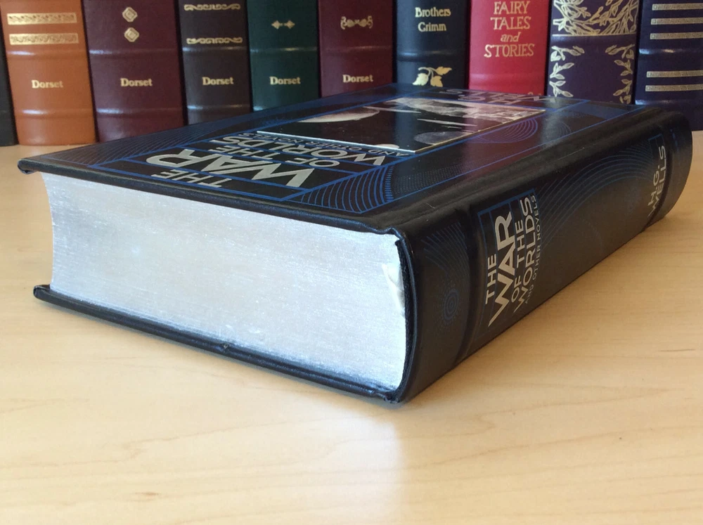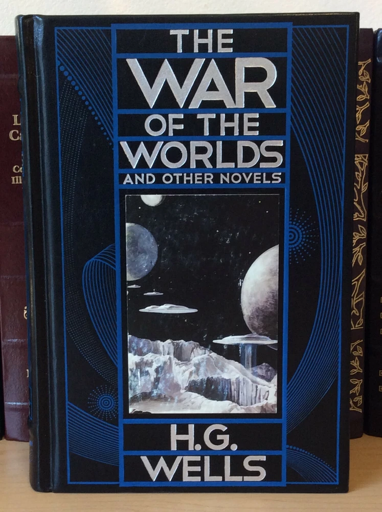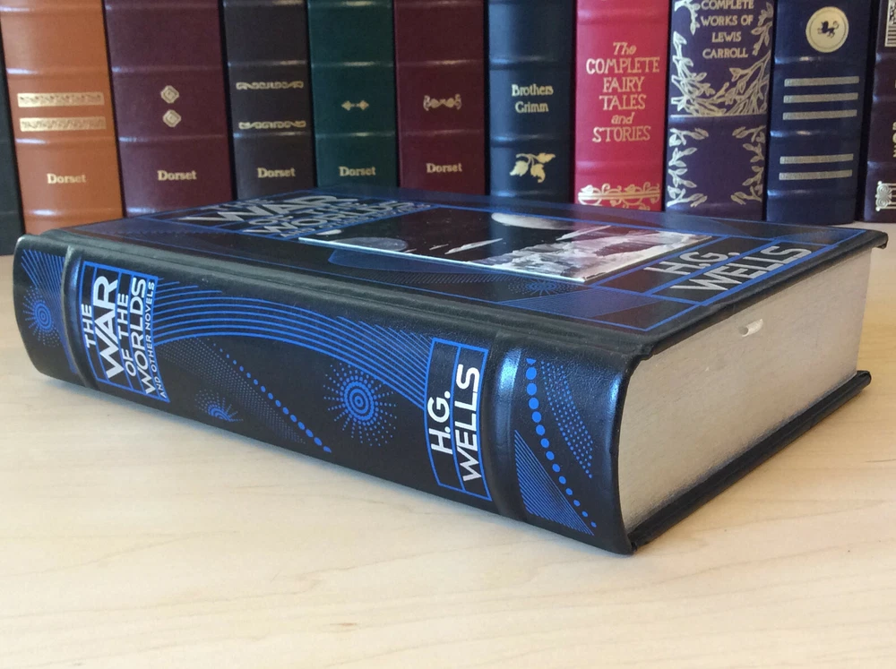 The War of the Worlds and Other Novels by H.G. Wells bound in leather, with silver edged pages and a ribbon marker Contents Introduction The Time Machine The Island of Dr. Moreau The Invisible Man The War of the Worlds The First Men in the Moon The Food of the Gods In the Days of the Comet Item Condition: This is a leatherbound hardcover in Very Good condition. There are no names, bookplates or stamps from previous owners inside. The pages are clean and the binding is sound, there is a slight sag to the print block (see last photo). The silver page edging is bright and shiny, with some dings and marks. The leather is in nice condition with some wear on the corners, which also have minor bumping and a small ding on the back top edge (see photos #6 & last photo). The picture on the front cover has some light scrapes / wear to it. Dimensions are approx: 9.5" x 6.25" x 2" This book will ship in a box with bubble wrap. Photos are of the actual book that will be shipped.