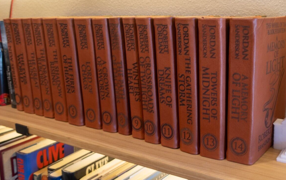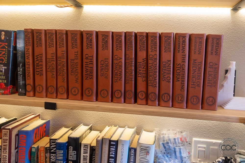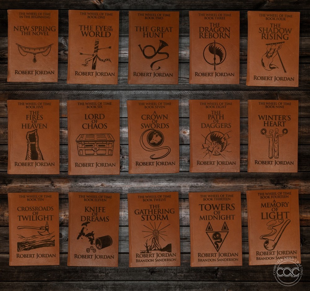 Introducing The Wheel Of Time Complete Epic Series leather-bound for added protection and style, now available with new custom cover art! The best-selling series of books, the Wheel of Time series by Robert Jordan and Brandon Sanderson deserves to be protected and cherished. By choosing this leather-bound collection, you’re giving your book a longer life because nothing is as good as a leather-bound book. Each set is handmade with unique leather patterns and natural imperfections, which are signs of real leather. With our laser-etched and hand-dyed leather, you are transforming the books into a beautiful collection that you can proudly display on your bookshelf. Each set includes the 14 main books, and New Spring the prequel novel. Please note, leather is a natural material which will have natural variations in coloring and texture. Books are made to order and hand-bound; normal completion time is 3 weeks, but due to demand this frequently becomes longer, if you are time sensitive please contact me before ordering for an estimate on my current queue time.