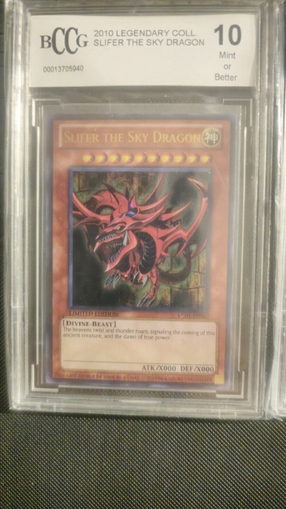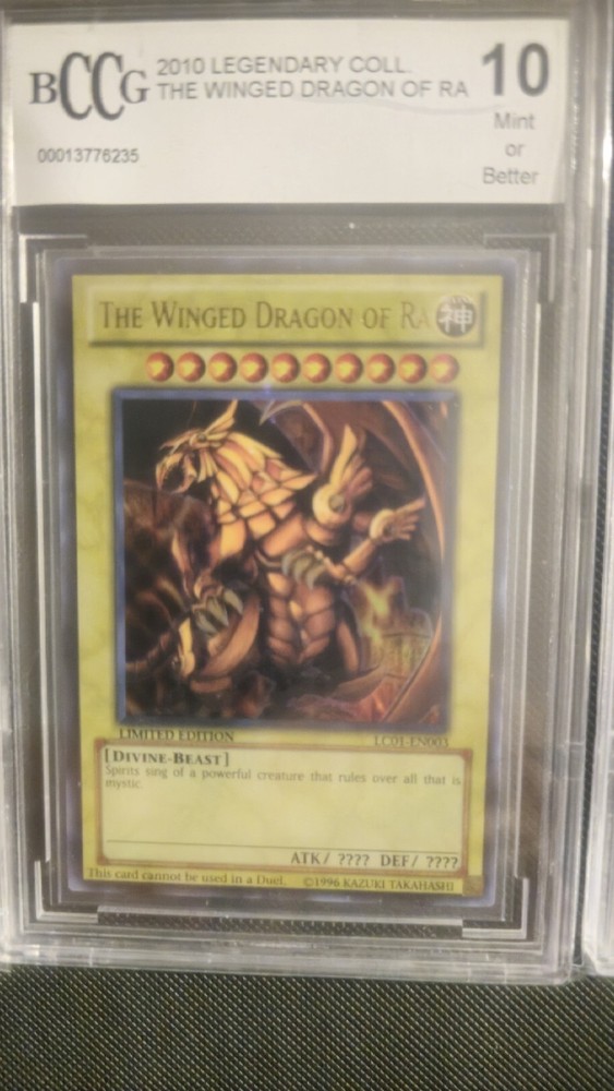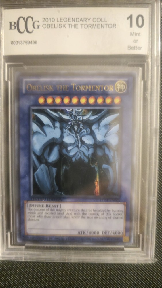 For avid collectors and fans of the Yu-Gi-Oh! Trading Card Game, this limited edition collectors' set features the ultra-rare The Winged Dragon of Ra, Obelisk The Tormentor, and Slifer The Sky Dragon cards. These cards are from the Legendary Collection set, manufactured by Konami, and come with a foil finish. BCCG 10 graded The cards are suitable for ages 6 and up, and are not autographed. They are perfect for anyone who wants to add to their collection of CCG individual cards. Don't miss out on the chance to own these highly sought-after cards.