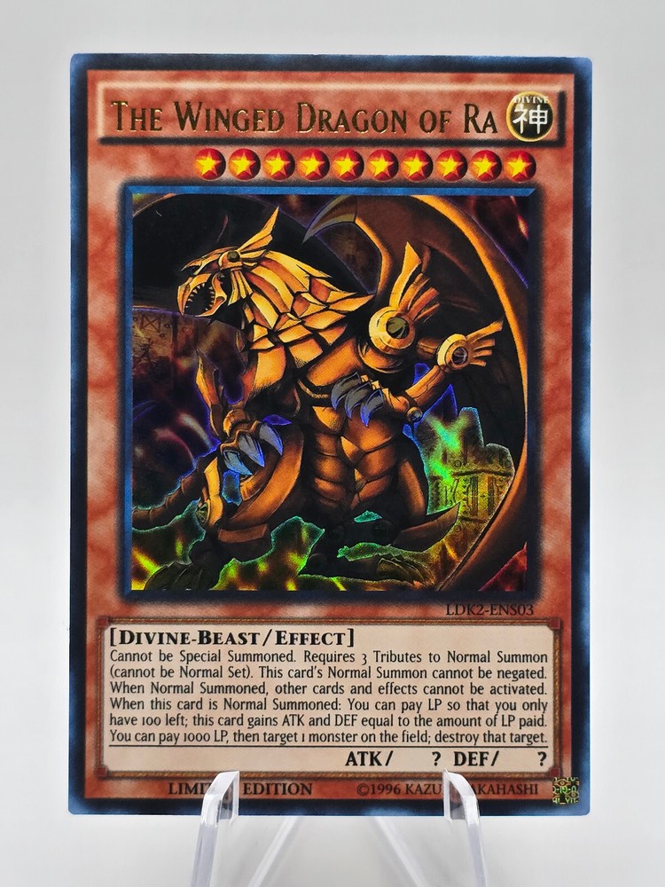 This listing will guarantee you a Near Mint, Ultra Rare, The Winged Dragon of Ra from Legendary Decks II. The card will be in a card sleeve, top loader and team bag. All of which will be placed inside a semi sturdy card and envelope then shipped. Yu-Gi-Oh - The Winged Dragon of Ra, LDK2-ENS03, Limited Edition, Ultra Rare, Near Mint Please keep in mind, if I have multiple of the same card or reuse this listing in the future the picture above my not be the exact card that will be shipped. But the card will be a Near Mint single with the same Name, Card number, and Rarity as listed in the title and at the top of the description. Legendary Decks II set description: Each set contains: A 40-card Deck based on Yugi's "Exodia the Forbidden One" and "Dark Magician", plus 3 Ultra Rare promotional cards (the tournament-legal versions of the Egyptian God cards) and an Ultra Rare Yugi Token card A 43-card Deck based on Kaiba's "Blue-Eyes White Dragon", plus an Ultra Rare Kaiba Token card A 43-card Deck based on Joey's "Red-Eyes Black Dragon" and Gemini monsters, plus an Ultra Rare Joey Token card 3 Secret Rare promotional cards: "Eternal Soul", "Dark Burning Attack", and "Dark Burning Magic". The Kaiba and Joey Decks each include the following: 3 Ultra Rare cards 40 Common cards 1 Token The Yugi Deck includes the following: 6 Ultra Rare cards 37 Common cards 1 Token
