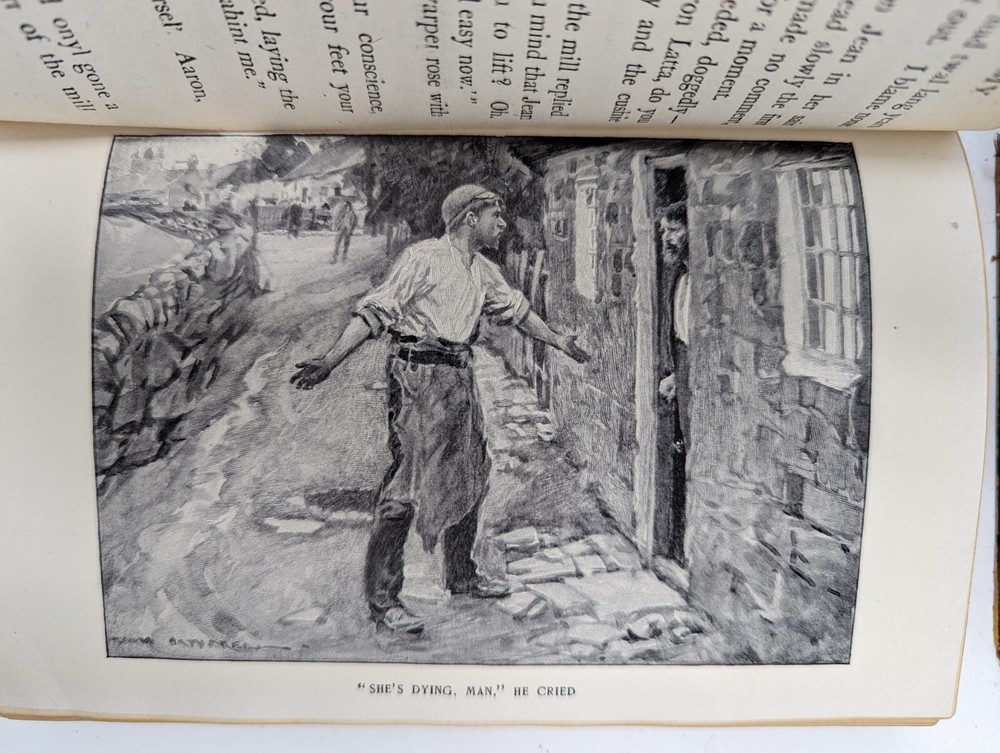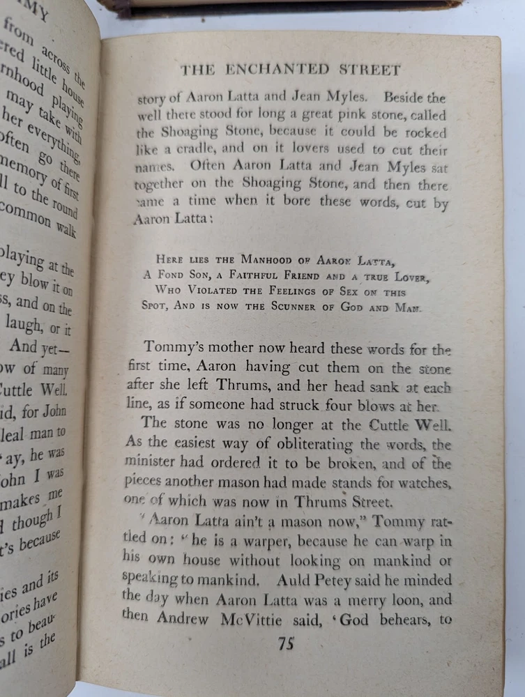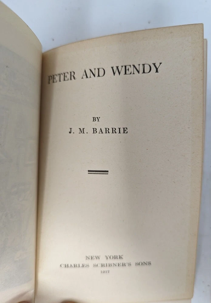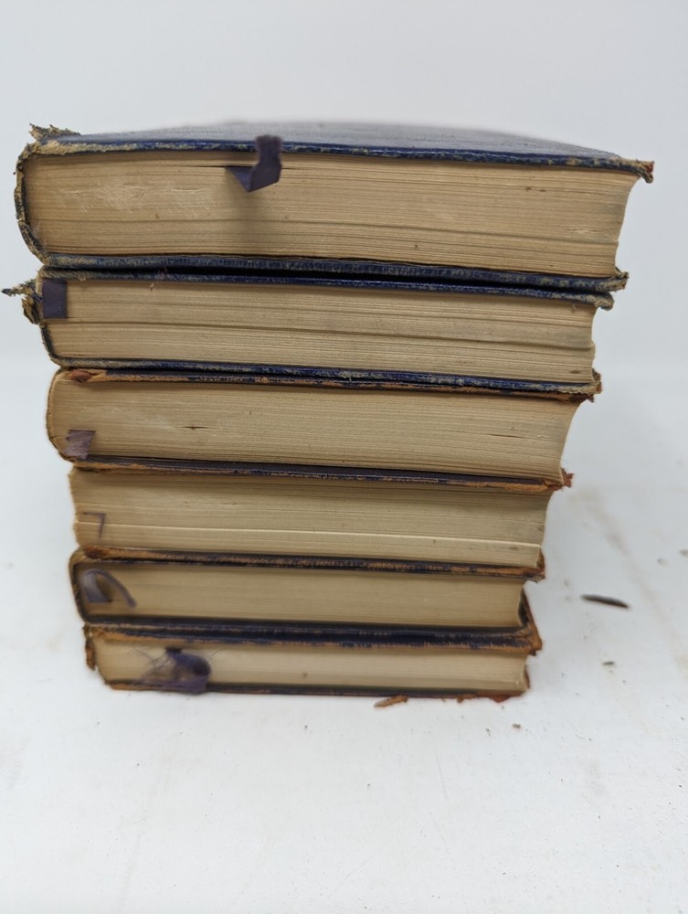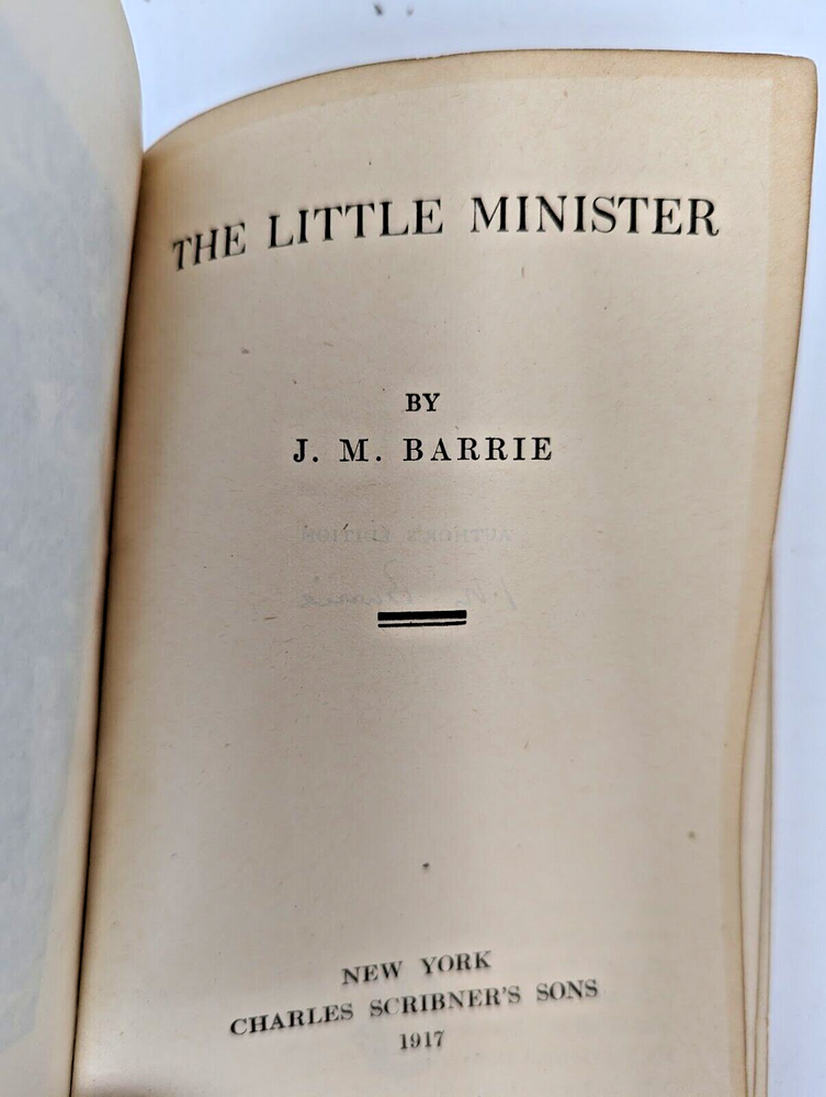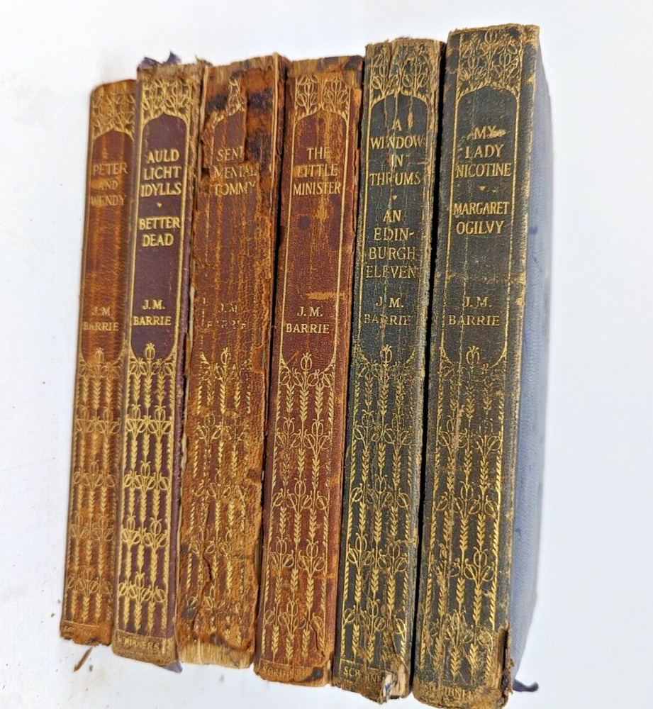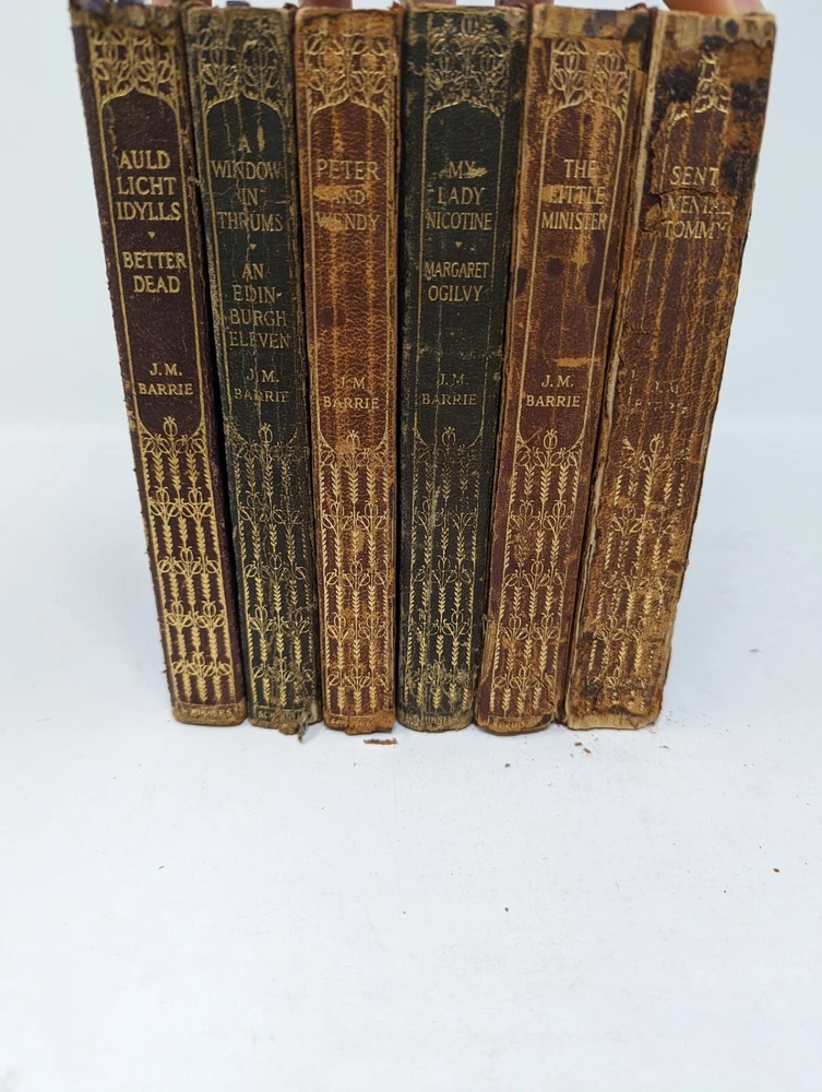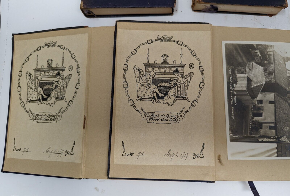 This is a set of six of the ten-volume Pocket Edition, Limp Leather Barrie titles Scribner's published in 1917. All the books are bound in soft blue leather with silk ribbon place markers, gold on the top page edges, and tissue-covered frontispiece illustrations. Owners bookplate of Loring Dodd, Professor of Art and Literature at Clark University, acquaintance of Robert Frost, author and illustrator of a series of children's books written by his wife Ruth Dodd. The Dodd's made notes of favorite phrases in each book and captured these on loose paper then adhered to the endsheets. Also included are vintage postcards of Barrie's home in Scotland, and a copy of the address he gave when made Rector of St Andrews University.