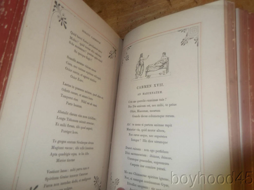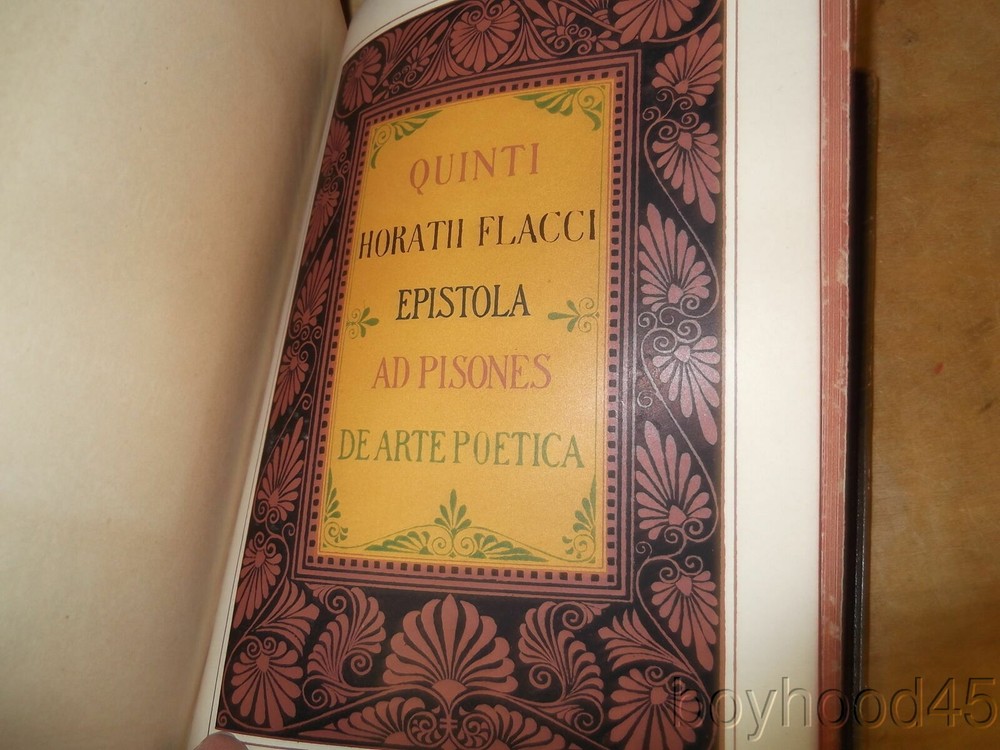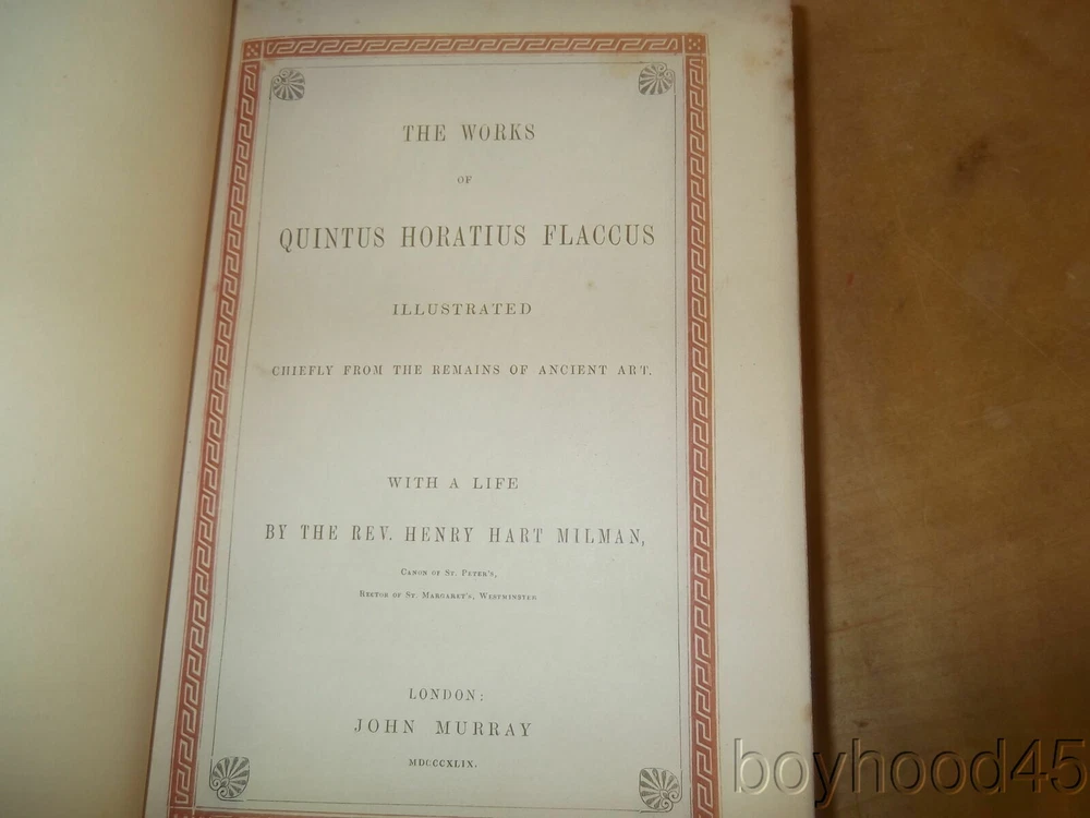The Works of Quintus Horatius Flaccus by Henry Hart Milman-1849, LEATHER Description The Works of Quintus Horatius Flaccus by Henry Hart Milman-1849, LEATHER This is "The Works of Quintus Horatius Flaccus Illustrated Chiefly From the Remains of Ancient Art. With a Life" by Henry Hart Milman. Published by John Murray, London, 1849. Bound in decorative, full leather binding. Contains all of the chromolithographed chapter heading pages. Light wear and leather scuffing. Front cover hinge is cracked, but book remains quite tight. There is some chipping to red painted page edges. Name appears. A very solid, Very Good copy!!!Measures 6 3/8 X 8 3/4, 504 pages. A few copies of this work can be found on other internet booksites for upwards of $2000!! I will offer this very nice copy for only $285.00 plus $5.00 S&H in the US. PLEASE NOTE: SHIPPING FOR THIS HEAVY BOOK WILL BE $5.00. Shipping costs to Canada will be considerably less than the general international rates quoted. Thanks for shopping mellowpagesrarebooks.com Payment I accept the following forms of payment: PayPal Shipping & Handling I will ship Priority for an additional fee upon request. PLEASE NOTE: SHIPPING COSTS FOR MULTI-VOLUME SETS OR OVERSIZED BOOKS WILL EXCEED THE STANDARD "US SHIPPING" ECONOMY RATE OF $5.00. COST OF SHIPPING OVERSIZED BOOKS OR MULTI-VOLUME SETS ARE SPECIFIED WITHIN THE TEXT OF THE LISTING. Canadian buyers are not subject to stated international shipping costs and will pay less than the amount stated. US Shipping $4.00 USPS Media Mail® International Shipping $66.50 USPS Priority Mail International FREE scheduling, supersized images and templates. Get Vendio Sales Manager. FREE scheduling, supersized images and templates. Get Vendio Sales Manager. Condition Notes: A very nice, tight copy!! Payment Payment Options: Paypal Shipping Shipping Options: Domestic shipping: Fixed Shipping Charges. International shipping: Fixed Shipping Charges. Shipping Carrier Domestic International Shipping Locations Usps Book Rate $4.00 - - Usps Priority Intl - $66.50 Worldwide I will ship to: United States, Worldwide Vendio provides powerful selling automation for sellers of all sizes. Get business information that counts! - Vendio Counters are active content free.
