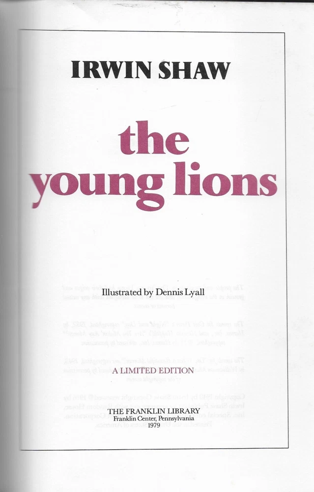 The Young Lions by Irwin Shaw Franklin Library, Signed Limited Edition You are bidding on The Young Lions by Irwin Shaw , and with illustrations by Dennis Lyall . Franklin Library , Franklin Center, PA published the book, special contents copyright 197 9 . Irwin Shaw signed the front blank flyleaf. The book is part of Franklin Library’s series Signed Limited Editions. The interior is in fine condition. There are no marks or tears. There are no signs of prior ownership . The page edges are richly gilded to seal out moisture. There are dust spots on the top and side edges. The beautiful leather cover is in fine condition. The attached silk bookmark is in fine condition. The book is 6 3/4 ” x 9 3/ 8 ” and 728 pages. *** Always communicate through the eBay message system .*** Please if you need any additional information and photos, eBay message me immediately. Combine Shipping Discount!!!!! Save money when you buy more than one item (lot) from us! Except in rare cases, s & h to a U. S. address via media mail in the same box is $1. 25 for each additional book. E B a y may automatically send a combine invoice with the wrong s & h. Please wait to pay until you receive my combine invoice with the correct s & h. PLEASE CHECK OUT MY E B A Y STORE AND OTHER AUCTIONS!!! 31320242024