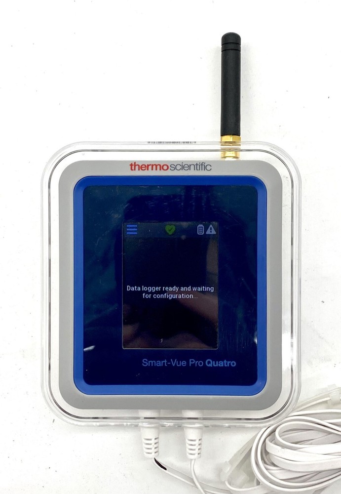 Smart-Vue Pro Duo/Quatro is the new generation of wireless data logger by Thermo Scientific. Smart-Vue Pro Duo/Quatro data logger can be used with either Smart-Vue Pro LoRaWAN or bluetooth wireless connectivity. Features: • Multi-parameter sensor monitoring with support for a variety of smart-sensors, digital and Pt100 sensors and 4-20mA sensors. • The Smart Connect mobile app supports monitoring of a single temperature sensor. • Automatic recognition of connected sensors. • Configurable high/low alarm limits, delays, alerts and transmission interval. • Calibration parameters embedded directly in Thermo Scientific Smart-Sensors (for ease-of-use and standard exchange for periodic calibration) with parameters downloaded automatically. • Unlimited data storage with Smart-Vue Pro web architecture. • Internal data logger memory for upto 4,000 readings per channel (8,000 total on Smart-Vue Pro Duo; 16,000 total on Smart-Vue Pro Quatro). • Alarm transmission upon detection. • ISO 17025 (COFRAC) calibration, in-house certified laboratory calibration or NIST traceable calibration. • Wireless connectivity with Smart-Vue Pro LoRaWAN (long-range, low-power wireless connectivity or Bluetooth Low Energy (shorter range). • Automatic wireless connection to Smart-Vue Pro LoRaWAN enabled receiver. • 2.4-inch color resistive LCD touch screen (supports operation with gloves). • Runs on two LS17500 batteries or optional 5 V USB adapter. • Integrated alarm buzzer for real-time alerts on-site. • Clear plastic outer ring lights to provide visual alert Lab surplus in good, used condition. Does not include login account information. Shipped from the USA within five business days of purchase.