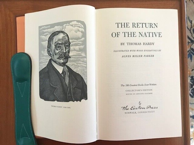 Thomas Hardy. The Return of the Native. Norwalk, CT: The Easton Press, 1978. Illustrated by Agnes Miller Parker. Bound in full leather with moire endpapers and a satin ribbon book mark. Gilt decoration and lettering on covers and spine. A.e.g. Book is in near fine condition.