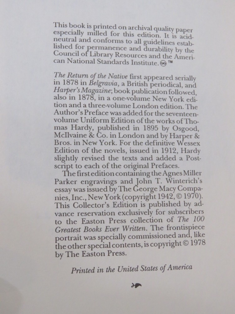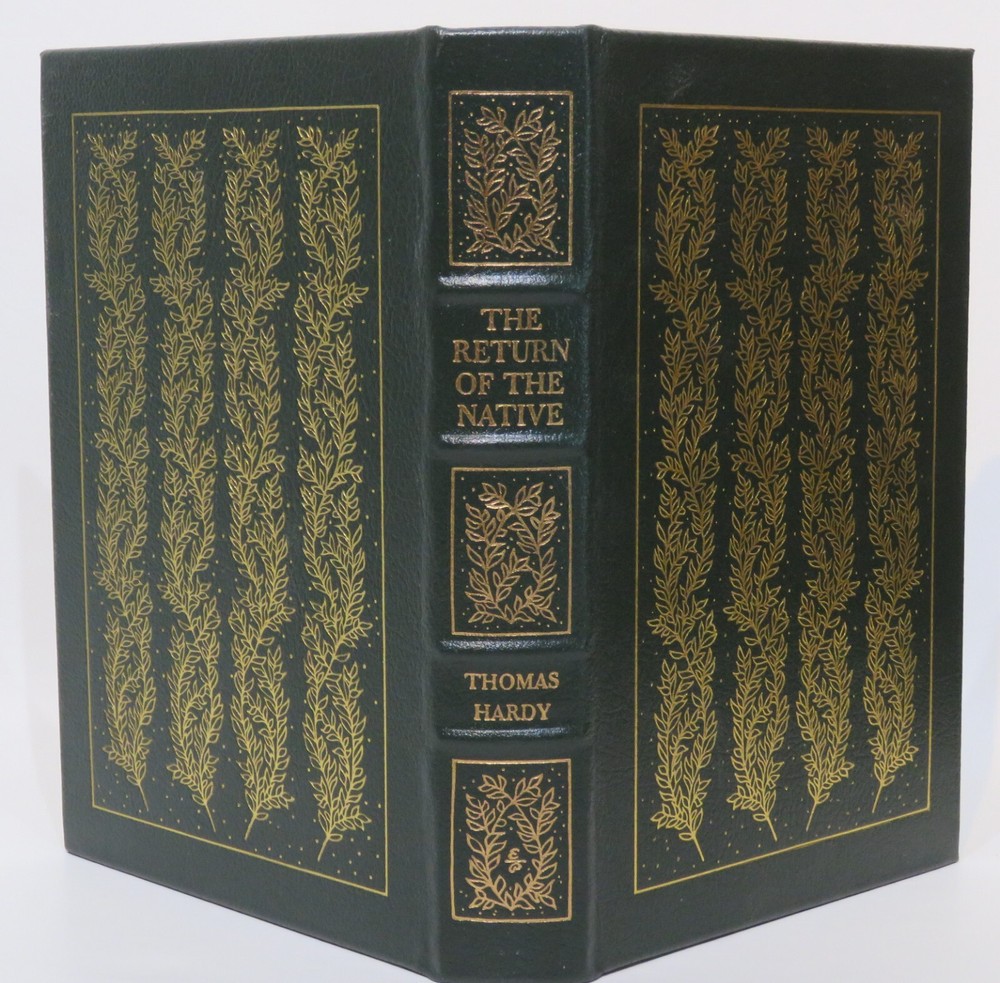INTERESTING INFORMATION: If you make multiple purchases and want to combine shipping please request an invoice before you pay . Please scroll over the item with the zoom feature to see detail. ITEM DESCRIPTION: To see other limited edition books please click this Link . Beautiful book with green leather binding and gold highlights as well as gilt page edges. This edition was originally copyright in 1878, Easton Press ©1978. Book interior is in like new condition. The book is excellent. Tempestuous Eustacia Vye passes her days dreaming of passionate love and the escape it may bring from the small community of Egdon Heath. Hearing that Clym Yeobright is to return from Paris, she sets her heart on marrying him, believing that through him she can leave rural life and find fulfilment elsewhere. But she is to be disappointed, for Clym has dreams of his own, and they have little in common with Eustacia’s. Their unhappy marriage causes havoc in the lives of those close to them, in particular Damon Wildeve, Eustacia’s former lover, Clym’s mother and his cousin Thomasin. The Return of the Native illustrates the tragic potential of romantic illusion and how its protagonists fail to recognize their opportunities to control their own destinies. Fully bound in genuine leather. 22kt gold deeply inlaid on the "hubbed" spine and cover. 22kt gold page edges. Sewn pages — not glued. Satin-ribbon page marker. Handsome marbled end pages. Printed and bound in the USA. The last photo shows other Easton Press books available in other listings. Again, please scroll over the item with the zoom feature to see detail. FINE PRINT ABOUT US We find the treasures you've been looking for! I treat all of my customers with the greatest courtesy. If you feel there is a problem please write. Hard to believe I know, but, I have made mistakes ~ and I'm pretty sure I haven't made my last one. The good news is that I always set my mistakes to right if given the chance. TERMS OF SALE Please look your item over carefully before you purchase (use the magnifier). I try very hard to take representative pictures and give details about the product so that you know what you are purchasing. If my detail doesn't answer your question please write. Thank you in advance. FINAL DETAILS If you purchase multiple items don't pay until I package them and invoice you. Please note that any photos in my listings are the real item. I don't use stock photos. Ask questions if I have not been clear in my listing before you bid. Enjoy shopping. Support your local merchant ~ and your friendly eBay seller. Visit my store when you get a chance. I carry a wide variety of interesting, useful, unique, and unusual items. This is a great place for gift shopping. I am always happy to combine shipping costs. PAYMENT Please make payment within 3 days of purchase. If you need more time please write. If you change your mind please write. SHIPPING PLEASE NOTE: Books, tapes, DVDs all ship by Media Mail. It's not the quickest but it will save you lots of money. If you need something quicker just let me know and I will let you know the new shipping charges and re-invoice you for the difference. PACKAGING: I use used boxes and fluff. I do this because I care about the planet and all who live here and my future generations. Just thought you should know. SHIPPING COSTS: I charge actual shipping to your location. SHIPPING TIME: I usually ship the same or next day after your purchase depending on whether my mail has already been picked up. If you purchase on a Friday after mail time I may not be able to ship until the following Monday. TIMELINE: When I ship you will receive a letter from PayPal with your tracking information. There is a link on eBay so you can check the progress of your package.