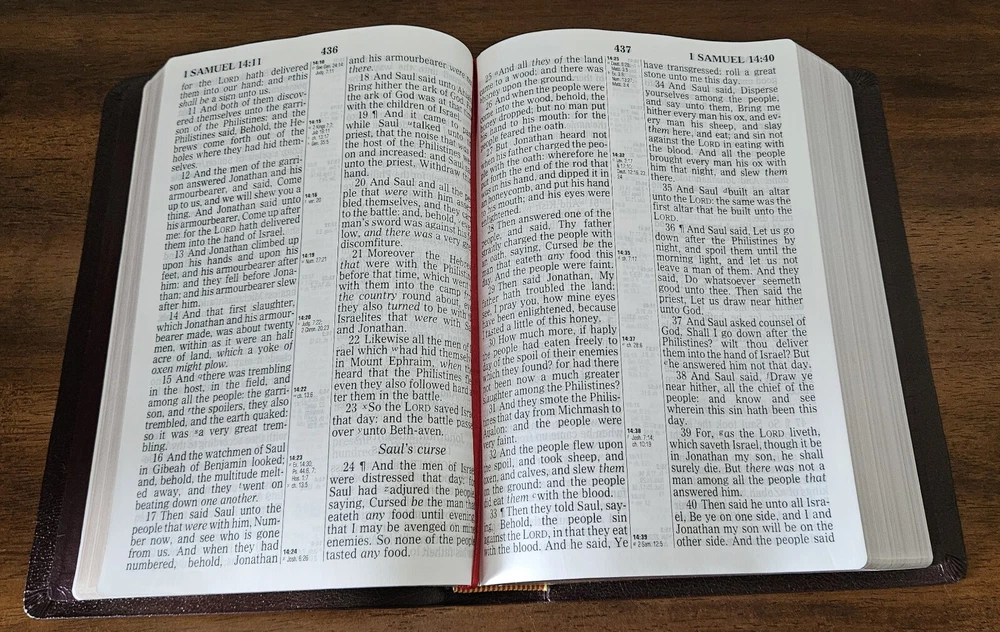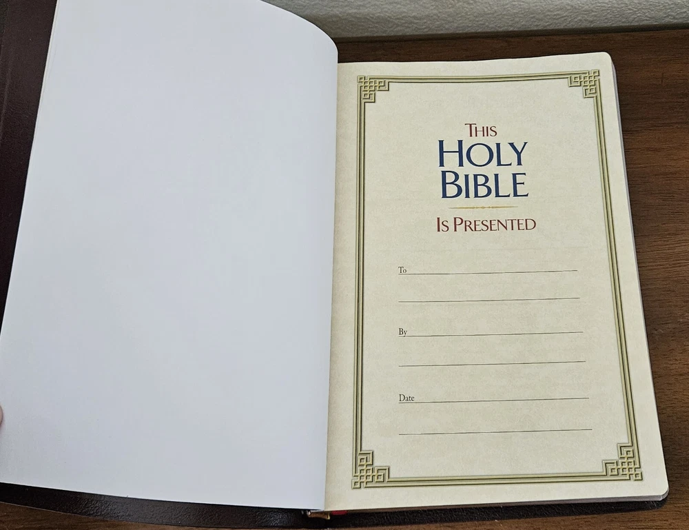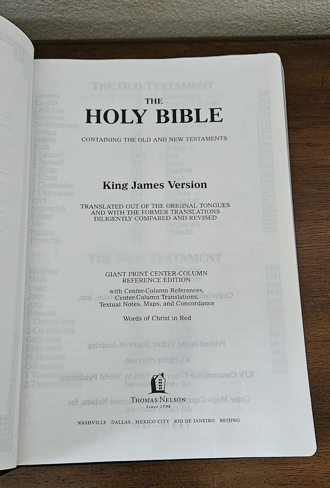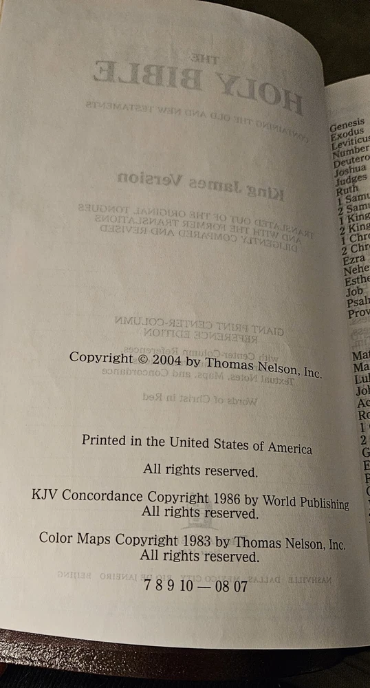 Thomas Nelson King James Bible. This KJV bible is the giant print center column reference edition. Copyright 2004. Clean, very minimal storage wear. No personalization, marking, or highlighting is found. Please look over the listing pictures, they are part of the description and show the exact item you will receive. I ship quickly, generally the next day if possible. R000.0CUA
