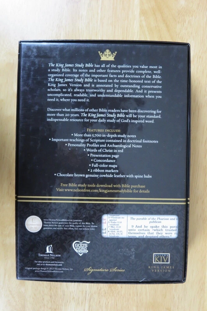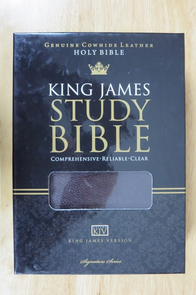 Thomas Nelson has been a reputable publisher of fine Bibles for many year. Though now simply an imprint of HarperCollins, many fine vintage editions from the publishing house still exist. This listing is one such Bible, specifically form the now out of print Signature Series line of fine Bibles. The King James Study Bible has all of the Qualities you value most in a study Bible. Its notes and other features provide complete, well-organized coverage of the important facts and doctrines of the Bible. The King James Study Bible is based on the time-honored text of the King James Version and is annotated by outstanding conservative scholars, so it’s always trustworthy and dependable. And it presents uncomplicated, readable, and understandable information when you need it, where you need it. King James Version Red Letter Text More than 5,700 In-depth Study Notes Important Teaching of Scripture Contained in Doctrinal Footnotes Personality Profiles and Archaeological Notes Words of Christ in Red Presentation Page Concordance Full-Color Maps 2 Ribbon Markers Chocolate Brown Genuine Cowhide Leather with Spine Hubs Approximate Cover Size: 9.75 x 6.75 x 2.00 inches
