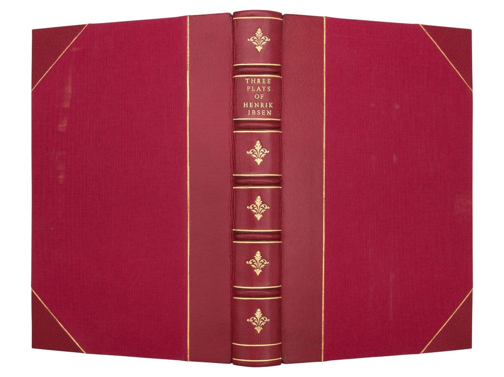 Three Plays by Henrik Ibsen An Enemy of the People, The Wild Duck, and Hedda Gabbler Illustrated by Fredrik Matheson Published by The Heritage Press, New York in 1965 Signed Custom Binding by the Harcourt Bindery FINE- Condition Binding Details: Signed custom binding by the Harcourt Bindery, Charlestown, Massachusetts bound in three-quarter morocco leather over complimentary cloth covered boards with raised bands to the spine, gilt titles and ruling, and decorative central gold gilt motifs. Single gilt lines to the boards and corners. There are hand-sewn silk endbands with the top page edges gold gilted. The Harcourt Bindery label appears on the bottom of the last free endpaper. Book Details: Published by The Heritage Press, New York in 1965, Three Plays of Henrik Ibsen: An Enemy of the People, The Wild Duck, and Hedda Gabbler that features black-and-white and color illustrations by Fredrik Matheson. From the publisher, “Ibsen’s three tragic, domestic plays herald the dawn of modern drama in their painful unraveling of the past and relentless examination of family relationships, light, dark, truth, and idealism.” Measures approximately 9.875” x 6.75” with 327 pages as well as an introduction by John Gassner. Condition Report: The binding is in FINE- condition with some minor surface wear to the rear board. Internally, the book is very clean with no signs of previous ownership. Overall, this is a beautiful binding that houses three plays by one of most respected playwrights of the nineteenth century. A photograph of the binding appears in the photo section of the listing.