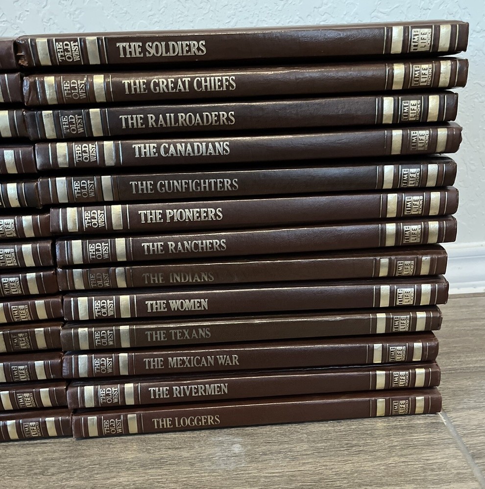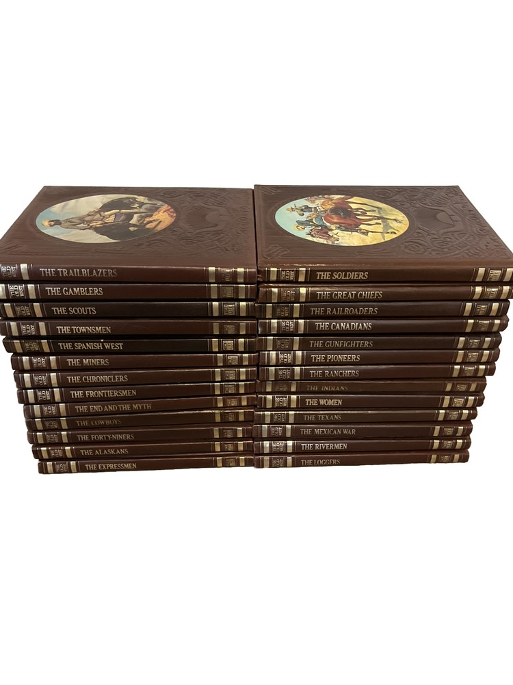 Some books are in mint condition, most are in very good condition! Excellent for staging! Discover the history of the American Old West with this complete set of 26 books from Time Life Books' "The Old West" series. Written in English and beautifully illustrated, this collector's edition set covers topics like Westerns, history, and military. The books come in a faux leather bound hardcover format and are perfect for young adults, ages 9-12, and adults interested in learning about the 1800s era of North America. Each book in the series covers a different subject, including regional cuisine, narrative nonfiction, and the original language of English. Published between 1973-1980 by Time-Life Books, this set is a wonderful addition to any Western, history, or historical genre enthusiast's collection.