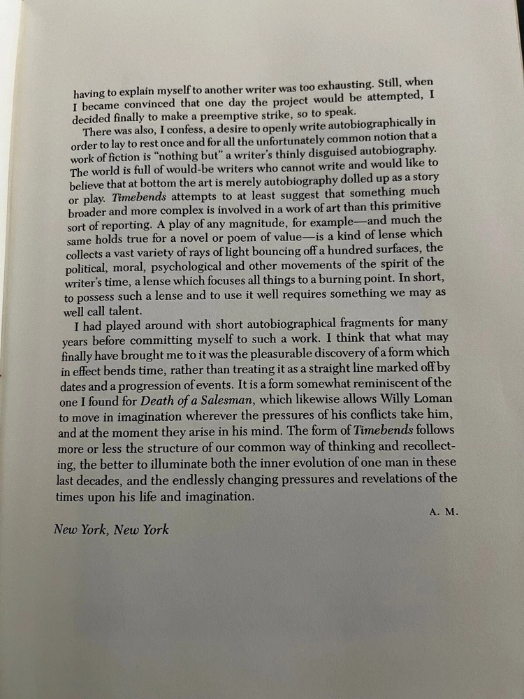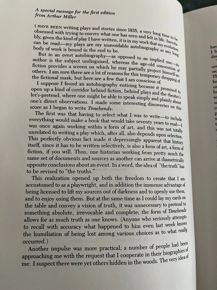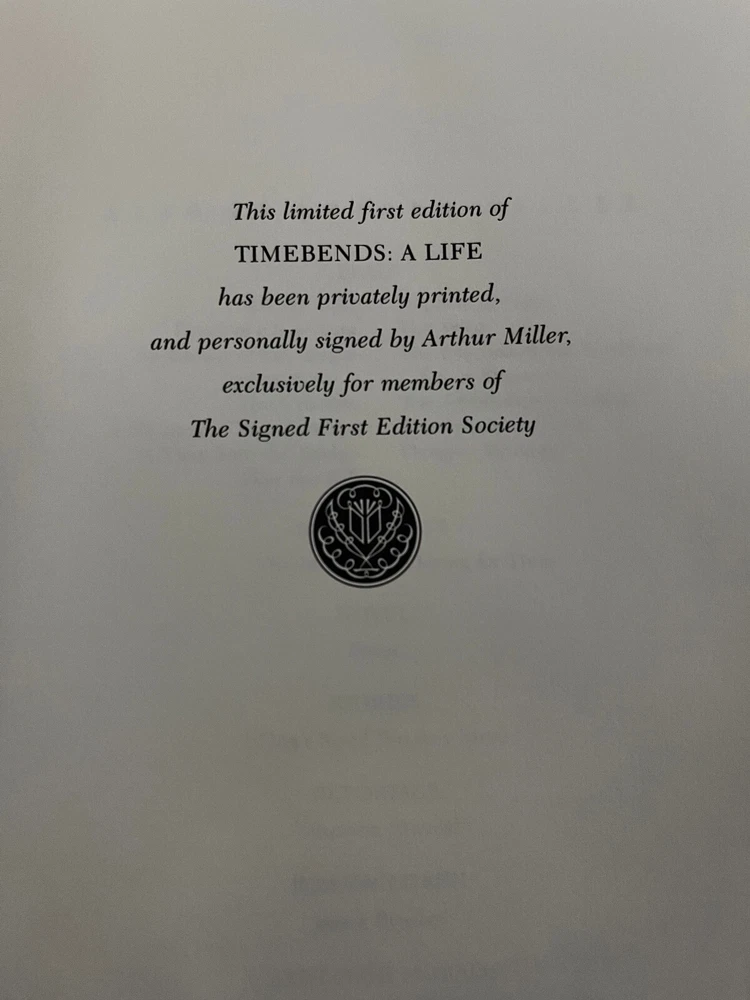 It is a Limited Signed First Edition, signed by author Arthur Miller. Bound in genuine leather, 22kt gold stamped spine and distinctive cover design Printed on acid-free archival paper. It has a sewn in satin ribbon page marker. Page edges are gilded. Published by Franklin Library in 1987. A moving autobiography of Arthur Miller.