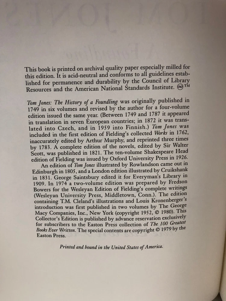Condition – Very Good Defects – The flyleaf and half-title pages have stains. The book is otherwise like new. Full title – The History of Tom Jones, A Foundling Author – Henry Fielding Format – Leather Notes – Easton Press Book Condition Guidelines We try to make sure that you know what your book will look like when it arrives. We describe any imperfections that we see, but don’t generally report small defects or closely examine every page. You can contact us if there is something specific that you would like to know about the book. Shipping We ship all our books with care. We know that shipping can be rough on a book, so we carefully wrap all our books. We always ship within 2 business days, and we will frequently ship your book the same day you purchase it. For our international customers, we can ship to you using eBay Global Shipping. Please contact us if you have any questions and thanks for looking! Why shop with us? · Accurate book descriptions – Our pictures are of the actual book you will receive. We diligently try to describe the book’s imperfections. · Quality shipping – We package our books carefully so that they will survive their journey. · Competitive prices – We sell our books for the going rate. We don’t gouge the prices. · Customer service – We generally respond to any questions within 24 hours and we work with our customers to provide an excellent experience.