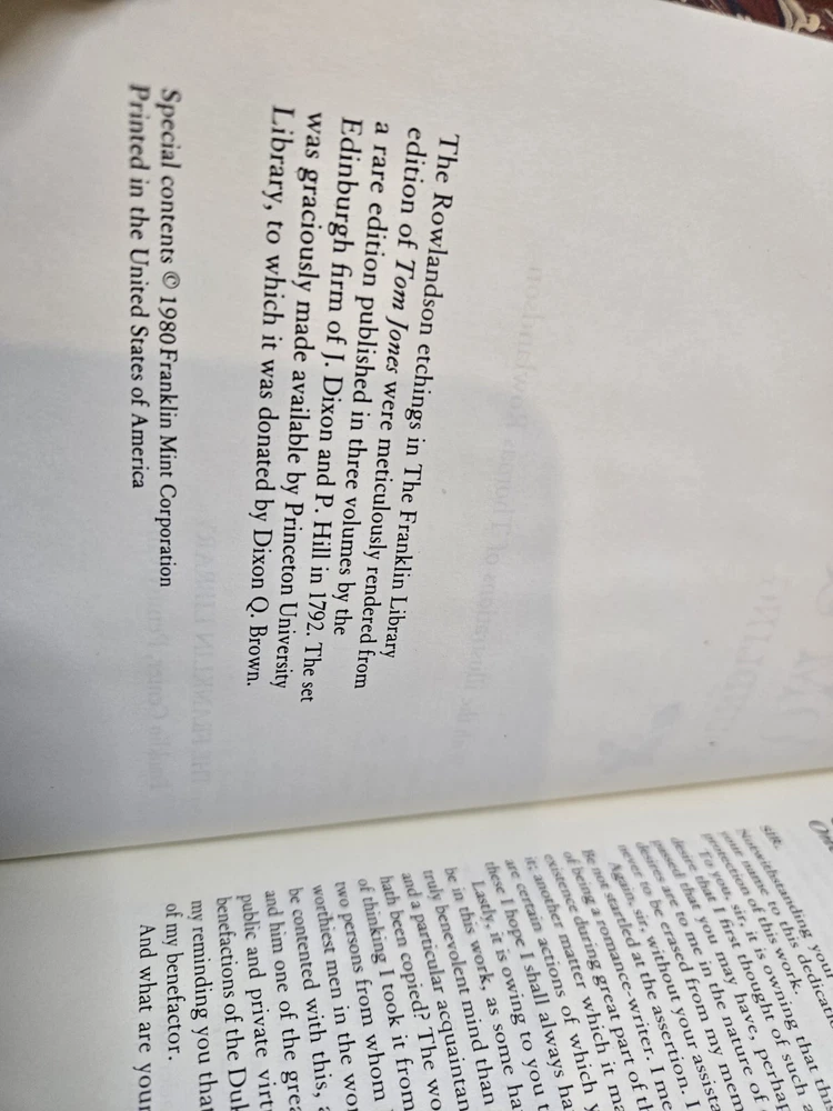 The product is a 1980 edition of "Tom Jones" by Henry Fielding, published by Franklin Library in the United States. It features a quarter-bound leather binding with gilded page edges, sewn-in book marker, and illustrations. The book is written in English and falls under the category of literature and fiction, making it a special collectible for book enthusiasts due to its unique design and original facsimile edition. Like New Condition Please visit our store to see more items! Please review ALL photos & Item Description/Specifics for any questions regarding condition of this listing. Everything you see in the photos is included in this listing. We use professional grade shipping materials & our years of experience to ensure your order is properly packed & protected during shipping. If you are completely satisfied with your purchase, PLEASE leave us Feedback and save our store as a favorite seller. It helps our store rating and allows us to continue providing quality products for sale. If we have NOT completely satisfied you, PLEASE reach out to us before leaving less than Positive feedback, so that we may try to correct any issues. THANK YOU! We want to do our best to give you good quality service.