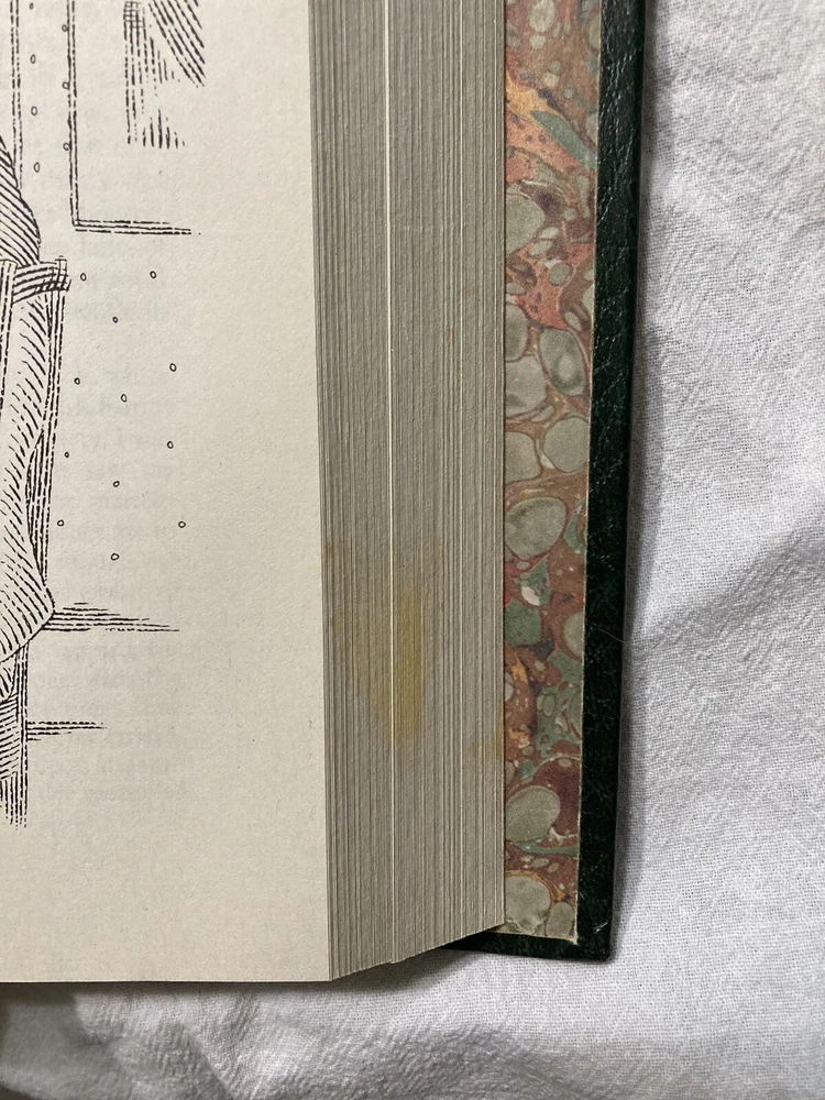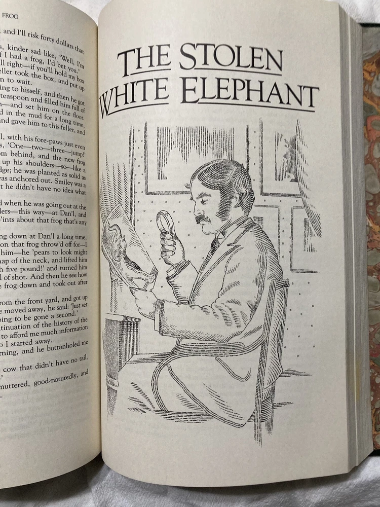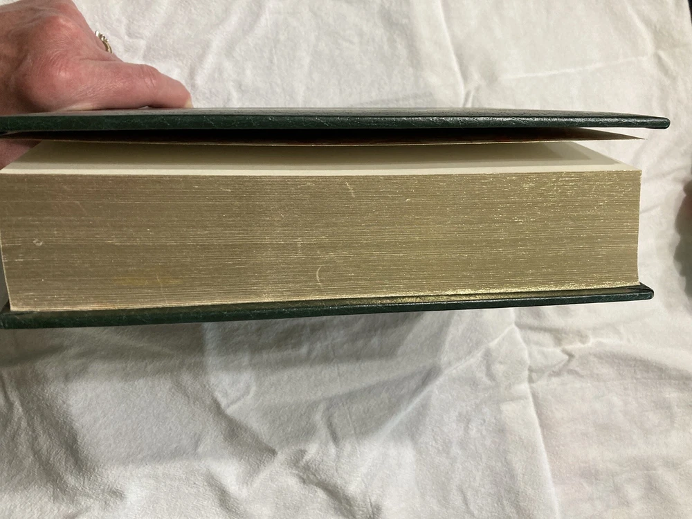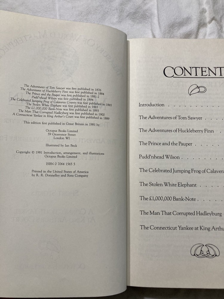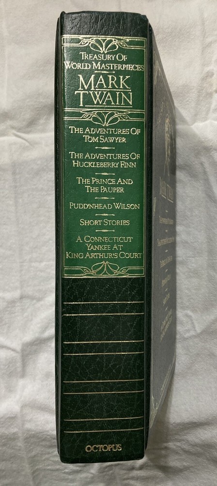 Treasury of World Masterpieces Mark Twain. The Adventures of Tom Sawyer, The Adventures of Huckleberry Finn, The Prince and the Pauper, Pudd'nhead Wilson, Short Stories, A Connecticut Yankee at King Arthur's Court. This beautiful book with it's gold leaf edges is in excellent condition. The binding is intact, the pages have no creases and no markings. I do not smell an odor. There is a slight stain on outer edge of pages, and sticker residue on the front cover. Please see photos.