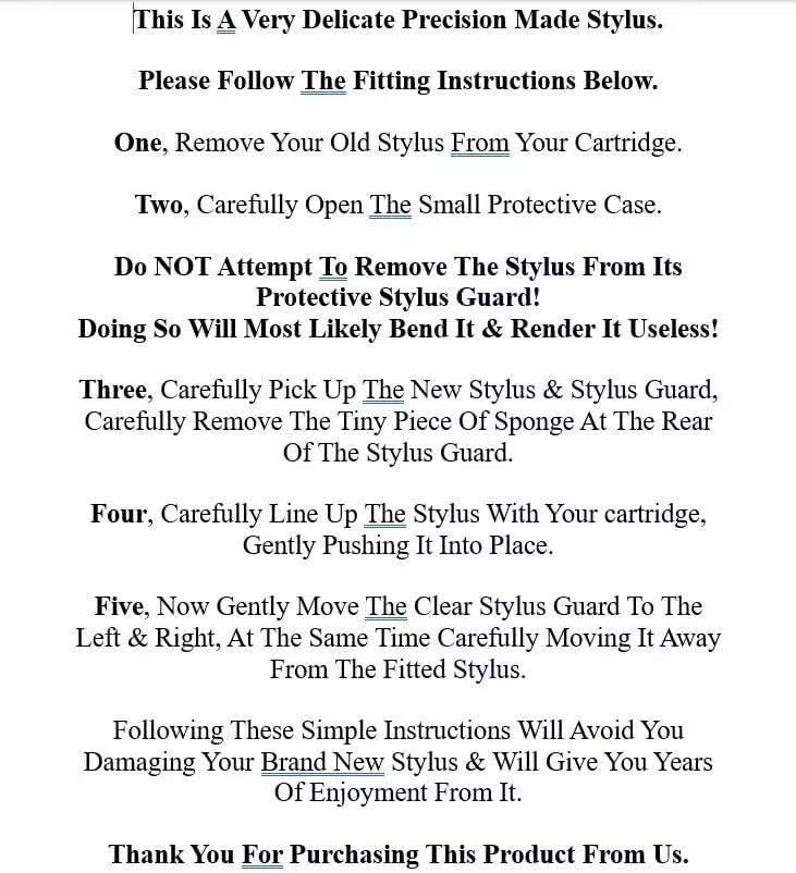 Generic Turntable Cartridge Replacement Stylus Vinyl Record Player Needle For AUDIO TECHNICA ATN3472P PL200 295T ATN3472 ATN3482 ATN-90CD ATN-91ECD LP Vinyl Phonograph Record Player Please note the difference of the Stylus and the Cartridge ) (PLEASE CHECK THIS IMAGE LOOKS THE SAME AS THE ONE YOU ARE REPLACING) Product Description Turntables that were fitted with this stylus include: For- ATN-90CD/ ATN-91ECD/ ATN-92ECD/ATN-101/ATN- 300/301/311/316/320/560/ ATN-3472P/ ATN-3482P/ ATN-3852P, ATN-ES1218/1252, Z100X, For-Akai RS33/35, For-Panasonic EPS-91, For-AKG RS 33 48. For-Teac N708 For-Hitachi DS-ST12/13, For-Pioneer PC250, PL 200 Z, For-Toshiba N-32 For-JVC DT-45, For-Kenwood N63, For-Sony ND-145, For-Technics EPS 34 CS For-Sansui SN313/515, For-Sanyo and for-Fisher ST-44J, ST-M11, For-Sharp STY-131 Tracking Force: 1.25 grams Welcome to your presence! PLEASE NOTE: Make sure the needle that you are buying looks exactly like the one you are replacing. If the cartridge has been changed, the references to model numbers would no longer be valid. Condition: New Included : Stylus (as pictured) Notes: Item will ship within 1 business day (Monday-Friday excluding holidays) of payment. This item is made to meet or exceed manufacturer specifications and is guaranteed to work/fit properly. How to replace a stylus Please note: Firstly lock the turntable tone arm, unscrew the cartridge, gently remove the stylus from the cartridge and insert a new stylus. A stylus is changed usually by pulling straight out and in the opposite direction of the turntable's arm. If the stylus doesn't come with directions, try these: with one hand, hold the cartridge to steady it. With the other hand, using a pair of tweezers, grasp the stylus from both sides and pull. Install the new stylus: holding the stylus from the top, press it gently into the space at the tip of the cartridge where the old stylus had been. Don't force it. Proper care comprises the following: Cleaning of record by means of carbon fibre brush before and after every use. Cleaning of record by using record cleaning machine once in a while. Cleaning of stylus by means of a fine antistatic brush. Please remember to remove dust from the diamond tip before and after playback of each record. Use the brush in the forward direction from the rear of the cartridge towards the stylus tip and never from stylus tip to the rear of the cartridge and never from side to side. Proper adjustment of antiskating, azimuth and tracking force. Spherical vs Ellpitical The physical difference between a spherical and elliptical stylus is the shape of the diamond. An elliptical diamond allows for more detailed sound quality, as it fits better within the groove and therefore has more contact area with the groove itself. Elliptical diamonds penetrate the groove walls further, extracting more intricate detail, especially in the high end, than is possible with a spherical diamond. It is commonly misrepresented that elliptical styli cause more wear than spherical styli. In fact, spherical styli , since they have a smaller contact area and more pressure, cause more immediate wear than elliptical styli, but in a smaller area of the groove itself. Elliptical styli, since they have more weight distribution amongst a larger contact area, will wear the groove slower, but will wear more of the groove over repeated backcueing. About us Payment Shipping Returns Please Note Please feel free contact us if any inquiry. Please don't leave us a negative/natural feedback or lower DSR score before you haven't contact us. We will do our best to solve it well with you if you has any problem. In order to save you time, please complete your payment within 15 days after bidding/buying. Please contact us if you had problem with payment. Thank you. We provide standard air mail and DHL/EMS express shipping. Express shipping(EMS, DHL UPS): 6-9 days to Worldwide(some remote areas will longer) We will ship item by EMS speed post, or UPS Ground, or DHL or other speed post, which ever is cheaper or easier to us. We will declare low value $20 to aviod taxes, it is your duty to pay taxes if there have. Thank you. Air Mail: 8-16 business days to USA/Canada/Australi/Asia.25-35 business days to Europe. 3 Month warranty for all motherboards. We always stand behind our product, if there is any quality problem with the article, please contact us within 5 days after receive, we allow item be return/exchange within 7 days after received, and there is no any handle fee for exchange. Otherwise, buyer need pay handle fee or shipping for reship. Contact US: Please feel free contact us if any inquiry. 1. Import duties,taxes and any other similar charges are not included in the item price or shipping charges. These charges are the buyer's responsibility. 2. Please check with your country's customs office to determine what these additional costs will be prior to purchase 3. We will declare low value $5 to aviod taxes, it is your duty to pay taxes if there have. Thank you. Customer is always NO.1 We care about our valued customers and understand the concerns and frustrations you might have, and will try our best to resolve the issues.. We strive to answer all emails as quickly as possible, but due to high email volume it may take time for us to reply. Thanks in advance for your patience! Contact us first before leaving a negative, we will find a solution to meet your requirement and enhance the satisfaction. Due to some ISP SPAM filter settings, you may not be able to receive our email replies; if you have problems receiving our emails, you may need to use a different email account to contact us. If you are unsatisfied with the item for any reason within 3 days of item receipt, you can return it for a refund(deducting the shippng). designed by