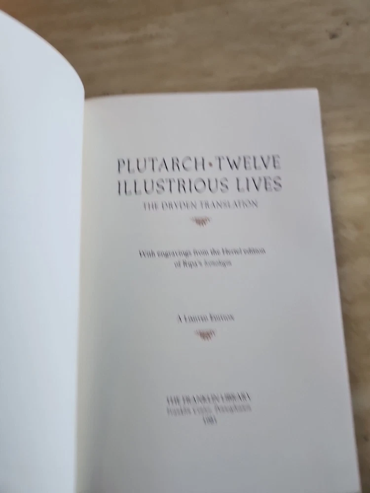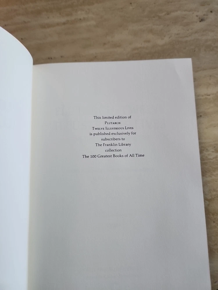 This limited edition book from the Franklin Library is a must-have for any collector of classic literature. With its beautiful leather binding and original print, this copy of Plutarch's "Twelve Illustrious Lives" is a true gem. The book is written in English and was published in 1981 in the United States. The author, Plutarch, is known for his detailed and engaging biographies, and this collection is no exception. The book covers a range of topics and includes special attributes that make it a unique addition to any bookshelf. Whether you are a fan of classic literature or simply looking for a rare and beautiful book, this limited edition copy of "Twelve Illustrious Lives" is sure to impress.