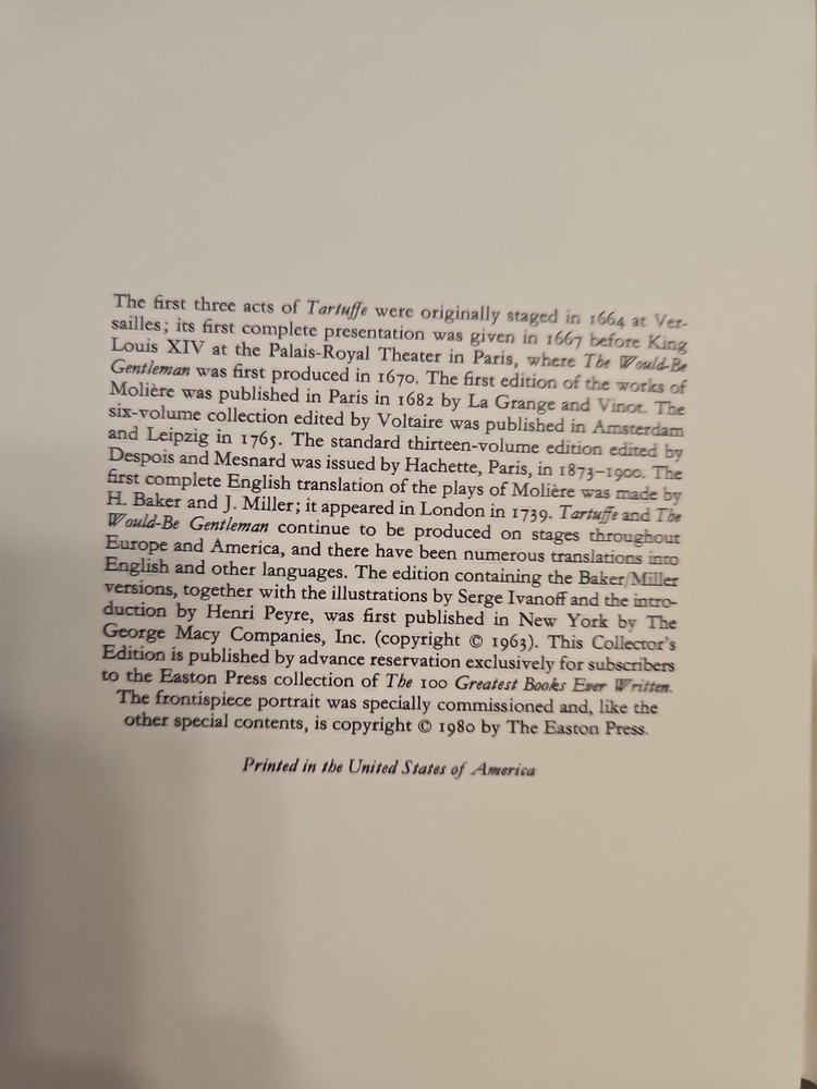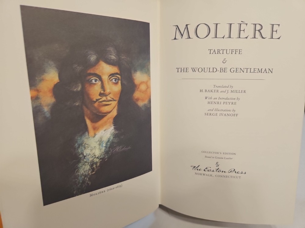 Delve into the world of classic literature with this beautiful leather-bound edition of two plays by Molière, presented by Easton Press as part of their 100 Greatest Series. The plays are thoughtfully translated into English, capturing the wit and sophistication that Molière is renowned for. Illustrated by Serge Ivanoff, the book adds a visual dimension to the reading experience, bringing the stories to life. Published in 1980 in the United States, this collection is a testament to Molière's enduring legacy and the craftsmanship of Easton Press. It's a perfect addition for collectors and literary enthusiasts alike, offering a slice of North American publishing history combined with the timeless charm of French drama. Easton Press Collectible leather-bound edition of Two Plays by Molière. Pages are in pristine condition, appears unread. Binding and covers are in excellent condition and have no noticeable defects/blemishes.