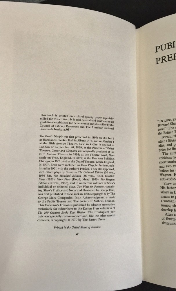 Two Plays for Puritan by George Bernard Shaw Easton Press 100 Greatest Books Two Plays for Puritan by George Bernard Shaw Easton Press 100 Greatest Books Two Plays for Puritan : The Devil's Disciple & Caesar and Cleopatra by George Bernard Shaw Part of the 100 GREATEST BOOKS collection of The Easton Press, Norwalk, Connecticut, 1979. This book is in excellent, unread condition. The Easton Press books are bound in genuine leather binding, with 22kt gold accents and hubbed spines, gilded page ends, acid-neutral paper, Moire fabric endsheets, and evocative illustrations and decorations. We will be happy to combine shipping, wherever possible. Some items cannot be combined because of their size, weight or because they are fragile. Please ask if you have any questions. Your order will ship by the next business day after receiving payment. All items are from a smoke-free environment. Thank you, and Happy Reading!