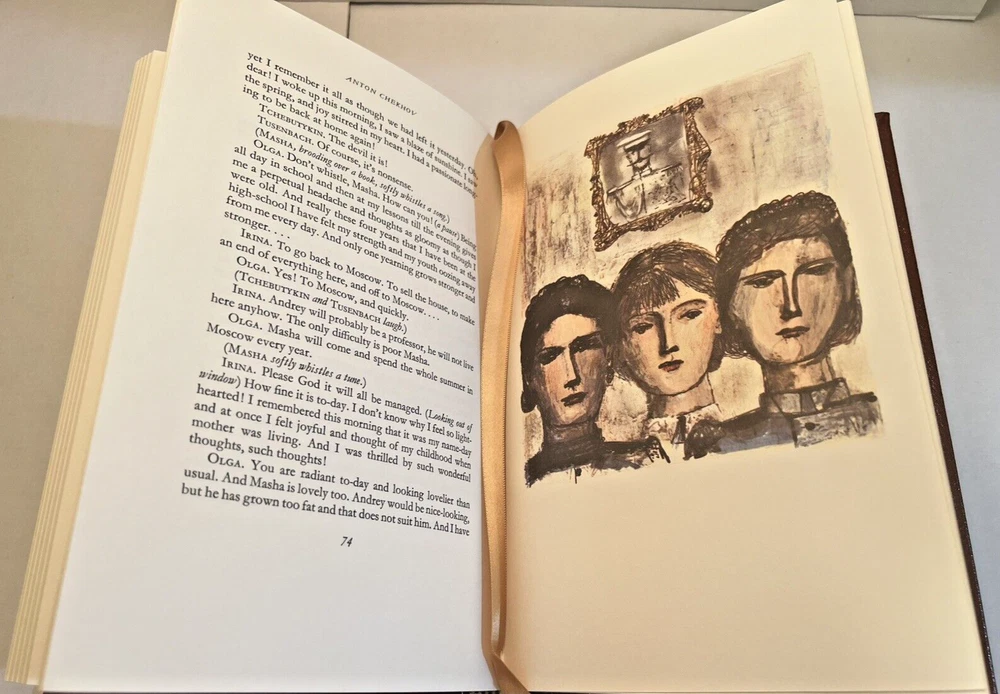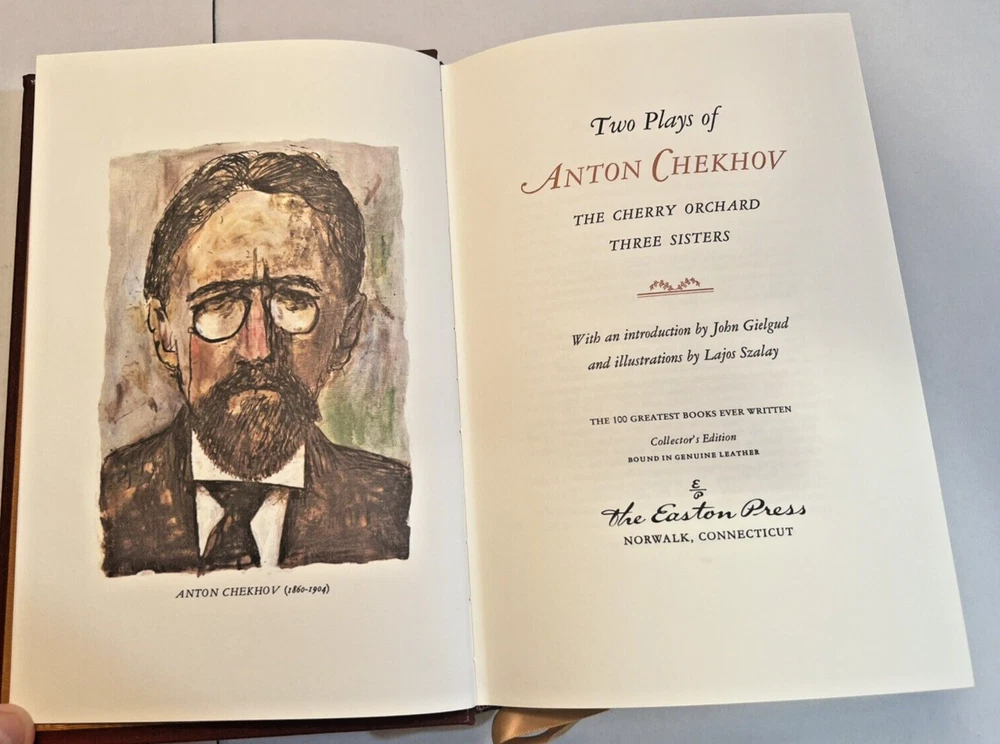 This book is a luxury edition of "Two Plays of Anton Chekhov" published by Easton Press, part of their 100 Greatest Books Ever Written collection. The book is an original printing from 1977 in English, featuring illustrations by Lajos Szalay. It is bound in leather and not signed, making it a collector's edition. The two plays by Anton Chekhov are the main focus of this book, which is a high-quality and beautifully crafted piece for literature enthusiasts. "THE CHERRY ORCHARD" and "THREE SISTERS"