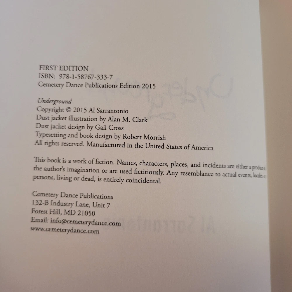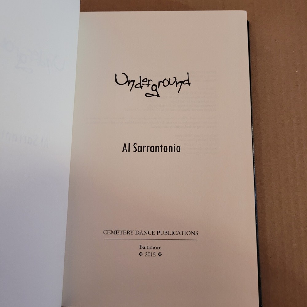 Deluxe Hardcover Lettered Edition of 52 signed and hand-lettered copies bound in leather, Smyth sewn with a satin ribbon page marker, raised hubs on the spine, custom gilded page edges dipped by hand, unique hot foil front cover stamping artwork, and full color endpapers not appearing in any other edition. This book is PC/52. About the Book: Al Sarrantonio's great lost novel! In 1992, after the success of Al Sarrantonio's apocalyptic novel Skeletons, Bantam Books was set to publish its follow-up, Underground. But then Bantam, almost overnight, did away with its entire horror line, and Underground went into oblivion. But now, finally, it's back! Fans of Al Sarrantonio's horror have been waiting 20 years for Underground to see print, and the time is almost here! Underground , a picaresque tale of, literally, a trip to Hell, with characters such as Dr. Foostis and Malice in Wonderland, is an amazing journey to the very center of the Earth. Told in the literary spirit of Skeletons , it's sure to astound and entertain. And it's the only unpublished novel ever by horror master Al Sarrantonio.