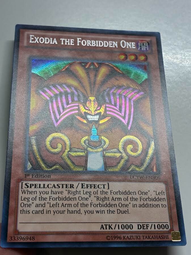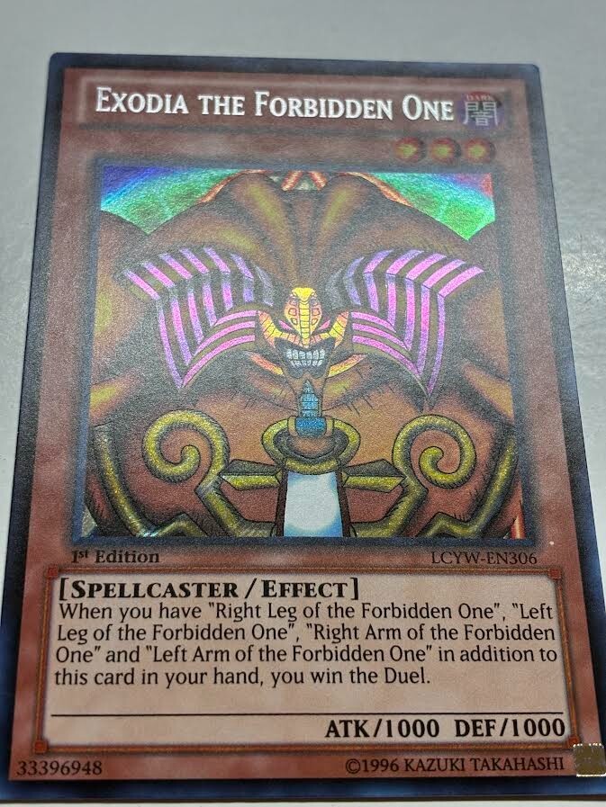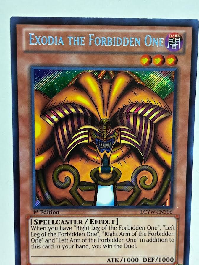 =====You are Getting===== USA Seller Yugioh Exodia The Forbidden One LCYW-EN306 Secret Rare 1st Ed NM =====Shipping===== We also do combined shipping for all the items you buy from us! We will do our best to ship all the items within 2 business days after payment is received and we will double check before we send. Please double check your address to prevent any unnecessary delay. ===Others=== Please contact us if there are any questions or problems. We will try our best to respond as fast as possible. Please leave us positive feedback and we will leave you feedback too once we receive feedback from you. If there are anything that you are not satisfied with your purchase, please do not hesitate to give us a message. We strive to make great communication with our buyers. Happy buying or bidding!! Thank You!!