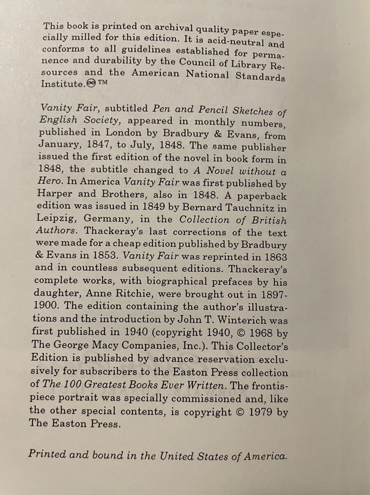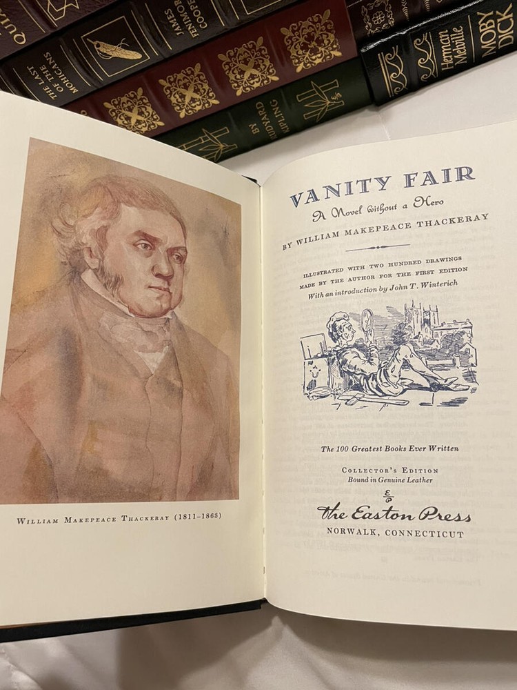 VANITY FAIR William Makepeace Thackeray Easton Press 1979 Hardcover Leather Ed 100 Greatest Books Vanity Fair by William Makepeace Thackeray Easton Press © 1979 From the 100 Greatest Books Ever Written Series Filled with satire and humor, Vanity Fair invites readers to ponder human strife and the damage inflicted by selfishness and egotism as told through the intertwined stories of two Victorian women. Collector's Edition Genuine Leather Bound Hardcover In Excellent to Mint Condition! Printed and bound in the United States I am helping liquidate an estate for a friend. Her husband was an avid collector of books. I have hundreds to list, many rare and hard to find books. Please check back often as I will be listing new ones every day. Feel free to ask if you are looking for anything in particular. I will be listing many Folio Society books as well as the entire collection from the 100 Greatest Books ever written by Easton Press. Please email me with any questions. I will respond back quickly. I describe item conditions to the best of my ability and will always point out any flaws or defects that I am aware of. I am an EBay Seller with 100% Positive Feedback! Thank you. Bid with Confidence! See my other listings for more great items! Because I have had a slew of non paying and very slow paying bidders lately I will require payment within 2 days of the end of auction. However, if you need a different arrangement I will be more than happy to work with you, just let me know. INTERNATIONAL BUYERS ARE RESPONSIBLE FOR ALL CUSTOMS CHARGES, PORT CHARGES OR ANY TAXES DUE UPON RECEIPT OF THEIR PACKAGE. All my shipping charges include delivery confirmation. International shipping will be at actual cost. Thank you for bidding on my auctions. Your business is very much appreciated! txzj pxzj7585 txzj-11 txzj111 txzj115