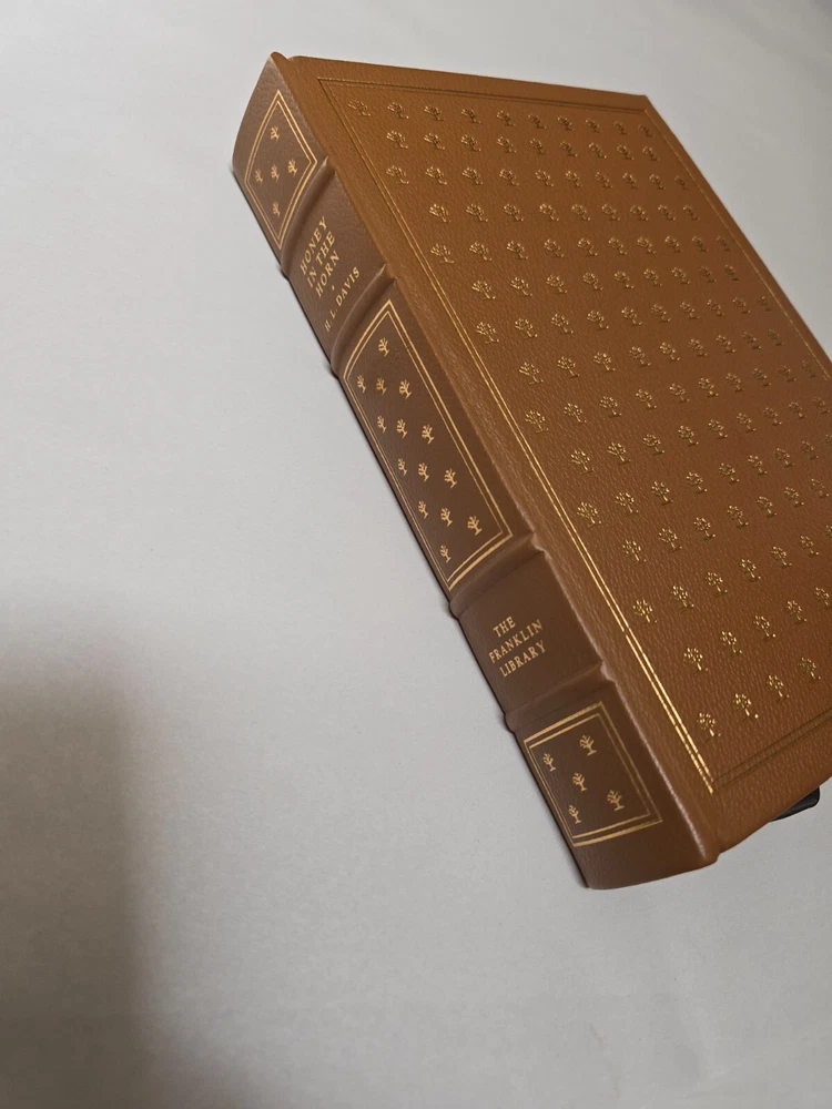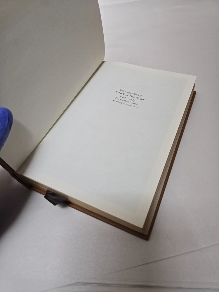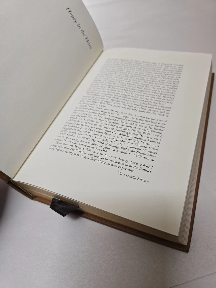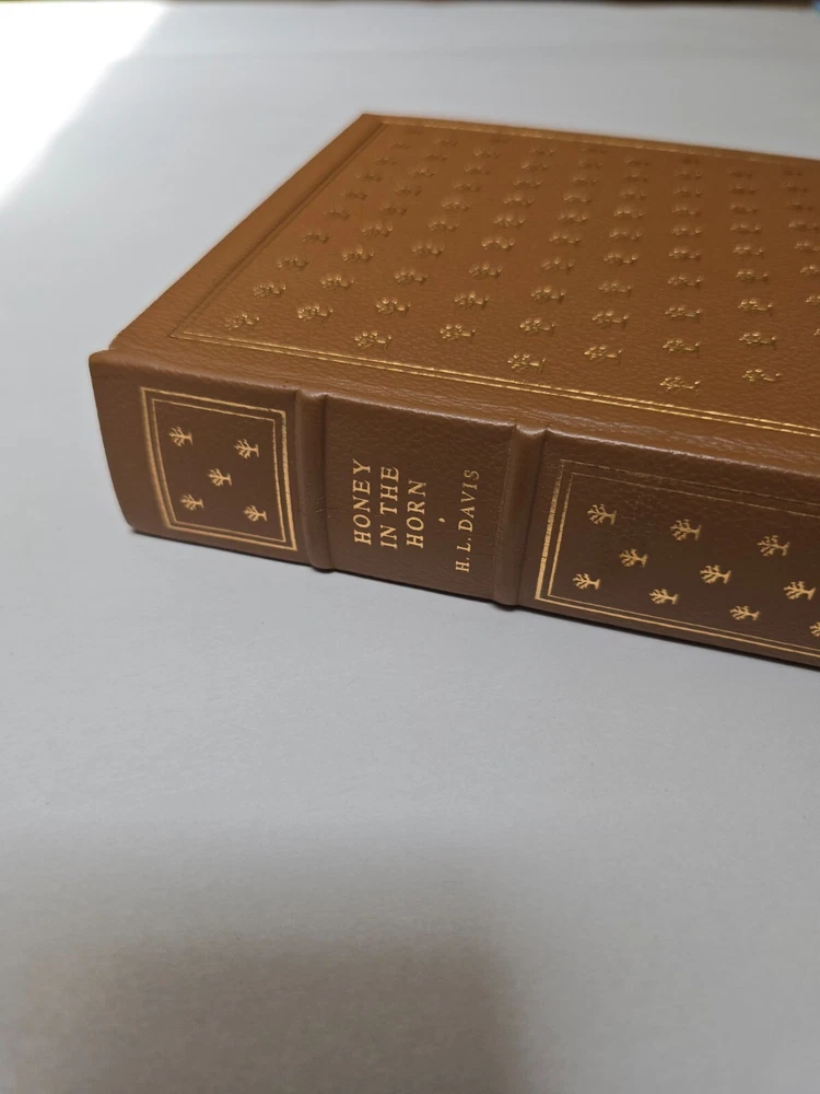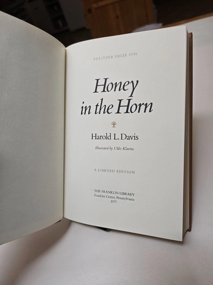 This is a limited edition collector's copy of "Honey in the Horn" by Harold L. Davis, published by Franklin Library in 1977. The book is bound in leather and features illustrations by Uldis Klavins. The book is a perfect addition to any collection of literature and fiction. "Very Fine" condition. This book has only been opened a few times and was preserved in storage since the time of its publication.